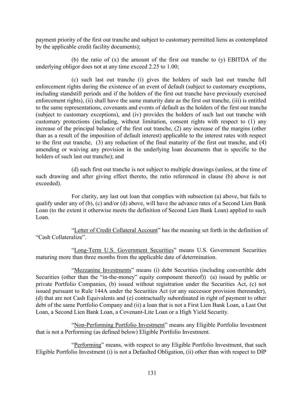 payment priority of the first out tranche and subject to customary permitted liens as contemplated by the applicable credit facility documents); (b) the ratio of (x) the amount of the first out tranche to (y) EBITDA of the underlying obligor does not at any time exceed 2.25 to 1.00; (c) such last out tranche (i) gives the holders of such last out tranche full enforcement rights during the existence of an event of default (subject to customary exceptions, including standstill periods and if the holders of the first out tranche have previously exercised enforcement rights), (ii) shall have the same maturity date as the first out tranche, (iii) is entitled to the same representations, covenants and events of default as the holders of the first out tranche (subject to customary exceptions), and (iv) provides the holders of such last out tranche with customary protections (including, without limitation, consent rights with respect to (1) any increase of the principal balance of the first out tranche, (2) any increase of the margins (other than as a result of the imposition of default interest) applicable to the interest rates with respect to the first out tranche, (3) any reduction of the final maturity of the first out tranche, and (4) amending or waiving any provision in the underlying loan documents that is specific to the holders of such last out tranche); and (d) such first out tranche is not subject to multiple drawings (unless, at the time of such drawing and after giving effect thereto, the ratio referenced in clause (b) above is not exceeded). For clarity, any last out loan that complies with subsection (a) above, but fails to qualify under any of (b), (c) and/or (d) above, will have the advance rates of a Second Lien Bank Loan (to the extent it otherwise meets the definition of Second Lien Bank Loan) applied to such Loan. “Letter of Credit Collateral Account” has the meaning set forth in the definition of “Cash Collateralize”. “Long-Term U.S. Government Securities” means U.S. Government Securities maturing more than three months from the applicable date of determination. “Mezzanine Investments” means (i) debt Securities (including convertible debt Securities (other than the “in-the-money” equity component thereof)) (a) issued by public or private Portfolio Companies, (b) issued without registration under the Securities Act, (c) not issued pursuant to Rule 144A under the Securities Act (or any successor provision thereunder), (d) that are not Cash Equivalents and (e) contractually subordinated in right of payment to other debt of the same Portfolio Company and (ii) a loan that is not a First Lien Bank Loan, a Last Out Loan, a Second Lien Bank Loan, a Covenant-Lite Loan or a High Yield Security. “Non-Performing Portfolio Investment” means any Eligible Portfolio Investment that is not a Performing (as defined below) Eligible Portfolio Investment. “Performing” means, with respect to any Eligible Portfolio Investment, that such Eligible Portfolio Investment (i) is not a Defaulted Obligation, (ii) other than with respect to DIP 131