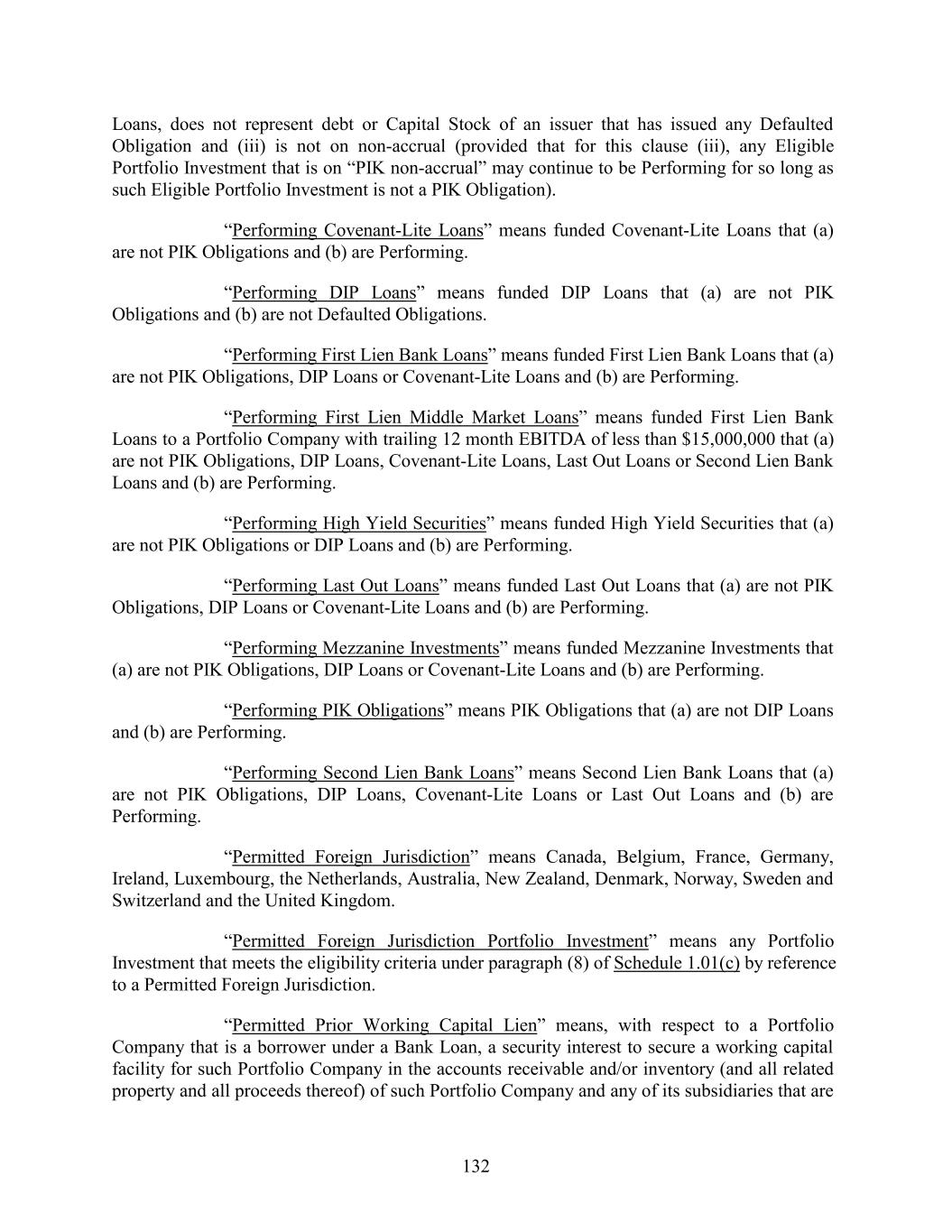 Loans, does not represent debt or Capital Stock of an issuer that has issued any Defaulted Obligation and (iii) is not on non-accrual (provided that for this clause (iii), any Eligible Portfolio Investment that is on “PIK non-accrual” may continue to be Performing for so long as such Eligible Portfolio Investment is not a PIK Obligation). “Performing Covenant-Lite Loans” means funded Covenant-Lite Loans that (a) are not PIK Obligations and (b) are Performing. “Performing DIP Loans” means funded DIP Loans that (a) are not PIK Obligations and (b) are not Defaulted Obligations. “Performing First Lien Bank Loans” means funded First Lien Bank Loans that (a) are not PIK Obligations, DIP Loans or Covenant-Lite Loans and (b) are Performing. “Performing First Lien Middle Market Loans” means funded First Lien Bank Loans to a Portfolio Company with trailing 12 month EBITDA of less than $15,000,000 that (a) are not PIK Obligations, DIP Loans, Covenant-Lite Loans, Last Out Loans or Second Lien Bank Loans and (b) are Performing. “Performing High Yield Securities” means funded High Yield Securities that (a) are not PIK Obligations or DIP Loans and (b) are Performing. “Performing Last Out Loans” means funded Last Out Loans that (a) are not PIK Obligations, DIP Loans or Covenant-Lite Loans and (b) are Performing. “Performing Mezzanine Investments” means funded Mezzanine Investments that (a) are not PIK Obligations, DIP Loans or Covenant-Lite Loans and (b) are Performing. “Performing PIK Obligations” means PIK Obligations that (a) are not DIP Loans and (b) are Performing. “Performing Second Lien Bank Loans” means Second Lien Bank Loans that (a) are not PIK Obligations, DIP Loans, Covenant-Lite Loans or Last Out Loans and (b) are Performing. “Permitted Foreign Jurisdiction” means Canada, Belgium, France, Germany, Ireland, Luxembourg, the Netherlands, Australia, New Zealand, Denmark, Norway, Sweden and Switzerland and the United Kingdom. “Permitted Foreign Jurisdiction Portfolio Investment” means any Portfolio Investment that meets the eligibility criteria under paragraph (8) of Schedule 1.01(c) by reference to a Permitted Foreign Jurisdiction. “Permitted Prior Working Capital Lien” means, with respect to a Portfolio Company that is a borrower under a Bank Loan, a security interest to secure a working capital facility for such Portfolio Company in the accounts receivable and/or inventory (and all related property and all proceeds thereof) of such Portfolio Company and any of its subsidiaries that are 132