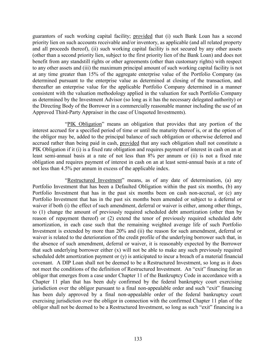 guarantors of such working capital facility; provided that (i) such Bank Loan has a second priority lien on such accounts receivable and/or inventory, as applicable (and all related property and all proceeds thereof), (ii) such working capital facility is not secured by any other assets (other than a second priority lien, subject to the first priority lien of the Bank Loan) and does not benefit from any standstill rights or other agreements (other than customary rights) with respect to any other assets and (iii) the maximum principal amount of such working capital facility is not at any time greater than 15% of the aggregate enterprise value of the Portfolio Company (as determined pursuant to the enterprise value as determined at closing of the transaction, and thereafter an enterprise value for the applicable Portfolio Company determined in a manner consistent with the valuation methodology applied in the valuation for such Portfolio Company as determined by the Investment Advisor (so long as it has the necessary delegated authority) or the Directing Body of the Borrower in a commercially reasonable manner including the use of an Approved Third-Party Appraiser in the case of Unquoted Investments). “PIK Obligation” means an obligation that provides that any portion of the interest accrued for a specified period of time or until the maturity thereof is, or at the option of the obligor may be, added to the principal balance of such obligation or otherwise deferred and accrued rather than being paid in cash, provided that any such obligation shall not constitute a PIK Obligation if it (i) is a fixed rate obligation and requires payment of interest in cash on an at least semi-annual basis at a rate of not less than 8% per annum or (ii) is not a fixed rate obligation and requires payment of interest in cash on an at least semi-annual basis at a rate of not less than 4.5% per annum in excess of the applicable index. “Restructured Investment” means, as of any date of determination, (a) any Portfolio Investment that has been a Defaulted Obligation within the past six months, (b) any Portfolio Investment that has in the past six months been on cash non-accrual, or (c) any Portfolio Investment that has in the past six months been amended or subject to a deferral or waiver if both (i) the effect of such amendment, deferral or waiver is either, among other things, to (1) change the amount of previously required scheduled debt amortization (other than by reason of repayment thereof) or (2) extend the tenor of previously required scheduled debt amortization, in each case such that the remaining weighted average life of such Portfolio Investment is extended by more than 20% and (ii) the reason for such amendment, deferral or waiver is related to the deterioration of the credit profile of the underlying borrower such that, in the absence of such amendment, deferral or waiver, it is reasonably expected by the Borrower that such underlying borrower either (x) will not be able to make any such previously required scheduled debt amortization payment or (y) is anticipated to incur a breach of a material financial covenant. A DIP Loan shall not be deemed to be a Restructured Investment, so long as it does not meet the conditions of the definition of Restructured Investment. An “exit” financing for an obligor that emerges from a case under Chapter 11 of the Bankruptcy Code in accordance with a Chapter 11 plan that has been duly confirmed by the federal bankruptcy court exercising jurisdiction over the obligor pursuant to a final non-appealable order and such “exit” financing has been duly approved by a final non-appealable order of the federal bankruptcy court exercising jurisdiction over the obligor in connection with the confirmed Chapter 11 plan of the obligor shall not be deemed to be a Restructured Investment, so long as such “exit” financing is a 133