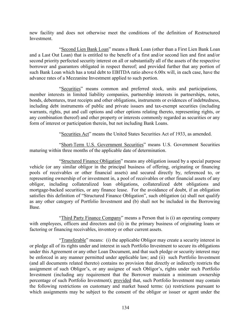 new facility and does not otherwise meet the conditions of the definition of Restructured Investment. “Second Lien Bank Loan” means a Bank Loan (other than a First Lien Bank Loan and a Last Out Loan) that is entitled to the benefit of a first and/or second lien and first and/or second priority perfected security interest on all or substantially all of the assets of the respective borrower and guarantors obligated in respect thereof; and provided further that any portion of such Bank Loan which has a total debt to EBITDA ratio above 6.00x will, in each case, have the advance rates of a Mezzanine Investment applied to such portion. “Securities” means common and preferred stock, units and participations, member interests in limited liability companies, partnership interests in partnerships, notes, bonds, debentures, trust receipts and other obligations, instruments or evidences of indebtedness, including debt instruments of public and private issuers and tax-exempt securities (including warrants, rights, put and call options and other options relating thereto, representing rights, or any combination thereof) and other property or interests commonly regarded as securities or any form of interest or participation therein, but not including Bank Loans. “Securities Act” means the United States Securities Act of 1933, as amended. “Short-Term U.S. Government Securities” means U.S. Government Securities maturing within three months of the applicable date of determination. “Structured Finance Obligation” means any obligation issued by a special purpose vehicle (or any similar obligor in the principal business of offering, originating or financing pools of receivables or other financial assets) and secured directly by, referenced to, or representing ownership of or investment in, a pool of receivables or other financial assets of any obligor, including collateralized loan obligations, collateralized debt obligations and mortgage-backed securities, or any finance lease. For the avoidance of doubt, if an obligation satisfies this definition of “Structured Finance Obligation”, such obligation (a) shall not qualify as any other category of Portfolio Investment and (b) shall not be included in the Borrowing Base. “Third Party Finance Company” means a Person that is (i) an operating company with employees, officers and directors and (ii) in the primary business of originating loans or factoring or financing receivables, inventory or other current assets. “Transferable” means: (i) the applicable Obligor may create a security interest in or pledge all of its rights under and interest in such Portfolio Investment to secure its obligations under this Agreement or any other Loan Document, and that such pledge or security interest may be enforced in any manner permitted under applicable law; and (ii) such Portfolio Investment (and all documents related thereto) contains no provision that directly or indirectly restricts the assignment of such Obligor’s, or any assignee of such Obligor’s, rights under such Portfolio Investment (including any requirement that the Borrower maintain a minimum ownership percentage of such Portfolio Investment); provided that, such Portfolio Investment may contain the following restrictions on customary and market based terms: (a) restrictions pursuant to which assignments may be subject to the consent of the obligor or issuer or agent under the 134
