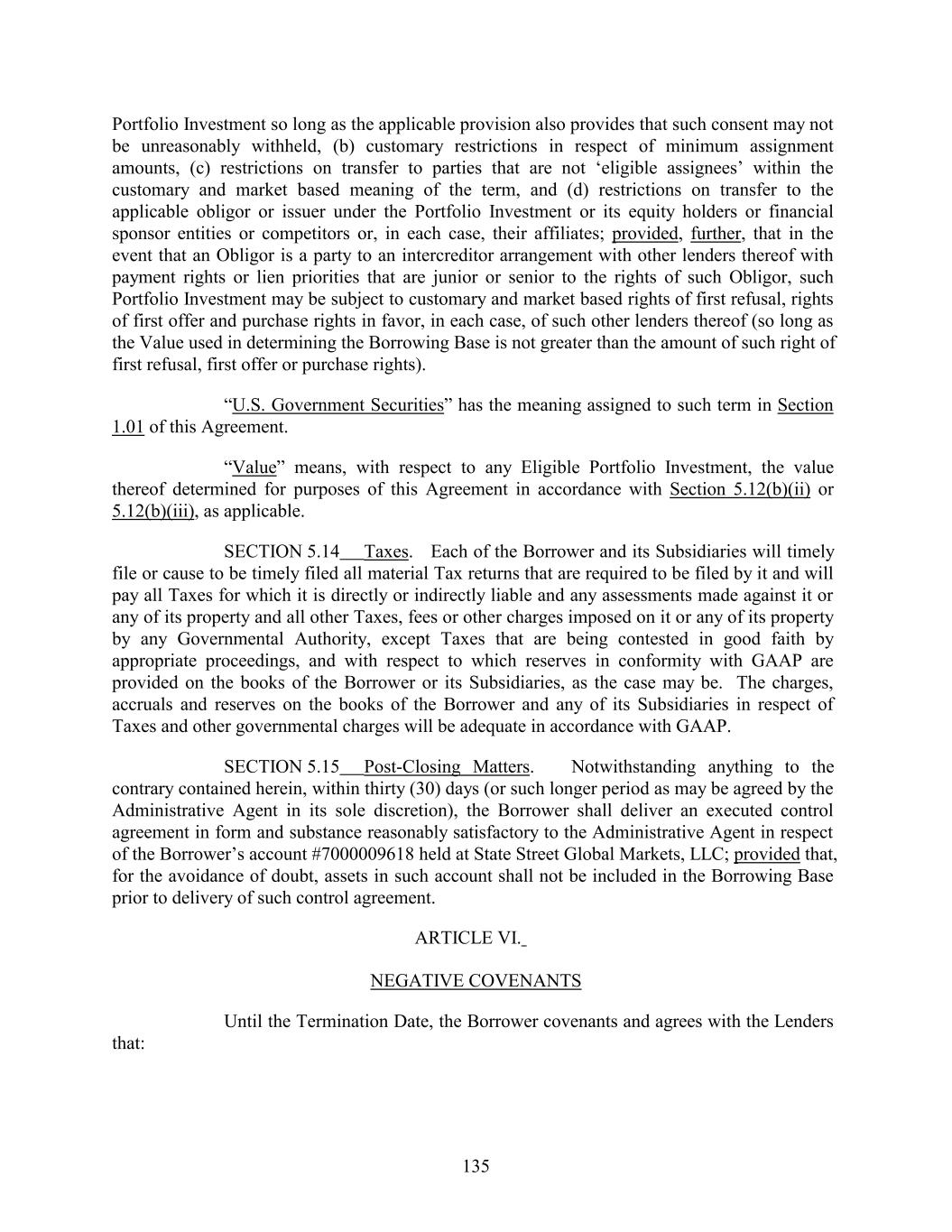 Portfolio Investment so long as the applicable provision also provides that such consent may not be unreasonably withheld, (b) customary restrictions in respect of minimum assignment amounts, (c) restrictions on transfer to parties that are not ‘eligible assignees’ within the customary and market based meaning of the term, and (d) restrictions on transfer to the applicable obligor or issuer under the Portfolio Investment or its equity holders or financial sponsor entities or competitors or, in each case, their affiliates; provided, further, that in the event that an Obligor is a party to an intercreditor arrangement with other lenders thereof with payment rights or lien priorities that are junior or senior to the rights of such Obligor, such Portfolio Investment may be subject to customary and market based rights of first refusal, rights of first offer and purchase rights in favor, in each case, of such other lenders thereof (so long as the Value used in determining the Borrowing Base is not greater than the amount of such right of first refusal, first offer or purchase rights). “U.S. Government Securities” has the meaning assigned to such term in Section 1.01 of this Agreement. “Value” means, with respect to any Eligible Portfolio Investment, the value thereof determined for purposes of this Agreement in accordance with Section 5.12(b)(ii) or 5.12(b)(iii), as applicable. SECTION 5.14 Taxes. Each of the Borrower and its Subsidiaries will timely file or cause to be timely filed all material Tax returns that are required to be filed by it and will pay all Taxes for which it is directly or indirectly liable and any assessments made against it or any of its property and all other Taxes, fees or other charges imposed on it or any of its property by any Governmental Authority, except Taxes that are being contested in good faith by appropriate proceedings, and with respect to which reserves in conformity with GAAP are provided on the books of the Borrower or its Subsidiaries, as the case may be. The charges, accruals and reserves on the books of the Borrower and any of its Subsidiaries in respect of Taxes and other governmental charges will be adequate in accordance with GAAP. SECTION 5.15 Post-Closing Matters. Notwithstanding anything to the contrary contained herein, within thirty (30) days (or such longer period as may be agreed by the Administrative Agent in its sole discretion), the Borrower shall deliver an executed control agreement in form and substance reasonably satisfactory to the Administrative Agent in respect of the Borrower’s account #7000009618 held at State Street Global Markets, LLC; provided that, for the avoidance of doubt, assets in such account shall not be included in the Borrowing Base prior to delivery of such control agreement. ARTICLE VI. NEGATIVE COVENANTS Until the Termination Date, the Borrower covenants and agrees with the Lenders that: 135