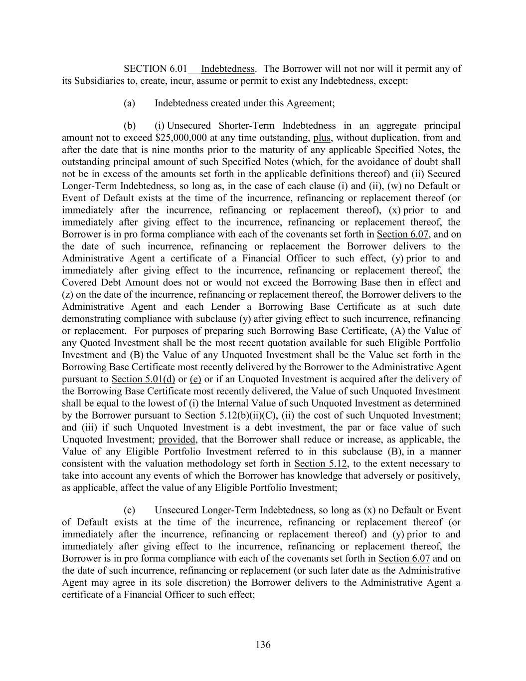 SECTION 6.01 Indebtedness. The Borrower will not nor will it permit any of its Subsidiaries to, create, incur, assume or permit to exist any Indebtedness, except: (a) Indebtedness created under this Agreement; (b) (i) Unsecured Shorter-Term Indebtedness in an aggregate principal amount not to exceed $25,000,000 at any time outstanding, plus, without duplication, from and after the date that is nine months prior to the maturity of any applicable Specified Notes, the outstanding principal amount of such Specified Notes (which, for the avoidance of doubt shall not be in excess of the amounts set forth in the applicable definitions thereof) and (ii) Secured Longer-Term Indebtedness, so long as, in the case of each clause (i) and (ii), (w) no Default or Event of Default exists at the time of the incurrence, refinancing or replacement thereof (or immediately after the incurrence, refinancing or replacement thereof), (x) prior to and immediately after giving effect to the incurrence, refinancing or replacement thereof, the Borrower is in pro forma compliance with each of the covenants set forth in Section 6.07, and on the date of such incurrence, refinancing or replacement the Borrower delivers to the Administrative Agent a certificate of a Financial Officer to such effect, (y) prior to and immediately after giving effect to the incurrence, refinancing or replacement thereof, the Covered Debt Amount does not or would not exceed the Borrowing Base then in effect and (z) on the date of the incurrence, refinancing or replacement thereof, the Borrower delivers to the Administrative Agent and each Lender a Borrowing Base Certificate as at such date demonstrating compliance with subclause (y) after giving effect to such incurrence, refinancing or replacement. For purposes of preparing such Borrowing Base Certificate, (A) the Value of any Quoted Investment shall be the most recent quotation available for such Eligible Portfolio Investment and (B) the Value of any Unquoted Investment shall be the Value set forth in the Borrowing Base Certificate most recently delivered by the Borrower to the Administrative Agent pursuant to Section 5.01(d) or (e) or if an Unquoted Investment is acquired after the delivery of the Borrowing Base Certificate most recently delivered, the Value of such Unquoted Investment shall be equal to the lowest of (i) the Internal Value of such Unquoted Investment as determined by the Borrower pursuant to Section 5.12(b)(ii)(C), (ii) the cost of such Unquoted Investment; and (iii) if such Unquoted Investment is a debt investment, the par or face value of such Unquoted Investment; provided, that the Borrower shall reduce or increase, as applicable, the Value of any Eligible Portfolio Investment referred to in this subclause (B), in a manner consistent with the valuation methodology set forth in Section 5.12, to the extent necessary to take into account any events of which the Borrower has knowledge that adversely or positively, as applicable, affect the value of any Eligible Portfolio Investment; (c) Unsecured Longer-Term Indebtedness, so long as (x) no Default or Event of Default exists at the time of the incurrence, refinancing or replacement thereof (or immediately after the incurrence, refinancing or replacement thereof) and (y) prior to and immediately after giving effect to the incurrence, refinancing or replacement thereof, the Borrower is in pro forma compliance with each of the covenants set forth in Section 6.07 and on the date of such incurrence, refinancing or replacement (or such later date as the Administrative Agent may agree in its sole discretion) the Borrower delivers to the Administrative Agent a certificate of a Financial Officer to such effect; 136