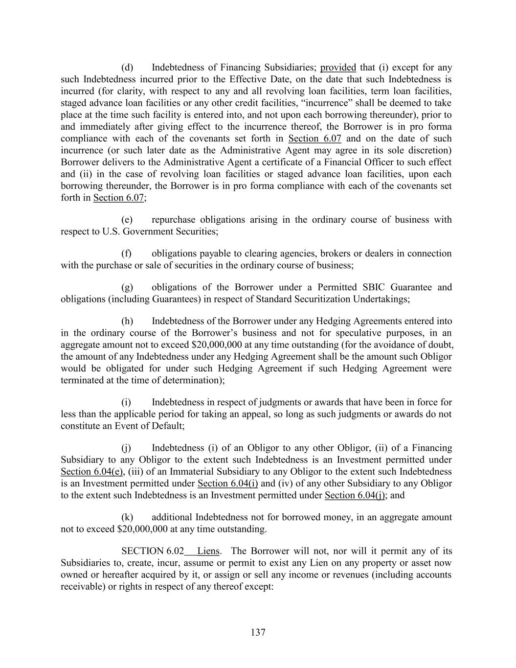 (d) Indebtedness of Financing Subsidiaries; provided that (i) except for any such Indebtedness incurred prior to the Effective Date, on the date that such Indebtedness is incurred (for clarity, with respect to any and all revolving loan facilities, term loan facilities, staged advance loan facilities or any other credit facilities, “incurrence” shall be deemed to take place at the time such facility is entered into, and not upon each borrowing thereunder), prior to and immediately after giving effect to the incurrence thereof, the Borrower is in pro forma compliance with each of the covenants set forth in Section 6.07 and on the date of such incurrence (or such later date as the Administrative Agent may agree in its sole discretion) Borrower delivers to the Administrative Agent a certificate of a Financial Officer to such effect and (ii) in the case of revolving loan facilities or staged advance loan facilities, upon each borrowing thereunder, the Borrower is in pro forma compliance with each of the covenants set forth in Section 6.07; (e) repurchase obligations arising in the ordinary course of business with respect to U.S. Government Securities; (f) obligations payable to clearing agencies, brokers or dealers in connection with the purchase or sale of securities in the ordinary course of business; (g) obligations of the Borrower under a Permitted SBIC Guarantee and obligations (including Guarantees) in respect of Standard Securitization Undertakings; (h) Indebtedness of the Borrower under any Hedging Agreements entered into in the ordinary course of the Borrower’s business and not for speculative purposes, in an aggregate amount not to exceed $20,000,000 at any time outstanding (for the avoidance of doubt, the amount of any Indebtedness under any Hedging Agreement shall be the amount such Obligor would be obligated for under such Hedging Agreement if such Hedging Agreement were terminated at the time of determination); (i) Indebtedness in respect of judgments or awards that have been in force for less than the applicable period for taking an appeal, so long as such judgments or awards do not constitute an Event of Default; (j) Indebtedness (i) of an Obligor to any other Obligor, (ii) of a Financing Subsidiary to any Obligor to the extent such Indebtedness is an Investment permitted under Section 6.04(e), (iii) of an Immaterial Subsidiary to any Obligor to the extent such Indebtedness is an Investment permitted under Section 6.04(i) and (iv) of any other Subsidiary to any Obligor to the extent such Indebtedness is an Investment permitted under Section 6.04(j); and (k) additional Indebtedness not for borrowed money, in an aggregate amount not to exceed $20,000,000 at any time outstanding. SECTION 6.02 Liens. The Borrower will not, nor will it permit any of its Subsidiaries to, create, incur, assume or permit to exist any Lien on any property or asset now owned or hereafter acquired by it, or assign or sell any income or revenues (including accounts receivable) or rights in respect of any thereof except: 137