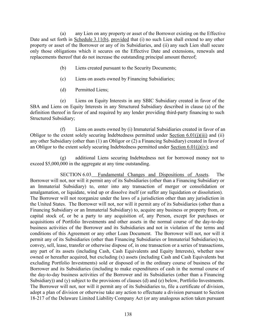 (a) any Lien on any property or asset of the Borrower existing on the Effective Date and set forth in Schedule 3.11(b), provided that (i) no such Lien shall extend to any other property or asset of the Borrower or any of its Subsidiaries, and (ii) any such Lien shall secure only those obligations which it secures on the Effective Date and extensions, renewals and replacements thereof that do not increase the outstanding principal amount thereof; (b) Liens created pursuant to the Security Documents; (c) Liens on assets owned by Financing Subsidiaries; (d) Permitted Liens; (e) Liens on Equity Interests in any SBIC Subsidiary created in favor of the SBA and Liens on Equity Interests in any Structured Subsidiary described in clause (a) of the definition thereof in favor of and required by any lender providing third-party financing to such Structured Subsidiary; (f) Liens on assets owned by (i) Immaterial Subsidiaries created in favor of an Obligor to the extent solely securing Indebtedness permitted under Section 6.01(j)(iii) and (ii) any other Subsidiary (other than (1) an Obligor or (2) a Financing Subsidiary) created in favor of an Obligor to the extent solely securing Indebtedness permitted under Section 6.01(j)(iv); and (g) additional Liens securing Indebtedness not for borrowed money not to exceed $5,000,000 in the aggregate at any time outstanding. SECTION 6.03 Fundamental Changes and Dispositions of Assets. The Borrower will not, nor will it permit any of its Subsidiaries (other than a Financing Subsidiary or an Immaterial Subsidiary) to, enter into any transaction of merger or consolidation or amalgamation, or liquidate, wind up or dissolve itself (or suffer any liquidation or dissolution). The Borrower will not reorganize under the laws of a jurisdiction other than any jurisdiction in the United States. The Borrower will not, nor will it permit any of its Subsidiaries (other than a Financing Subsidiary or an Immaterial Subsidiary) to, acquire any business or property from, or capital stock of, or be a party to any acquisition of, any Person, except for purchases or acquisitions of Portfolio Investments and other assets in the normal course of the day-to-day business activities of the Borrower and its Subsidiaries and not in violation of the terms and conditions of this Agreement or any other Loan Document. The Borrower will not, nor will it permit any of its Subsidiaries (other than Financing Subsidiaries or Immaterial Subsidiaries) to, convey, sell, lease, transfer or otherwise dispose of, in one transaction or a series of transactions, any part of its assets (including Cash, Cash Equivalents and Equity Interests), whether now owned or hereafter acquired, but excluding (x) assets (including Cash and Cash Equivalents but excluding Portfolio Investments) sold or disposed of in the ordinary course of business of the Borrower and its Subsidiaries (including to make expenditures of cash in the normal course of the day-to-day business activities of the Borrower and its Subsidiaries (other than a Financing Subsidiary)) and (y) subject to the provisions of clauses (d) and (e) below, Portfolio Investments. The Borrower will not, nor will it permit any of its Subsidiaries to, file a certificate of division, adopt a plan of division or otherwise take any action to effectuate a division pursuant to Section 18-217 of the Delaware Limited Liability Company Act (or any analogous action taken pursuant 138