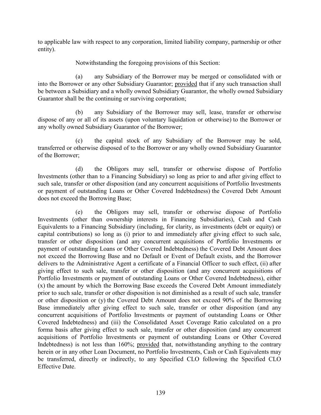 to applicable law with respect to any corporation, limited liability company, partnership or other entity). Notwithstanding the foregoing provisions of this Section: (a) any Subsidiary of the Borrower may be merged or consolidated with or into the Borrower or any other Subsidiary Guarantor; provided that if any such transaction shall be between a Subsidiary and a wholly owned Subsidiary Guarantor, the wholly owned Subsidiary Guarantor shall be the continuing or surviving corporation; (b) any Subsidiary of the Borrower may sell, lease, transfer or otherwise dispose of any or all of its assets (upon voluntary liquidation or otherwise) to the Borrower or any wholly owned Subsidiary Guarantor of the Borrower; (c) the capital stock of any Subsidiary of the Borrower may be sold, transferred or otherwise disposed of to the Borrower or any wholly owned Subsidiary Guarantor of the Borrower; (d) the Obligors may sell, transfer or otherwise dispose of Portfolio Investments (other than to a Financing Subsidiary) so long as prior to and after giving effect to such sale, transfer or other disposition (and any concurrent acquisitions of Portfolio Investments or payment of outstanding Loans or Other Covered Indebtedness) the Covered Debt Amount does not exceed the Borrowing Base; (e) the Obligors may sell, transfer or otherwise dispose of Portfolio Investments (other than ownership interests in Financing Subsidiaries), Cash and Cash Equivalents to a Financing Subsidiary (including, for clarity, as investments (debt or equity) or capital contributions) so long as (i) prior to and immediately after giving effect to such sale, transfer or other disposition (and any concurrent acquisitions of Portfolio Investments or payment of outstanding Loans or Other Covered Indebtedness) the Covered Debt Amount does not exceed the Borrowing Base and no Default or Event of Default exists, and the Borrower delivers to the Administrative Agent a certificate of a Financial Officer to such effect, (ii) after giving effect to such sale, transfer or other disposition (and any concurrent acquisitions of Portfolio Investments or payment of outstanding Loans or Other Covered Indebtedness), either (x) the amount by which the Borrowing Base exceeds the Covered Debt Amount immediately prior to such sale, transfer or other disposition is not diminished as a result of such sale, transfer or other disposition or (y) the Covered Debt Amount does not exceed 90% of the Borrowing Base immediately after giving effect to such sale, transfer or other disposition (and any concurrent acquisitions of Portfolio Investments or payment of outstanding Loans or Other Covered Indebtedness) and (iii) the Consolidated Asset Coverage Ratio calculated on a pro forma basis after giving effect to such sale, transfer or other disposition (and any concurrent acquisitions of Portfolio Investments or payment of outstanding Loans or Other Covered Indebtedness) is not less than 160%; provided that, notwithstanding anything to the contrary herein or in any other Loan Document, no Portfolio Investments, Cash or Cash Equivalents may be transferred, directly or indirectly, to any Specified CLO following the Specified CLO Effective Date. 139