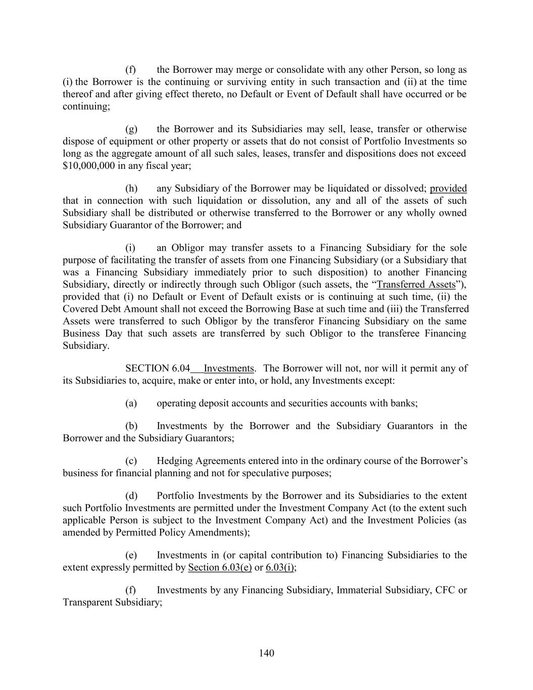(f) the Borrower may merge or consolidate with any other Person, so long as (i) the Borrower is the continuing or surviving entity in such transaction and (ii) at the time thereof and after giving effect thereto, no Default or Event of Default shall have occurred or be continuing; (g) the Borrower and its Subsidiaries may sell, lease, transfer or otherwise dispose of equipment or other property or assets that do not consist of Portfolio Investments so long as the aggregate amount of all such sales, leases, transfer and dispositions does not exceed $10,000,000 in any fiscal year; (h) any Subsidiary of the Borrower may be liquidated or dissolved; provided that in connection with such liquidation or dissolution, any and all of the assets of such Subsidiary shall be distributed or otherwise transferred to the Borrower or any wholly owned Subsidiary Guarantor of the Borrower; and (i) an Obligor may transfer assets to a Financing Subsidiary for the sole purpose of facilitating the transfer of assets from one Financing Subsidiary (or a Subsidiary that was a Financing Subsidiary immediately prior to such disposition) to another Financing Subsidiary, directly or indirectly through such Obligor (such assets, the “Transferred Assets”), provided that (i) no Default or Event of Default exists or is continuing at such time, (ii) the Covered Debt Amount shall not exceed the Borrowing Base at such time and (iii) the Transferred Assets were transferred to such Obligor by the transferor Financing Subsidiary on the same Business Day that such assets are transferred by such Obligor to the transferee Financing Subsidiary. SECTION 6.04 Investments. The Borrower will not, nor will it permit any of its Subsidiaries to, acquire, make or enter into, or hold, any Investments except: (a) operating deposit accounts and securities accounts with banks; (b) Investments by the Borrower and the Subsidiary Guarantors in the Borrower and the Subsidiary Guarantors; (c) Hedging Agreements entered into in the ordinary course of the Borrower’s business for financial planning and not for speculative purposes; (d) Portfolio Investments by the Borrower and its Subsidiaries to the extent such Portfolio Investments are permitted under the Investment Company Act (to the extent such applicable Person is subject to the Investment Company Act) and the Investment Policies (as amended by Permitted Policy Amendments); (e) Investments in (or capital contribution to) Financing Subsidiaries to the extent expressly permitted by Section 6.03(e) or 6.03(i); (f) Investments by any Financing Subsidiary, Immaterial Subsidiary, CFC or Transparent Subsidiary; 140