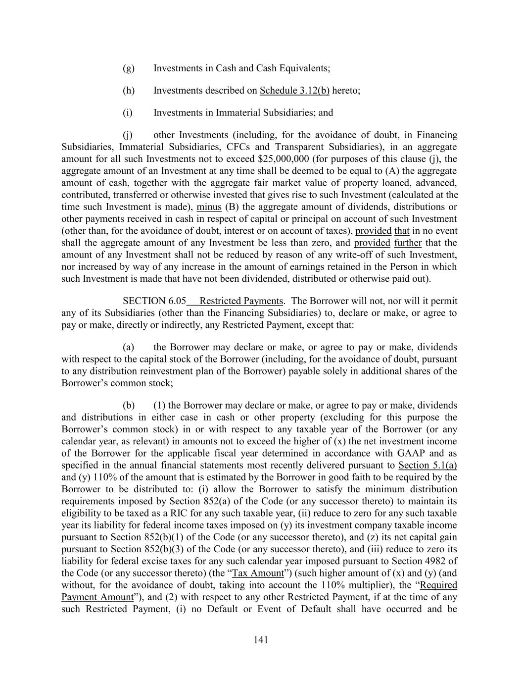 (g) Investments in Cash and Cash Equivalents; (h) Investments described on Schedule 3.12(b) hereto; (i) Investments in Immaterial Subsidiaries; and (j) other Investments (including, for the avoidance of doubt, in Financing Subsidiaries, Immaterial Subsidiaries, CFCs and Transparent Subsidiaries), in an aggregate amount for all such Investments not to exceed $25,000,000 (for purposes of this clause (j), the aggregate amount of an Investment at any time shall be deemed to be equal to (A) the aggregate amount of cash, together with the aggregate fair market value of property loaned, advanced, contributed, transferred or otherwise invested that gives rise to such Investment (calculated at the time such Investment is made), minus (B) the aggregate amount of dividends, distributions or other payments received in cash in respect of capital or principal on account of such Investment (other than, for the avoidance of doubt, interest or on account of taxes), provided that in no event shall the aggregate amount of any Investment be less than zero, and provided further that the amount of any Investment shall not be reduced by reason of any write-off of such Investment, nor increased by way of any increase in the amount of earnings retained in the Person in which such Investment is made that have not been dividended, distributed or otherwise paid out). SECTION 6.05 Restricted Payments. The Borrower will not, nor will it permit any of its Subsidiaries (other than the Financing Subsidiaries) to, declare or make, or agree to pay or make, directly or indirectly, any Restricted Payment, except that: (a) the Borrower may declare or make, or agree to pay or make, dividends with respect to the capital stock of the Borrower (including, for the avoidance of doubt, pursuant to any distribution reinvestment plan of the Borrower) payable solely in additional shares of the Borrower’s common stock; (b) (1) the Borrower may declare or make, or agree to pay or make, dividends and distributions in either case in cash or other property (excluding for this purpose the Borrower’s common stock) in or with respect to any taxable year of the Borrower (or any calendar year, as relevant) in amounts not to exceed the higher of (x) the net investment income of the Borrower for the applicable fiscal year determined in accordance with GAAP and as specified in the annual financial statements most recently delivered pursuant to Section 5.1(a) and (y) 110% of the amount that is estimated by the Borrower in good faith to be required by the Borrower to be distributed to: (i) allow the Borrower to satisfy the minimum distribution requirements imposed by Section 852(a) of the Code (or any successor thereto) to maintain its eligibility to be taxed as a RIC for any such taxable year, (ii) reduce to zero for any such taxable year its liability for federal income taxes imposed on (y) its investment company taxable income pursuant to Section 852(b)(1) of the Code (or any successor thereto), and (z) its net capital gain pursuant to Section 852(b)(3) of the Code (or any successor thereto), and (iii) reduce to zero its liability for federal excise taxes for any such calendar year imposed pursuant to Section 4982 of the Code (or any successor thereto) (the “Tax Amount”) (such higher amount of (x) and (y) (and without, for the avoidance of doubt, taking into account the 110% multiplier), the “Required Payment Amount”), and (2) with respect to any other Restricted Payment, if at the time of any such Restricted Payment, (i) no Default or Event of Default shall have occurred and be 141