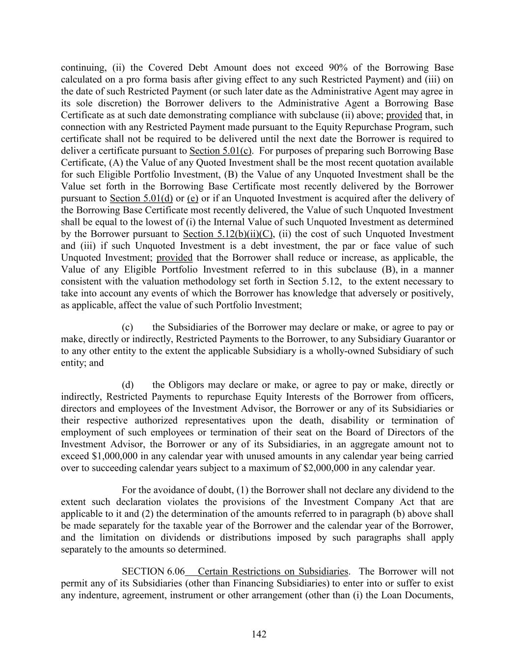 continuing, (ii) the Covered Debt Amount does not exceed 90% of the Borrowing Base calculated on a pro forma basis after giving effect to any such Restricted Payment) and (iii) on the date of such Restricted Payment (or such later date as the Administrative Agent may agree in its sole discretion) the Borrower delivers to the Administrative Agent a Borrowing Base Certificate as at such date demonstrating compliance with subclause (ii) above; provided that, in connection with any Restricted Payment made pursuant to the Equity Repurchase Program, such certificate shall not be required to be delivered until the next date the Borrower is required to deliver a certificate pursuant to Section 5.01(c). For purposes of preparing such Borrowing Base Certificate, (A) the Value of any Quoted Investment shall be the most recent quotation available for such Eligible Portfolio Investment, (B) the Value of any Unquoted Investment shall be the Value set forth in the Borrowing Base Certificate most recently delivered by the Borrower pursuant to Section 5.01(d) or (e) or if an Unquoted Investment is acquired after the delivery of the Borrowing Base Certificate most recently delivered, the Value of such Unquoted Investment shall be equal to the lowest of (i) the Internal Value of such Unquoted Investment as determined by the Borrower pursuant to Section 5.12(b)(ii)(C), (ii) the cost of such Unquoted Investment and (iii) if such Unquoted Investment is a debt investment, the par or face value of such Unquoted Investment; provided that the Borrower shall reduce or increase, as applicable, the Value of any Eligible Portfolio Investment referred to in this subclause (B), in a manner consistent with the valuation methodology set forth in Section 5.12, to the extent necessary to take into account any events of which the Borrower has knowledge that adversely or positively, as applicable, affect the value of such Portfolio Investment; (c) the Subsidiaries of the Borrower may declare or make, or agree to pay or make, directly or indirectly, Restricted Payments to the Borrower, to any Subsidiary Guarantor or to any other entity to the extent the applicable Subsidiary is a wholly-owned Subsidiary of such entity; and (d) the Obligors may declare or make, or agree to pay or make, directly or indirectly, Restricted Payments to repurchase Equity Interests of the Borrower from officers, directors and employees of the Investment Advisor, the Borrower or any of its Subsidiaries or their respective authorized representatives upon the death, disability or termination of employment of such employees or termination of their seat on the Board of Directors of the Investment Advisor, the Borrower or any of its Subsidiaries, in an aggregate amount not to exceed $1,000,000 in any calendar year with unused amounts in any calendar year being carried over to succeeding calendar years subject to a maximum of $2,000,000 in any calendar year. For the avoidance of doubt, (1) the Borrower shall not declare any dividend to the extent such declaration violates the provisions of the Investment Company Act that are applicable to it and (2) the determination of the amounts referred to in paragraph (b) above shall be made separately for the taxable year of the Borrower and the calendar year of the Borrower, and the limitation on dividends or distributions imposed by such paragraphs shall apply separately to the amounts so determined. SECTION 6.06 Certain Restrictions on Subsidiaries. The Borrower will not permit any of its Subsidiaries (other than Financing Subsidiaries) to enter into or suffer to exist any indenture, agreement, instrument or other arrangement (other than (i) the Loan Documents, 142
