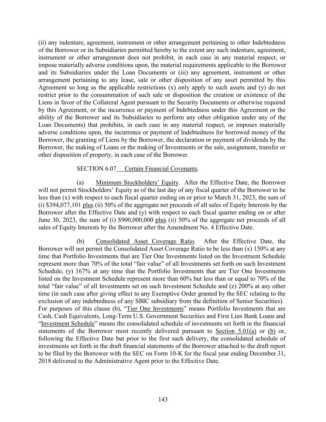 (ii) any indenture, agreement, instrument or other arrangement pertaining to other Indebtedness of the Borrower or its Subsidiaries permitted hereby to the extent any such indenture, agreement, instrument or other arrangement does not prohibit, in each case in any material respect, or impose materially adverse conditions upon, the material requirements applicable to the Borrower and its Subsidiaries under the Loan Documents or (iii) any agreement, instrument or other arrangement pertaining to any lease, sale or other disposition of any asset permitted by this Agreement so long as the applicable restrictions (x) only apply to such assets and (y) do not restrict prior to the consummation of such sale or disposition the creation or existence of the Liens in favor of the Collateral Agent pursuant to the Security Documents or otherwise required by this Agreement, or the incurrence or payment of Indebtedness under this Agreement or the ability of the Borrower and its Subsidiaries to perform any other obligation under any of the Loan Documents) that prohibits, in each case in any material respect, or imposes materially adverse conditions upon, the incurrence or payment of Indebtedness for borrowed money of the Borrower, the granting of Liens by the Borrower, the declaration or payment of dividends by the Borrower, the making of Loans or the making of Investments or the sale, assignment, transfer or other disposition of property, in each case of the Borrower. SECTION 6.07 Certain Financial Covenants. (a) Minimum Stockholders’ Equity. After the Effective Date, the Borrower will not permit Stockholders’ Equity as of the last day of any fiscal quarter of the Borrower to be less than (x) with respect to each fiscal quarter ending on or prior to March 31, 2023, the sum of (i) $394,077,101 plus (ii) 50% of the aggregate net proceeds of all sales of Equity Interests by the Borrower after the Effective Date and (y) with respect to each fiscal quarter ending on or after June 30, 2023, the sum of (i) $900,000,000 plus (ii) 50% of the aggregate net proceeds of all sales of Equity Interests by the Borrower after the Amendment No. 4 Effective Date. (b) Consolidated Asset Coverage Ratio. After the Effective Date, the Borrower will not permit the Consolidated Asset Coverage Ratio to be less than (x) 150% at any time that Portfolio Investments that are Tier One Investments listed on the Investment Schedule represent more than 70% of the total “fair value” of all Investments set forth on such Investment Schedule, (y) 167% at any time that the Portfolio Investments that are Tier One Investments listed on the Investment Schedule represent more than 60% but less than or equal to 70% of the total “fair value” of all Investments set on such Investment Schedule and (z) 200% at any other time (in each case after giving effect to any Exemptive Order granted by the SEC relating to the exclusion of any indebtedness of any SBIC subsidiary from the definition of Senior Securities). For purposes of this clause (b), “Tier One Investments” means Portfolio Investments that are Cash, Cash Equivalents, Long-Term U.S. Government Securities and First Lien Bank Loans and “Investment Schedule” means the consolidated schedule of investments set forth in the financial statements of the Borrower most recently delivered pursuant to Section 5.01(a) or (b) or, following the Effective Date but prior to the first such delivery, the consolidated schedule of investments set forth in the draft financial statements of the Borrower attached to the draft report to be filed by the Borrower with the SEC on Form 10-K for the fiscal year ending December 31, 2018 delivered to the Administrative Agent prior to the Effective Date. 143