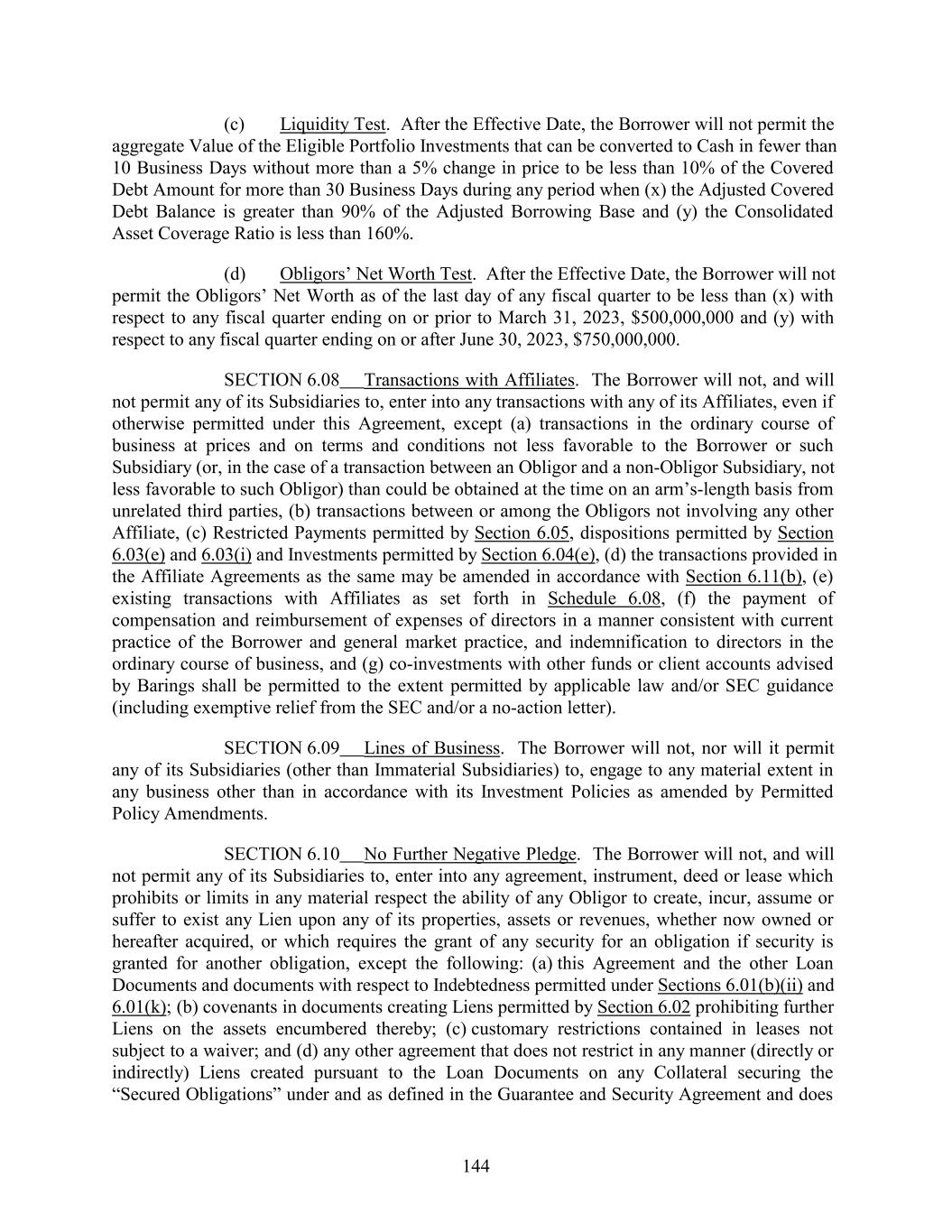 (c) Liquidity Test. After the Effective Date, the Borrower will not permit the aggregate Value of the Eligible Portfolio Investments that can be converted to Cash in fewer than 10 Business Days without more than a 5% change in price to be less than 10% of the Covered Debt Amount for more than 30 Business Days during any period when (x) the Adjusted Covered Debt Balance is greater than 90% of the Adjusted Borrowing Base and (y) the Consolidated Asset Coverage Ratio is less than 160%. (d) Obligors’ Net Worth Test. After the Effective Date, the Borrower will not permit the Obligors’ Net Worth as of the last day of any fiscal quarter to be less than (x) with respect to any fiscal quarter ending on or prior to March 31, 2023, $500,000,000 and (y) with respect to any fiscal quarter ending on or after June 30, 2023, $750,000,000. SECTION 6.08 Transactions with Affiliates. The Borrower will not, and will not permit any of its Subsidiaries to, enter into any transactions with any of its Affiliates, even if otherwise permitted under this Agreement, except (a) transactions in the ordinary course of business at prices and on terms and conditions not less favorable to the Borrower or such Subsidiary (or, in the case of a transaction between an Obligor and a non-Obligor Subsidiary, not less favorable to such Obligor) than could be obtained at the time on an arm’s-length basis from unrelated third parties, (b) transactions between or among the Obligors not involving any other Affiliate, (c) Restricted Payments permitted by Section 6.05, dispositions permitted by Section 6.03(e) and 6.03(i) and Investments permitted by Section 6.04(e), (d) the transactions provided in the Affiliate Agreements as the same may be amended in accordance with Section 6.11(b), (e) existing transactions with Affiliates as set forth in Schedule 6.08, (f) the payment of compensation and reimbursement of expenses of directors in a manner consistent with current practice of the Borrower and general market practice, and indemnification to directors in the ordinary course of business, and (g) co-investments with other funds or client accounts advised by Barings shall be permitted to the extent permitted by applicable law and/or SEC guidance (including exemptive relief from the SEC and/or a no-action letter). SECTION 6.09 Lines of Business. The Borrower will not, nor will it permit any of its Subsidiaries (other than Immaterial Subsidiaries) to, engage to any material extent in any business other than in accordance with its Investment Policies as amended by Permitted Policy Amendments. SECTION 6.10 No Further Negative Pledge. The Borrower will not, and will not permit any of its Subsidiaries to, enter into any agreement, instrument, deed or lease which prohibits or limits in any material respect the ability of any Obligor to create, incur, assume or suffer to exist any Lien upon any of its properties, assets or revenues, whether now owned or hereafter acquired, or which requires the grant of any security for an obligation if security is granted for another obligation, except the following: (a) this Agreement and the other Loan Documents and documents with respect to Indebtedness permitted under Sections 6.01(b)(ii) and 6.01(k); (b) covenants in documents creating Liens permitted by Section 6.02 prohibiting further Liens on the assets encumbered thereby; (c) customary restrictions contained in leases not subject to a waiver; and (d) any other agreement that does not restrict in any manner (directly or indirectly) Liens created pursuant to the Loan Documents on any Collateral securing the “Secured Obligations” under and as defined in the Guarantee and Security Agreement and does 144