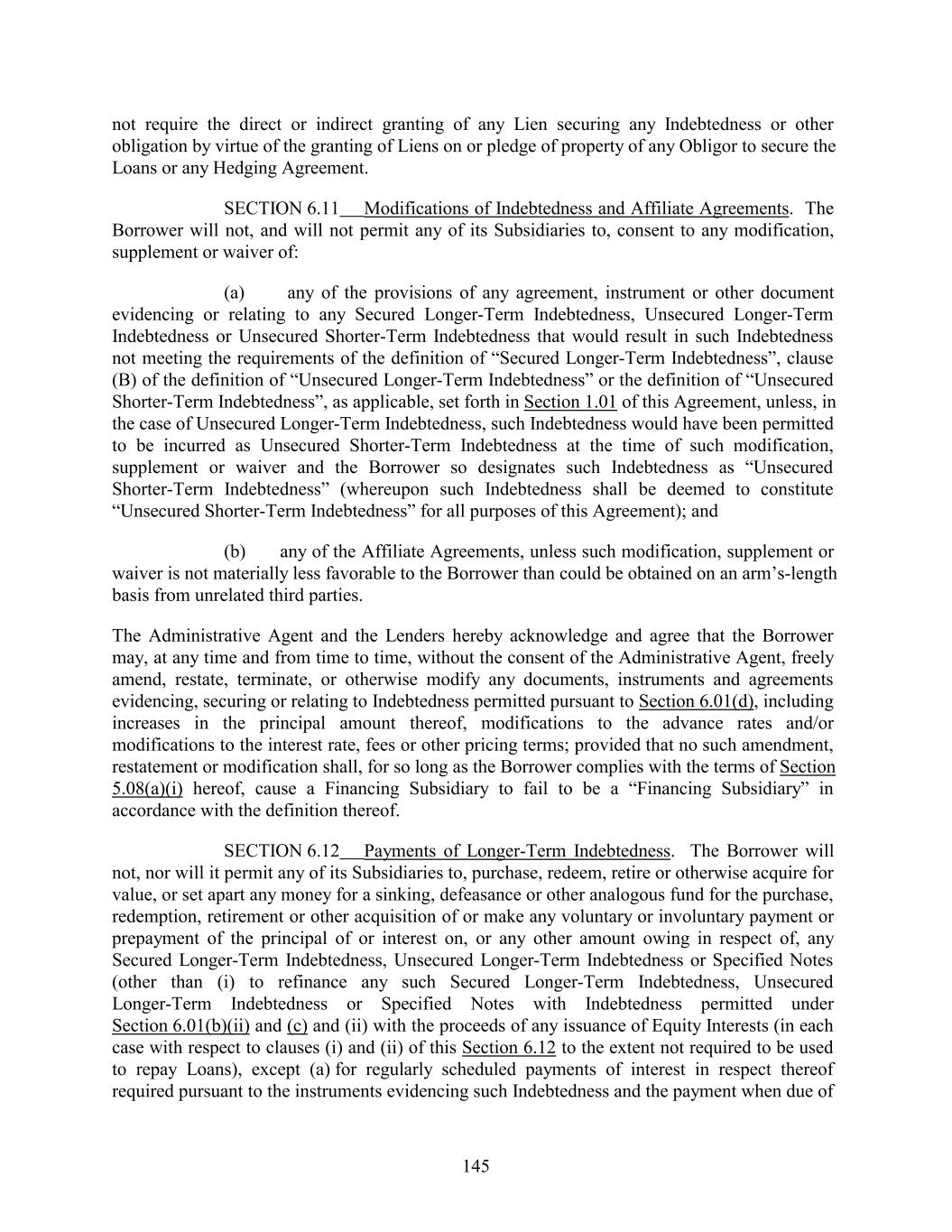 not require the direct or indirect granting of any Lien securing any Indebtedness or other obligation by virtue of the granting of Liens on or pledge of property of any Obligor to secure the Loans or any Hedging Agreement. SECTION 6.11 Modifications of Indebtedness and Affiliate Agreements. The Borrower will not, and will not permit any of its Subsidiaries to, consent to any modification, supplement or waiver of: (a) any of the provisions of any agreement, instrument or other document evidencing or relating to any Secured Longer-Term Indebtedness, Unsecured Longer-Term Indebtedness or Unsecured Shorter-Term Indebtedness that would result in such Indebtedness not meeting the requirements of the definition of “Secured Longer-Term Indebtedness”, clause (B) of the definition of “Unsecured Longer-Term Indebtedness” or the definition of “Unsecured Shorter-Term Indebtedness”, as applicable, set forth in Section 1.01 of this Agreement, unless, in the case of Unsecured Longer-Term Indebtedness, such Indebtedness would have been permitted to be incurred as Unsecured Shorter-Term Indebtedness at the time of such modification, supplement or waiver and the Borrower so designates such Indebtedness as “Unsecured Shorter-Term Indebtedness” (whereupon such Indebtedness shall be deemed to constitute “Unsecured Shorter-Term Indebtedness” for all purposes of this Agreement); and (b) any of the Affiliate Agreements, unless such modification, supplement or waiver is not materially less favorable to the Borrower than could be obtained on an arm’s-length basis from unrelated third parties. The Administrative Agent and the Lenders hereby acknowledge and agree that the Borrower may, at any time and from time to time, without the consent of the Administrative Agent, freely amend, restate, terminate, or otherwise modify any documents, instruments and agreements evidencing, securing or relating to Indebtedness permitted pursuant to Section 6.01(d), including increases in the principal amount thereof, modifications to the advance rates and/or modifications to the interest rate, fees or other pricing terms; provided that no such amendment, restatement or modification shall, for so long as the Borrower complies with the terms of Section 5.08(a)(i) hereof, cause a Financing Subsidiary to fail to be a “Financing Subsidiary” in accordance with the definition thereof. SECTION 6.12 Payments of Longer-Term Indebtedness. The Borrower will not, nor will it permit any of its Subsidiaries to, purchase, redeem, retire or otherwise acquire for value, or set apart any money for a sinking, defeasance or other analogous fund for the purchase, redemption, retirement or other acquisition of or make any voluntary or involuntary payment or prepayment of the principal of or interest on, or any other amount owing in respect of, any Secured Longer-Term Indebtedness, Unsecured Longer-Term Indebtedness or Specified Notes (other than (i) to refinance any such Secured Longer-Term Indebtedness, Unsecured Longer-Term Indebtedness or Specified Notes with Indebtedness permitted under Section 6.01(b)(ii) and (c) and (ii) with the proceeds of any issuance of Equity Interests (in each case with respect to clauses (i) and (ii) of this Section 6.12 to the extent not required to be used to repay Loans), except (a) for regularly scheduled payments of interest in respect thereof required pursuant to the instruments evidencing such Indebtedness and the payment when due of 145