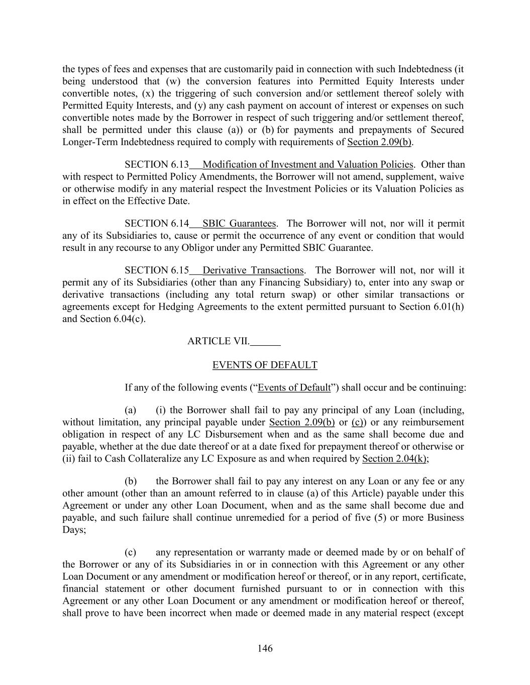 the types of fees and expenses that are customarily paid in connection with such Indebtedness (it being understood that (w) the conversion features into Permitted Equity Interests under convertible notes, (x) the triggering of such conversion and/or settlement thereof solely with Permitted Equity Interests, and (y) any cash payment on account of interest or expenses on such convertible notes made by the Borrower in respect of such triggering and/or settlement thereof, shall be permitted under this clause (a)) or (b) for payments and prepayments of Secured Longer-Term Indebtedness required to comply with requirements of Section 2.09(b). SECTION 6.13 Modification of Investment and Valuation Policies. Other than with respect to Permitted Policy Amendments, the Borrower will not amend, supplement, waive or otherwise modify in any material respect the Investment Policies or its Valuation Policies as in effect on the Effective Date. SECTION 6.14 SBIC Guarantees. The Borrower will not, nor will it permit any of its Subsidiaries to, cause or permit the occurrence of any event or condition that would result in any recourse to any Obligor under any Permitted SBIC Guarantee. SECTION 6.15 Derivative Transactions. The Borrower will not, nor will it permit any of its Subsidiaries (other than any Financing Subsidiary) to, enter into any swap or derivative transactions (including any total return swap) or other similar transactions or agreements except for Hedging Agreements to the extent permitted pursuant to Section 6.01(h) and Section 6.04(c). ARTICLE VII. EVENTS OF DEFAULT If any of the following events (“Events of Default”) shall occur and be continuing: (a) (i) the Borrower shall fail to pay any principal of any Loan (including, without limitation, any principal payable under Section 2.09(b) or (c)) or any reimbursement obligation in respect of any LC Disbursement when and as the same shall become due and payable, whether at the due date thereof or at a date fixed for prepayment thereof or otherwise or (ii) fail to Cash Collateralize any LC Exposure as and when required by Section 2.04(k); (b) the Borrower shall fail to pay any interest on any Loan or any fee or any other amount (other than an amount referred to in clause (a) of this Article) payable under this Agreement or under any other Loan Document, when and as the same shall become due and payable, and such failure shall continue unremedied for a period of five (5) or more Business Days; (c) any representation or warranty made or deemed made by or on behalf of the Borrower or any of its Subsidiaries in or in connection with this Agreement or any other Loan Document or any amendment or modification hereof or thereof, or in any report, certificate, financial statement or other document furnished pursuant to or in connection with this Agreement or any other Loan Document or any amendment or modification hereof or thereof, shall prove to have been incorrect when made or deemed made in any material respect (except 146