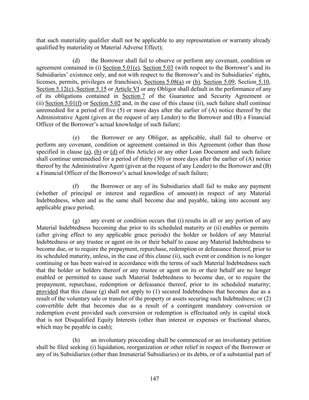 that such materiality qualifier shall not be applicable to any representation or warranty already qualified by materiality or Material Adverse Effect); (d) the Borrower shall fail to observe or perform any covenant, condition or agreement contained in (i) Section 5.01(e), Section 5.03 (with respect to the Borrower’s and its Subsidiaries’ existence only, and not with respect to the Borrower’s and its Subsidiaries’ rights, licenses, permits, privileges or franchises), Sections 5.08(a) or (b), Section 5.09, Section 5.10, Section 5.12(c), Section 5.15 or Article VI or any Obligor shall default in the performance of any of its obligations contained in Section 7 of the Guarantee and Security Agreement or (ii) Section 5.01(f) or Section 5.02 and, in the case of this clause (ii), such failure shall continue unremedied for a period of five (5) or more days after the earlier of (A) notice thereof by the Administrative Agent (given at the request of any Lender) to the Borrower and (B) a Financial Officer of the Borrower’s actual knowledge of such failure; (e) the Borrower or any Obligor, as applicable, shall fail to observe or perform any covenant, condition or agreement contained in this Agreement (other than those specified in clause (a), (b) or (d) of this Article) or any other Loan Document and such failure shall continue unremedied for a period of thirty (30) or more days after the earlier of (A) notice thereof by the Administrative Agent (given at the request of any Lender) to the Borrower and (B) a Financial Officer of the Borrower’s actual knowledge of such failure; (f) the Borrower or any of its Subsidiaries shall fail to make any payment (whether of principal or interest and regardless of amount) in respect of any Material Indebtedness, when and as the same shall become due and payable, taking into account any applicable grace period; (g) any event or condition occurs that (i) results in all or any portion of any Material Indebtedness becoming due prior to its scheduled maturity or (ii) enables or permits (after giving effect to any applicable grace periods) the holder or holders of any Material Indebtedness or any trustee or agent on its or their behalf to cause any Material Indebtedness to become due, or to require the prepayment, repurchase, redemption or defeasance thereof, prior to its scheduled maturity, unless, in the case of this clause (ii), such event or condition is no longer continuing or has been waived in accordance with the terms of such Material Indebtedness such that the holder or holders thereof or any trustee or agent on its or their behalf are no longer enabled or permitted to cause such Material Indebtedness to become due, or to require the prepayment, repurchase, redemption or defeasance thereof, prior to its scheduled maturity; provided that this clause (g) shall not apply to (1) secured Indebtedness that becomes due as a result of the voluntary sale or transfer of the property or assets securing such Indebtedness; or (2) convertible debt that becomes due as a result of a contingent mandatory conversion or redemption event provided such conversion or redemption is effectuated only in capital stock that is not Disqualified Equity Interests (other than interest or expenses or fractional shares, which may be payable in cash); (h) an involuntary proceeding shall be commenced or an involuntary petition shall be filed seeking (i) liquidation, reorganization or other relief in respect of the Borrower or any of its Subsidiaries (other than Immaterial Subsidiaries) or its debts, or of a substantial part of 147