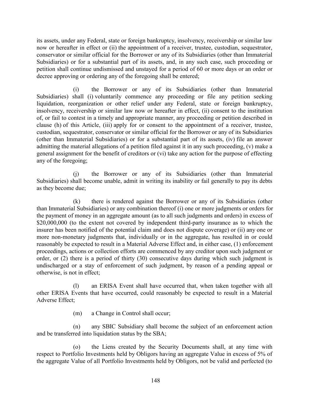 its assets, under any Federal, state or foreign bankruptcy, insolvency, receivership or similar law now or hereafter in effect or (ii) the appointment of a receiver, trustee, custodian, sequestrator, conservator or similar official for the Borrower or any of its Subsidiaries (other than Immaterial Subsidiaries) or for a substantial part of its assets, and, in any such case, such proceeding or petition shall continue undismissed and unstayed for a period of 60 or more days or an order or decree approving or ordering any of the foregoing shall be entered; (i) the Borrower or any of its Subsidiaries (other than Immaterial Subsidiaries) shall (i) voluntarily commence any proceeding or file any petition seeking liquidation, reorganization or other relief under any Federal, state or foreign bankruptcy, insolvency, receivership or similar law now or hereafter in effect, (ii) consent to the institution of, or fail to contest in a timely and appropriate manner, any proceeding or petition described in clause (h) of this Article, (iii) apply for or consent to the appointment of a receiver, trustee, custodian, sequestrator, conservator or similar official for the Borrower or any of its Subsidiaries (other than Immaterial Subsidiaries) or for a substantial part of its assets, (iv) file an answer admitting the material allegations of a petition filed against it in any such proceeding, (v) make a general assignment for the benefit of creditors or (vi) take any action for the purpose of effecting any of the foregoing; (j) the Borrower or any of its Subsidiaries (other than Immaterial Subsidiaries) shall become unable, admit in writing its inability or fail generally to pay its debts as they become due; (k) there is rendered against the Borrower or any of its Subsidiaries (other than Immaterial Subsidiaries) or any combination thereof (i) one or more judgments or orders for the payment of money in an aggregate amount (as to all such judgments and orders) in excess of $20,000,000 (to the extent not covered by independent third-party insurance as to which the insurer has been notified of the potential claim and does not dispute coverage) or (ii) any one or more non-monetary judgments that, individually or in the aggregate, has resulted in or could reasonably be expected to result in a Material Adverse Effect and, in either case, (1) enforcement proceedings, actions or collection efforts are commenced by any creditor upon such judgment or order, or (2) there is a period of thirty (30) consecutive days during which such judgment is undischarged or a stay of enforcement of such judgment, by reason of a pending appeal or otherwise, is not in effect; (l) an ERISA Event shall have occurred that, when taken together with all other ERISA Events that have occurred, could reasonably be expected to result in a Material Adverse Effect; (m) a Change in Control shall occur; (n) any SBIC Subsidiary shall become the subject of an enforcement action and be transferred into liquidation status by the SBA; (o) the Liens created by the Security Documents shall, at any time with respect to Portfolio Investments held by Obligors having an aggregate Value in excess of 5% of the aggregate Value of all Portfolio Investments held by Obligors, not be valid and perfected (to 148