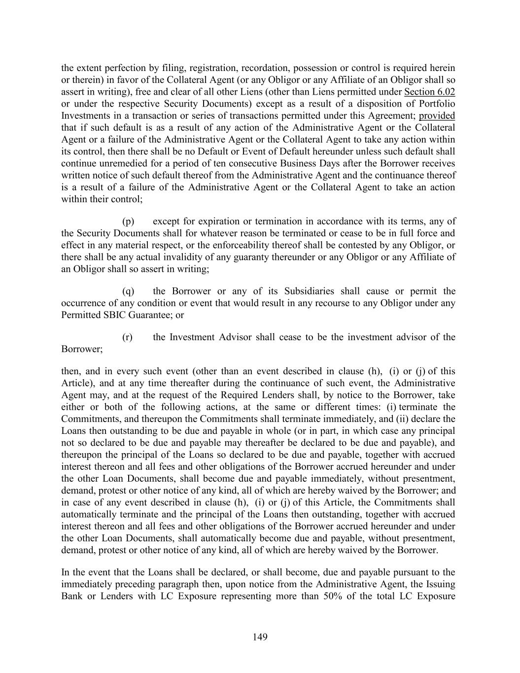 the extent perfection by filing, registration, recordation, possession or control is required herein or therein) in favor of the Collateral Agent (or any Obligor or any Affiliate of an Obligor shall so assert in writing), free and clear of all other Liens (other than Liens permitted under Section 6.02 or under the respective Security Documents) except as a result of a disposition of Portfolio Investments in a transaction or series of transactions permitted under this Agreement; provided that if such default is as a result of any action of the Administrative Agent or the Collateral Agent or a failure of the Administrative Agent or the Collateral Agent to take any action within its control, then there shall be no Default or Event of Default hereunder unless such default shall continue unremedied for a period of ten consecutive Business Days after the Borrower receives written notice of such default thereof from the Administrative Agent and the continuance thereof is a result of a failure of the Administrative Agent or the Collateral Agent to take an action within their control; (p) except for expiration or termination in accordance with its terms, any of the Security Documents shall for whatever reason be terminated or cease to be in full force and effect in any material respect, or the enforceability thereof shall be contested by any Obligor, or there shall be any actual invalidity of any guaranty thereunder or any Obligor or any Affiliate of an Obligor shall so assert in writing; (q) the Borrower or any of its Subsidiaries shall cause or permit the occurrence of any condition or event that would result in any recourse to any Obligor under any Permitted SBIC Guarantee; or (r) the Investment Advisor shall cease to be the investment advisor of the Borrower; then, and in every such event (other than an event described in clause (h), (i) or (j) of this Article), and at any time thereafter during the continuance of such event, the Administrative Agent may, and at the request of the Required Lenders shall, by notice to the Borrower, take either or both of the following actions, at the same or different times: (i) terminate the Commitments, and thereupon the Commitments shall terminate immediately, and (ii) declare the Loans then outstanding to be due and payable in whole (or in part, in which case any principal not so declared to be due and payable may thereafter be declared to be due and payable), and thereupon the principal of the Loans so declared to be due and payable, together with accrued interest thereon and all fees and other obligations of the Borrower accrued hereunder and under the other Loan Documents, shall become due and payable immediately, without presentment, demand, protest or other notice of any kind, all of which are hereby waived by the Borrower; and in case of any event described in clause (h), (i) or (j) of this Article, the Commitments shall automatically terminate and the principal of the Loans then outstanding, together with accrued interest thereon and all fees and other obligations of the Borrower accrued hereunder and under the other Loan Documents, shall automatically become due and payable, without presentment, demand, protest or other notice of any kind, all of which are hereby waived by the Borrower. In the event that the Loans shall be declared, or shall become, due and payable pursuant to the immediately preceding paragraph then, upon notice from the Administrative Agent, the Issuing Bank or Lenders with LC Exposure representing more than 50% of the total LC Exposure 149