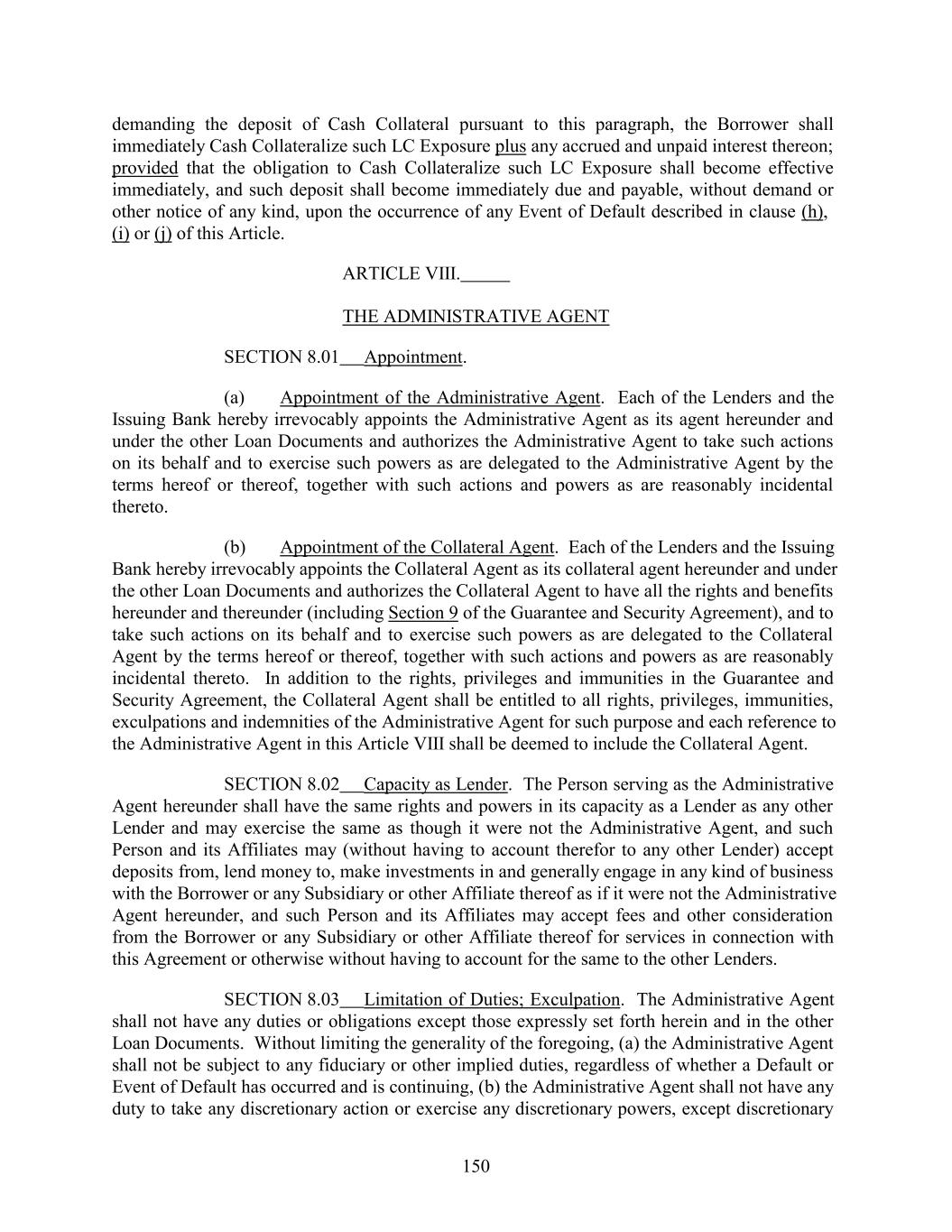demanding the deposit of Cash Collateral pursuant to this paragraph, the Borrower shall immediately Cash Collateralize such LC Exposure plus any accrued and unpaid interest thereon; provided that the obligation to Cash Collateralize such LC Exposure shall become effective immediately, and such deposit shall become immediately due and payable, without demand or other notice of any kind, upon the occurrence of any Event of Default described in clause (h), (i) or (j) of this Article. ARTICLE VIII. THE ADMINISTRATIVE AGENT SECTION 8.01 Appointment. (a) Appointment of the Administrative Agent. Each of the Lenders and the Issuing Bank hereby irrevocably appoints the Administrative Agent as its agent hereunder and under the other Loan Documents and authorizes the Administrative Agent to take such actions on its behalf and to exercise such powers as are delegated to the Administrative Agent by the terms hereof or thereof, together with such actions and powers as are reasonably incidental thereto. (b) Appointment of the Collateral Agent. Each of the Lenders and the Issuing Bank hereby irrevocably appoints the Collateral Agent as its collateral agent hereunder and under the other Loan Documents and authorizes the Collateral Agent to have all the rights and benefits hereunder and thereunder (including Section 9 of the Guarantee and Security Agreement), and to take such actions on its behalf and to exercise such powers as are delegated to the Collateral Agent by the terms hereof or thereof, together with such actions and powers as are reasonably incidental thereto. In addition to the rights, privileges and immunities in the Guarantee and Security Agreement, the Collateral Agent shall be entitled to all rights, privileges, immunities, exculpations and indemnities of the Administrative Agent for such purpose and each reference to the Administrative Agent in this Article VIII shall be deemed to include the Collateral Agent. SECTION 8.02 Capacity as Lender. The Person serving as the Administrative Agent hereunder shall have the same rights and powers in its capacity as a Lender as any other Lender and may exercise the same as though it were not the Administrative Agent, and such Person and its Affiliates may (without having to account therefor to any other Lender) accept deposits from, lend money to, make investments in and generally engage in any kind of business with the Borrower or any Subsidiary or other Affiliate thereof as if it were not the Administrative Agent hereunder, and such Person and its Affiliates may accept fees and other consideration from the Borrower or any Subsidiary or other Affiliate thereof for services in connection with this Agreement or otherwise without having to account for the same to the other Lenders. SECTION 8.03 Limitation of Duties; Exculpation. The Administrative Agent shall not have any duties or obligations except those expressly set forth herein and in the other Loan Documents. Without limiting the generality of the foregoing, (a) the Administrative Agent shall not be subject to any fiduciary or other implied duties, regardless of whether a Default or Event of Default has occurred and is continuing, (b) the Administrative Agent shall not have any duty to take any discretionary action or exercise any discretionary powers, except discretionary 150