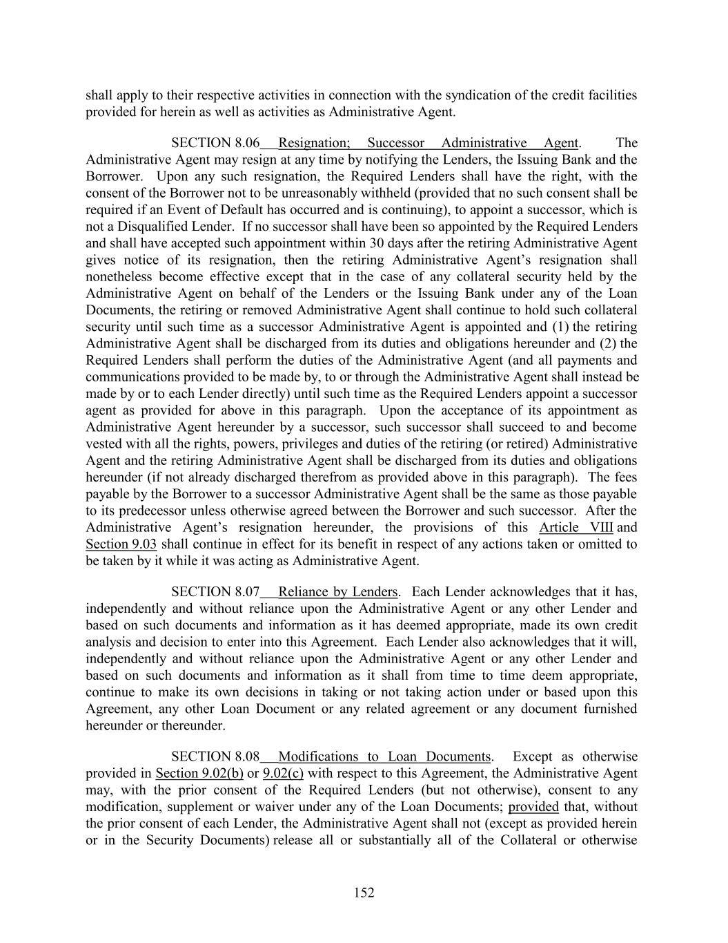shall apply to their respective activities in connection with the syndication of the credit facilities provided for herein as well as activities as Administrative Agent. SECTION 8.06 Resignation; Successor Administrative Agent. The Administrative Agent may resign at any time by notifying the Lenders, the Issuing Bank and the Borrower. Upon any such resignation, the Required Lenders shall have the right, with the consent of the Borrower not to be unreasonably withheld (provided that no such consent shall be required if an Event of Default has occurred and is continuing), to appoint a successor, which is not a Disqualified Lender. If no successor shall have been so appointed by the Required Lenders and shall have accepted such appointment within 30 days after the retiring Administrative Agent gives notice of its resignation, then the retiring Administrative Agent’s resignation shall nonetheless become effective except that in the case of any collateral security held by the Administrative Agent on behalf of the Lenders or the Issuing Bank under any of the Loan Documents, the retiring or removed Administrative Agent shall continue to hold such collateral security until such time as a successor Administrative Agent is appointed and (1) the retiring Administrative Agent shall be discharged from its duties and obligations hereunder and (2) the Required Lenders shall perform the duties of the Administrative Agent (and all payments and communications provided to be made by, to or through the Administrative Agent shall instead be made by or to each Lender directly) until such time as the Required Lenders appoint a successor agent as provided for above in this paragraph. Upon the acceptance of its appointment as Administrative Agent hereunder by a successor, such successor shall succeed to and become vested with all the rights, powers, privileges and duties of the retiring (or retired) Administrative Agent and the retiring Administrative Agent shall be discharged from its duties and obligations hereunder (if not already discharged therefrom as provided above in this paragraph). The fees payable by the Borrower to a successor Administrative Agent shall be the same as those payable to its predecessor unless otherwise agreed between the Borrower and such successor. After the Administrative Agent’s resignation hereunder, the provisions of this Article VIII and Section 9.03 shall continue in effect for its benefit in respect of any actions taken or omitted to be taken by it while it was acting as Administrative Agent. SECTION 8.07 Reliance by Lenders. Each Lender acknowledges that it has, independently and without reliance upon the Administrative Agent or any other Lender and based on such documents and information as it has deemed appropriate, made its own credit analysis and decision to enter into this Agreement. Each Lender also acknowledges that it will, independently and without reliance upon the Administrative Agent or any other Lender and based on such documents and information as it shall from time to time deem appropriate, continue to make its own decisions in taking or not taking action under or based upon this Agreement, any other Loan Document or any related agreement or any document furnished hereunder or thereunder. SECTION 8.08 Modifications to Loan Documents. Except as otherwise provided in Section 9.02(b) or 9.02(c) with respect to this Agreement, the Administrative Agent may, with the prior consent of the Required Lenders (but not otherwise), consent to any modification, supplement or waiver under any of the Loan Documents; provided that, without the prior consent of each Lender, the Administrative Agent shall not (except as provided herein or in the Security Documents) release all or substantially all of the Collateral or otherwise 152