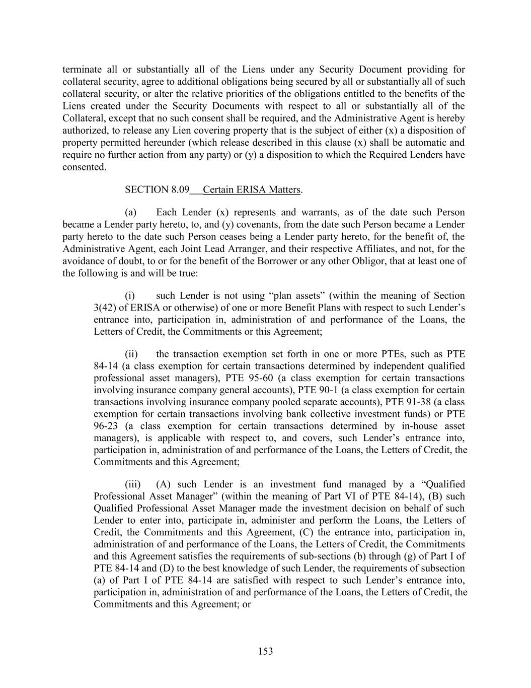 terminate all or substantially all of the Liens under any Security Document providing for collateral security, agree to additional obligations being secured by all or substantially all of such collateral security, or alter the relative priorities of the obligations entitled to the benefits of the Liens created under the Security Documents with respect to all or substantially all of the Collateral, except that no such consent shall be required, and the Administrative Agent is hereby authorized, to release any Lien covering property that is the subject of either (x) a disposition of property permitted hereunder (which release described in this clause (x) shall be automatic and require no further action from any party) or (y) a disposition to which the Required Lenders have consented. SECTION 8.09 Certain ERISA Matters. (a) Each Lender (x) represents and warrants, as of the date such Person became a Lender party hereto, to, and (y) covenants, from the date such Person became a Lender party hereto to the date such Person ceases being a Lender party hereto, for the benefit of, the Administrative Agent, each Joint Lead Arranger, and their respective Affiliates, and not, for the avoidance of doubt, to or for the benefit of the Borrower or any other Obligor, that at least one of the following is and will be true: (i) such Lender is not using “plan assets” (within the meaning of Section 3(42) of ERISA or otherwise) of one or more Benefit Plans with respect to such Lender’s entrance into, participation in, administration of and performance of the Loans, the Letters of Credit, the Commitments or this Agreement; (ii) the transaction exemption set forth in one or more PTEs, such as PTE 84-14 (a class exemption for certain transactions determined by independent qualified professional asset managers), PTE 95-60 (a class exemption for certain transactions involving insurance company general accounts), PTE 90-1 (a class exemption for certain transactions involving insurance company pooled separate accounts), PTE 91-38 (a class exemption for certain transactions involving bank collective investment funds) or PTE 96-23 (a class exemption for certain transactions determined by in-house asset managers), is applicable with respect to, and covers, such Lender’s entrance into, participation in, administration of and performance of the Loans, the Letters of Credit, the Commitments and this Agreement; (iii) (A) such Lender is an investment fund managed by a “Qualified Professional Asset Manager” (within the meaning of Part VI of PTE 84-14), (B) such Qualified Professional Asset Manager made the investment decision on behalf of such Lender to enter into, participate in, administer and perform the Loans, the Letters of Credit, the Commitments and this Agreement, (C) the entrance into, participation in, administration of and performance of the Loans, the Letters of Credit, the Commitments and this Agreement satisfies the requirements of sub-sections (b) through (g) of Part I of PTE 84-14 and (D) to the best knowledge of such Lender, the requirements of subsection (a) of Part I of PTE 84-14 are satisfied with respect to such Lender’s entrance into, participation in, administration of and performance of the Loans, the Letters of Credit, the Commitments and this Agreement; or 153