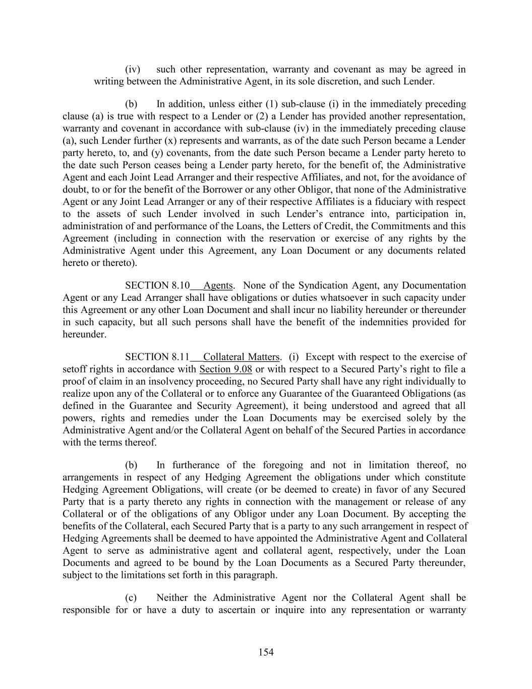 (iv) such other representation, warranty and covenant as may be agreed in writing between the Administrative Agent, in its sole discretion, and such Lender. (b) In addition, unless either (1) sub-clause (i) in the immediately preceding clause (a) is true with respect to a Lender or (2) a Lender has provided another representation, warranty and covenant in accordance with sub-clause (iv) in the immediately preceding clause (a), such Lender further (x) represents and warrants, as of the date such Person became a Lender party hereto, to, and (y) covenants, from the date such Person became a Lender party hereto to the date such Person ceases being a Lender party hereto, for the benefit of, the Administrative Agent and each Joint Lead Arranger and their respective Affiliates, and not, for the avoidance of doubt, to or for the benefit of the Borrower or any other Obligor, that none of the Administrative Agent or any Joint Lead Arranger or any of their respective Affiliates is a fiduciary with respect to the assets of such Lender involved in such Lender’s entrance into, participation in, administration of and performance of the Loans, the Letters of Credit, the Commitments and this Agreement (including in connection with the reservation or exercise of any rights by the Administrative Agent under this Agreement, any Loan Document or any documents related hereto or thereto). SECTION 8.10 Agents. None of the Syndication Agent, any Documentation Agent or any Lead Arranger shall have obligations or duties whatsoever in such capacity under this Agreement or any other Loan Document and shall incur no liability hereunder or thereunder in such capacity, but all such persons shall have the benefit of the indemnities provided for hereunder. SECTION 8.11 Collateral Matters. (i) Except with respect to the exercise of setoff rights in accordance with Section 9.08 or with respect to a Secured Party’s right to file a proof of claim in an insolvency proceeding, no Secured Party shall have any right individually to realize upon any of the Collateral or to enforce any Guarantee of the Guaranteed Obligations (as defined in the Guarantee and Security Agreement), it being understood and agreed that all powers, rights and remedies under the Loan Documents may be exercised solely by the Administrative Agent and/or the Collateral Agent on behalf of the Secured Parties in accordance with the terms thereof. (b) In furtherance of the foregoing and not in limitation thereof, no arrangements in respect of any Hedging Agreement the obligations under which constitute Hedging Agreement Obligations, will create (or be deemed to create) in favor of any Secured Party that is a party thereto any rights in connection with the management or release of any Collateral or of the obligations of any Obligor under any Loan Document. By accepting the benefits of the Collateral, each Secured Party that is a party to any such arrangement in respect of Hedging Agreements shall be deemed to have appointed the Administrative Agent and Collateral Agent to serve as administrative agent and collateral agent, respectively, under the Loan Documents and agreed to be bound by the Loan Documents as a Secured Party thereunder, subject to the limitations set forth in this paragraph. (c) Neither the Administrative Agent nor the Collateral Agent shall be responsible for or have a duty to ascertain or inquire into any representation or warranty 154