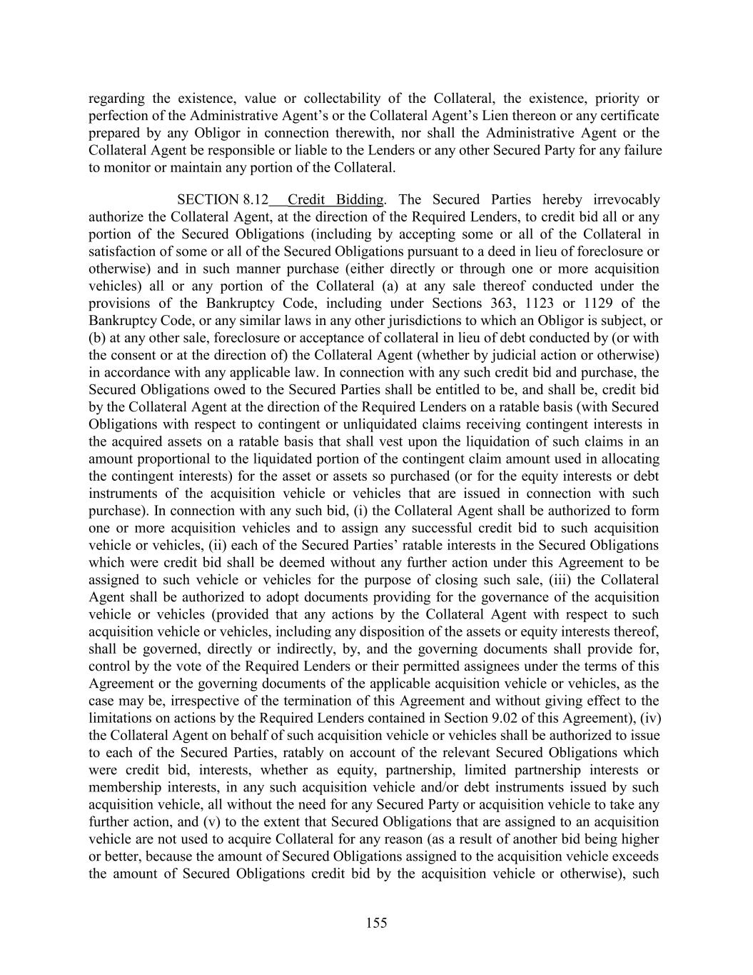 regarding the existence, value or collectability of the Collateral, the existence, priority or perfection of the Administrative Agent’s or the Collateral Agent’s Lien thereon or any certificate prepared by any Obligor in connection therewith, nor shall the Administrative Agent or the Collateral Agent be responsible or liable to the Lenders or any other Secured Party for any failure to monitor or maintain any portion of the Collateral. SECTION 8.12 Credit Bidding. The Secured Parties hereby irrevocably authorize the Collateral Agent, at the direction of the Required Lenders, to credit bid all or any portion of the Secured Obligations (including by accepting some or all of the Collateral in satisfaction of some or all of the Secured Obligations pursuant to a deed in lieu of foreclosure or otherwise) and in such manner purchase (either directly or through one or more acquisition vehicles) all or any portion of the Collateral (a) at any sale thereof conducted under the provisions of the Bankruptcy Code, including under Sections 363, 1123 or 1129 of the Bankruptcy Code, or any similar laws in any other jurisdictions to which an Obligor is subject, or (b) at any other sale, foreclosure or acceptance of collateral in lieu of debt conducted by (or with the consent or at the direction of) the Collateral Agent (whether by judicial action or otherwise) in accordance with any applicable law. In connection with any such credit bid and purchase, the Secured Obligations owed to the Secured Parties shall be entitled to be, and shall be, credit bid by the Collateral Agent at the direction of the Required Lenders on a ratable basis (with Secured Obligations with respect to contingent or unliquidated claims receiving contingent interests in the acquired assets on a ratable basis that shall vest upon the liquidation of such claims in an amount proportional to the liquidated portion of the contingent claim amount used in allocating the contingent interests) for the asset or assets so purchased (or for the equity interests or debt instruments of the acquisition vehicle or vehicles that are issued in connection with such purchase). In connection with any such bid, (i) the Collateral Agent shall be authorized to form one or more acquisition vehicles and to assign any successful credit bid to such acquisition vehicle or vehicles, (ii) each of the Secured Parties’ ratable interests in the Secured Obligations which were credit bid shall be deemed without any further action under this Agreement to be assigned to such vehicle or vehicles for the purpose of closing such sale, (iii) the Collateral Agent shall be authorized to adopt documents providing for the governance of the acquisition vehicle or vehicles (provided that any actions by the Collateral Agent with respect to such acquisition vehicle or vehicles, including any disposition of the assets or equity interests thereof, shall be governed, directly or indirectly, by, and the governing documents shall provide for, control by the vote of the Required Lenders or their permitted assignees under the terms of this Agreement or the governing documents of the applicable acquisition vehicle or vehicles, as the case may be, irrespective of the termination of this Agreement and without giving effect to the limitations on actions by the Required Lenders contained in Section 9.02 of this Agreement), (iv) the Collateral Agent on behalf of such acquisition vehicle or vehicles shall be authorized to issue to each of the Secured Parties, ratably on account of the relevant Secured Obligations which were credit bid, interests, whether as equity, partnership, limited partnership interests or membership interests, in any such acquisition vehicle and/or debt instruments issued by such acquisition vehicle, all without the need for any Secured Party or acquisition vehicle to take any further action, and (v) to the extent that Secured Obligations that are assigned to an acquisition vehicle are not used to acquire Collateral for any reason (as a result of another bid being higher or better, because the amount of Secured Obligations assigned to the acquisition vehicle exceeds the amount of Secured Obligations credit bid by the acquisition vehicle or otherwise), such 155