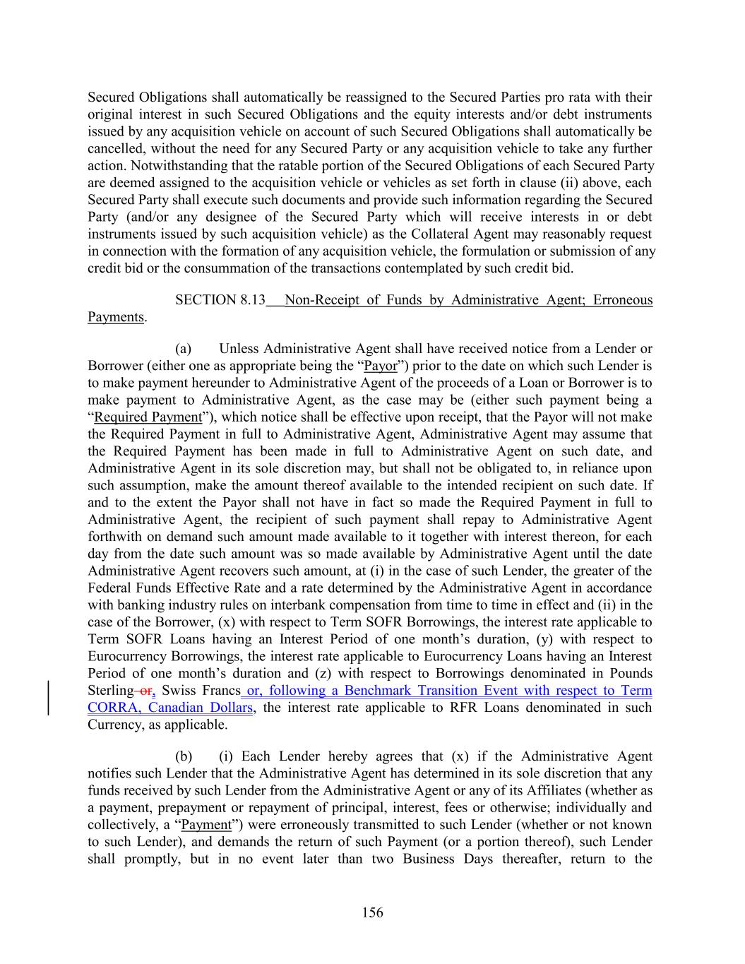 Secured Obligations shall automatically be reassigned to the Secured Parties pro rata with their original interest in such Secured Obligations and the equity interests and/or debt instruments issued by any acquisition vehicle on account of such Secured Obligations shall automatically be cancelled, without the need for any Secured Party or any acquisition vehicle to take any further action. Notwithstanding that the ratable portion of the Secured Obligations of each Secured Party are deemed assigned to the acquisition vehicle or vehicles as set forth in clause (ii) above, each Secured Party shall execute such documents and provide such information regarding the Secured Party (and/or any designee of the Secured Party which will receive interests in or debt instruments issued by such acquisition vehicle) as the Collateral Agent may reasonably request in connection with the formation of any acquisition vehicle, the formulation or submission of any credit bid or the consummation of the transactions contemplated by such credit bid. SECTION 8.13 Non-Receipt of Funds by Administrative Agent; Erroneous Payments. (a) Unless Administrative Agent shall have received notice from a Lender or Borrower (either one as appropriate being the “Payor”) prior to the date on which such Lender is to make payment hereunder to Administrative Agent of the proceeds of a Loan or Borrower is to make payment to Administrative Agent, as the case may be (either such payment being a “Required Payment”), which notice shall be effective upon receipt, that the Payor will not make the Required Payment in full to Administrative Agent, Administrative Agent may assume that the Required Payment has been made in full to Administrative Agent on such date, and Administrative Agent in its sole discretion may, but shall not be obligated to, in reliance upon such assumption, make the amount thereof available to the intended recipient on such date. If and to the extent the Payor shall not have in fact so made the Required Payment in full to Administrative Agent, the recipient of such payment shall repay to Administrative Agent forthwith on demand such amount made available to it together with interest thereon, for each day from the date such amount was so made available by Administrative Agent until the date Administrative Agent recovers such amount, at (i) in the case of such Lender, the greater of the Federal Funds Effective Rate and a rate determined by the Administrative Agent in accordance with banking industry rules on interbank compensation from time to time in effect and (ii) in the case of the Borrower, (x) with respect to Term SOFR Borrowings, the interest rate applicable to Term SOFR Loans having an Interest Period of one month’s duration, (y) with respect to Eurocurrency Borrowings, the interest rate applicable to Eurocurrency Loans having an Interest Period of one month’s duration and (z) with respect to Borrowings denominated in Pounds Sterling or, Swiss Francs or, following a Benchmark Transition Event with respect to Term CORRA, Canadian Dollars, the interest rate applicable to RFR Loans denominated in such Currency, as applicable. (b) (i) Each Lender hereby agrees that (x) if the Administrative Agent notifies such Lender that the Administrative Agent has determined in its sole discretion that any funds received by such Lender from the Administrative Agent or any of its Affiliates (whether as a payment, prepayment or repayment of principal, interest, fees or otherwise; individually and collectively, a “Payment”) were erroneously transmitted to such Lender (whether or not known to such Lender), and demands the return of such Payment (or a portion thereof), such Lender shall promptly, but in no event later than two Business Days thereafter, return to the 156