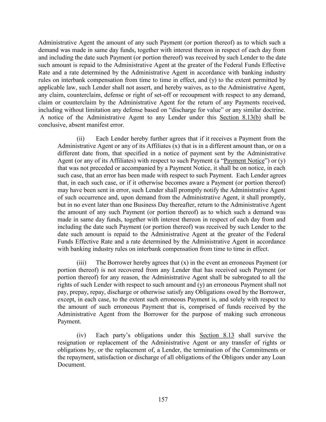 Administrative Agent the amount of any such Payment (or portion thereof) as to which such a demand was made in same day funds, together with interest thereon in respect of each day from and including the date such Payment (or portion thereof) was received by such Lender to the date such amount is repaid to the Administrative Agent at the greater of the Federal Funds Effective Rate and a rate determined by the Administrative Agent in accordance with banking industry rules on interbank compensation from time to time in effect, and (y) to the extent permitted by applicable law, such Lender shall not assert, and hereby waives, as to the Administrative Agent, any claim, counterclaim, defense or right of set-off or recoupment with respect to any demand, claim or counterclaim by the Administrative Agent for the return of any Payments received, including without limitation any defense based on “discharge for value” or any similar doctrine. A notice of the Administrative Agent to any Lender under this Section 8.13(b) shall be conclusive, absent manifest error. (ii) Each Lender hereby further agrees that if it receives a Payment from the Administrative Agent or any of its Affiliates (x) that is in a different amount than, or on a different date from, that specified in a notice of payment sent by the Administrative Agent (or any of its Affiliates) with respect to such Payment (a “Payment Notice”) or (y) that was not preceded or accompanied by a Payment Notice, it shall be on notice, in each such case, that an error has been made with respect to such Payment. Each Lender agrees that, in each such case, or if it otherwise becomes aware a Payment (or portion thereof) may have been sent in error, such Lender shall promptly notify the Administrative Agent of such occurrence and, upon demand from the Administrative Agent, it shall promptly, but in no event later than one Business Day thereafter, return to the Administrative Agent the amount of any such Payment (or portion thereof) as to which such a demand was made in same day funds, together with interest thereon in respect of each day from and including the date such Payment (or portion thereof) was received by such Lender to the date such amount is repaid to the Administrative Agent at the greater of the Federal Funds Effective Rate and a rate determined by the Administrative Agent in accordance with banking industry rules on interbank compensation from time to time in effect. (iii) The Borrower hereby agrees that (x) in the event an erroneous Payment (or portion thereof) is not recovered from any Lender that has received such Payment (or portion thereof) for any reason, the Administrative Agent shall be subrogated to all the rights of such Lender with respect to such amount and (y) an erroneous Payment shall not pay, prepay, repay, discharge or otherwise satisfy any Obligations owed by the Borrower, except, in each case, to the extent such erroneous Payment is, and solely with respect to the amount of such erroneous Payment that is, comprised of funds received by the Administrative Agent from the Borrower for the purpose of making such erroneous Payment. (iv) Each party’s obligations under this Section 8.13 shall survive the resignation or replacement of the Administrative Agent or any transfer of rights or obligations by, or the replacement of, a Lender, the termination of the Commitments or the repayment, satisfaction or discharge of all obligations of the Obligors under any Loan Document. 157