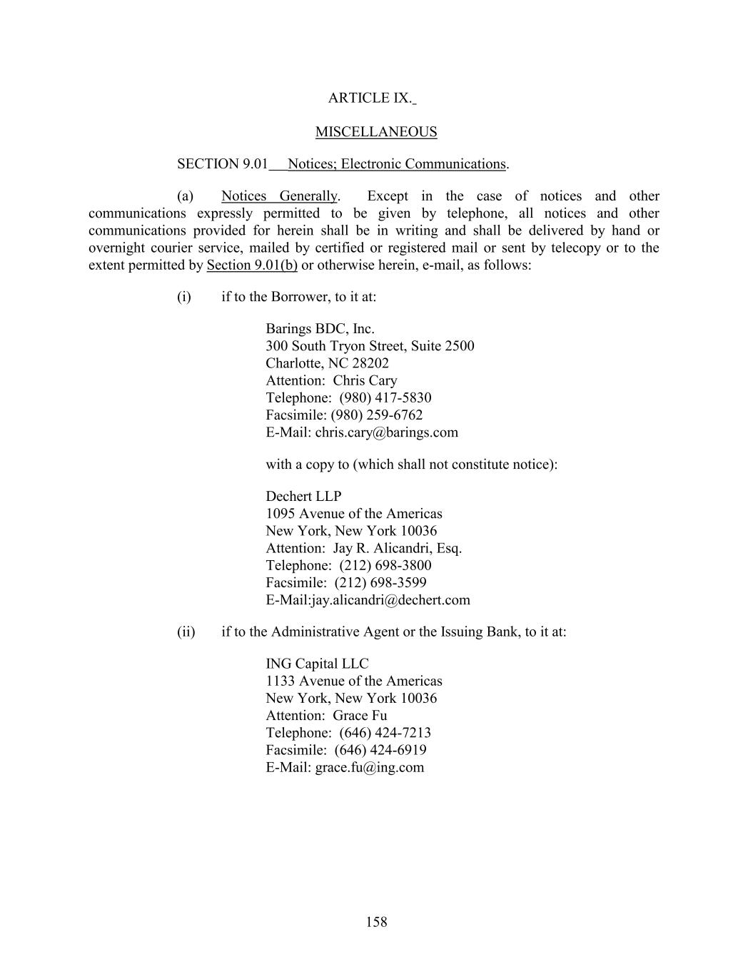 ARTICLE IX. MISCELLANEOUS SECTION 9.01 Notices; Electronic Communications. (a) Notices Generally. Except in the case of notices and other communications expressly permitted to be given by telephone, all notices and other communications provided for herein shall be in writing and shall be delivered by hand or overnight courier service, mailed by certified or registered mail or sent by telecopy or to the extent permitted by Section 9.01(b) or otherwise herein, e-mail, as follows: (i) if to the Borrower, to it at: Barings BDC, Inc. 300 South Tryon Street, Suite 2500 Charlotte, NC 28202 Attention: Chris Cary Telephone: (980) 417-5830 Facsimile: (980) 259-6762 E-Mail: chris.cary@barings.com with a copy to (which shall not constitute notice): Dechert LLP 1095 Avenue of the Americas New York, New York 10036 Attention: Jay R. Alicandri, Esq. Telephone: (212) 698-3800 Facsimile: (212) 698-3599 E-Mail:jay.alicandri@dechert.com (ii) if to the Administrative Agent or the Issuing Bank, to it at: ING Capital LLC 1133 Avenue of the Americas New York, New York 10036 Attention: Grace Fu Telephone: (646) 424-7213 Facsimile: (646) 424-6919 E-Mail: grace.fu@ing.com 158