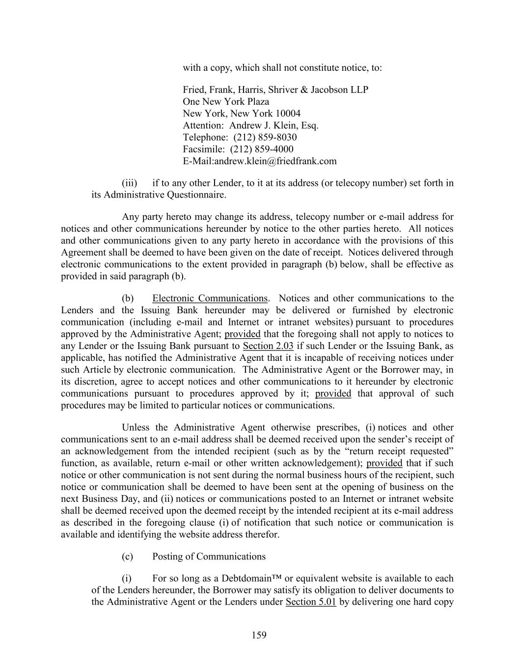 with a copy, which shall not constitute notice, to: Fried, Frank, Harris, Shriver & Jacobson LLP One New York Plaza New York, New York 10004 Attention: Andrew J. Klein, Esq. Telephone: (212) 859-8030 Facsimile: (212) 859-4000 E-Mail:andrew.klein@friedfrank.com (iii) if to any other Lender, to it at its address (or telecopy number) set forth in its Administrative Questionnaire. Any party hereto may change its address, telecopy number or e-mail address for notices and other communications hereunder by notice to the other parties hereto. All notices and other communications given to any party hereto in accordance with the provisions of this Agreement shall be deemed to have been given on the date of receipt. Notices delivered through electronic communications to the extent provided in paragraph (b) below, shall be effective as provided in said paragraph (b). (b) Electronic Communications. Notices and other communications to the Lenders and the Issuing Bank hereunder may be delivered or furnished by electronic communication (including e-mail and Internet or intranet websites) pursuant to procedures approved by the Administrative Agent; provided that the foregoing shall not apply to notices to any Lender or the Issuing Bank pursuant to Section 2.03 if such Lender or the Issuing Bank, as applicable, has notified the Administrative Agent that it is incapable of receiving notices under such Article by electronic communication. The Administrative Agent or the Borrower may, in its discretion, agree to accept notices and other communications to it hereunder by electronic communications pursuant to procedures approved by it; provided that approval of such procedures may be limited to particular notices or communications. Unless the Administrative Agent otherwise prescribes, (i) notices and other communications sent to an e-mail address shall be deemed received upon the sender’s receipt of an acknowledgement from the intended recipient (such as by the “return receipt requested” function, as available, return e-mail or other written acknowledgement); provided that if such notice or other communication is not sent during the normal business hours of the recipient, such notice or communication shall be deemed to have been sent at the opening of business on the next Business Day, and (ii) notices or communications posted to an Internet or intranet website shall be deemed received upon the deemed receipt by the intended recipient at its e-mail address as described in the foregoing clause (i) of notification that such notice or communication is available and identifying the website address therefor. (c) Posting of Communications (i) For so long as a Debtdomain™ or equivalent website is available to each of the Lenders hereunder, the Borrower may satisfy its obligation to deliver documents to the Administrative Agent or the Lenders under Section 5.01 by delivering one hard copy 159