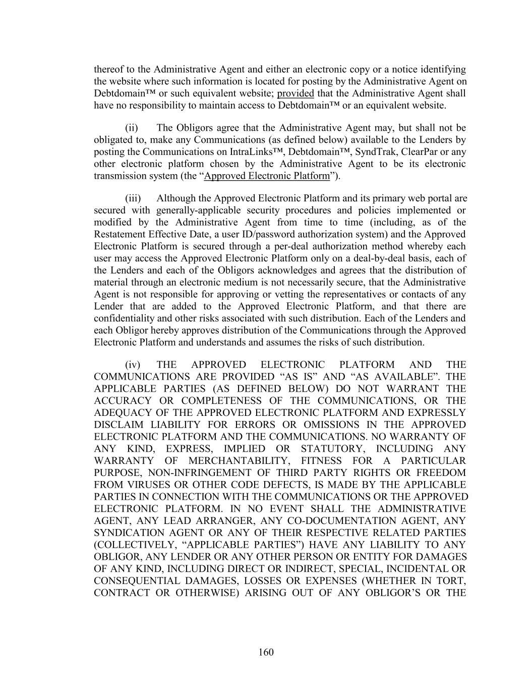 thereof to the Administrative Agent and either an electronic copy or a notice identifying the website where such information is located for posting by the Administrative Agent on Debtdomain™ or such equivalent website; provided that the Administrative Agent shall have no responsibility to maintain access to Debtdomain™ or an equivalent website. (ii) The Obligors agree that the Administrative Agent may, but shall not be obligated to, make any Communications (as defined below) available to the Lenders by posting the Communications on IntraLinks™, Debtdomain™, SyndTrak, ClearPar or any other electronic platform chosen by the Administrative Agent to be its electronic transmission system (the “Approved Electronic Platform”). (iii) Although the Approved Electronic Platform and its primary web portal are secured with generally-applicable security procedures and policies implemented or modified by the Administrative Agent from time to time (including, as of the Restatement Effective Date, a user ID/password authorization system) and the Approved Electronic Platform is secured through a per-deal authorization method whereby each user may access the Approved Electronic Platform only on a deal-by-deal basis, each of the Lenders and each of the Obligors acknowledges and agrees that the distribution of material through an electronic medium is not necessarily secure, that the Administrative Agent is not responsible for approving or vetting the representatives or contacts of any Lender that are added to the Approved Electronic Platform, and that there are confidentiality and other risks associated with such distribution. Each of the Lenders and each Obligor hereby approves distribution of the Communications through the Approved Electronic Platform and understands and assumes the risks of such distribution. (iv) THE APPROVED ELECTRONIC PLATFORM AND THE COMMUNICATIONS ARE PROVIDED “AS IS” AND “AS AVAILABLE”. THE APPLICABLE PARTIES (AS DEFINED BELOW) DO NOT WARRANT THE ACCURACY OR COMPLETENESS OF THE COMMUNICATIONS, OR THE ADEQUACY OF THE APPROVED ELECTRONIC PLATFORM AND EXPRESSLY DISCLAIM LIABILITY FOR ERRORS OR OMISSIONS IN THE APPROVED ELECTRONIC PLATFORM AND THE COMMUNICATIONS. NO WARRANTY OF ANY KIND, EXPRESS, IMPLIED OR STATUTORY, INCLUDING ANY WARRANTY OF MERCHANTABILITY, FITNESS FOR A PARTICULAR PURPOSE, NON-INFRINGEMENT OF THIRD PARTY RIGHTS OR FREEDOM FROM VIRUSES OR OTHER CODE DEFECTS, IS MADE BY THE APPLICABLE PARTIES IN CONNECTION WITH THE COMMUNICATIONS OR THE APPROVED ELECTRONIC PLATFORM. IN NO EVENT SHALL THE ADMINISTRATIVE AGENT, ANY LEAD ARRANGER, ANY CO-DOCUMENTATION AGENT, ANY SYNDICATION AGENT OR ANY OF THEIR RESPECTIVE RELATED PARTIES (COLLECTIVELY, “APPLICABLE PARTIES”) HAVE ANY LIABILITY TO ANY OBLIGOR, ANY LENDER OR ANY OTHER PERSON OR ENTITY FOR DAMAGES OF ANY KIND, INCLUDING DIRECT OR INDIRECT, SPECIAL, INCIDENTAL OR CONSEQUENTIAL DAMAGES, LOSSES OR EXPENSES (WHETHER IN TORT, CONTRACT OR OTHERWISE) ARISING OUT OF ANY OBLIGOR’S OR THE 160