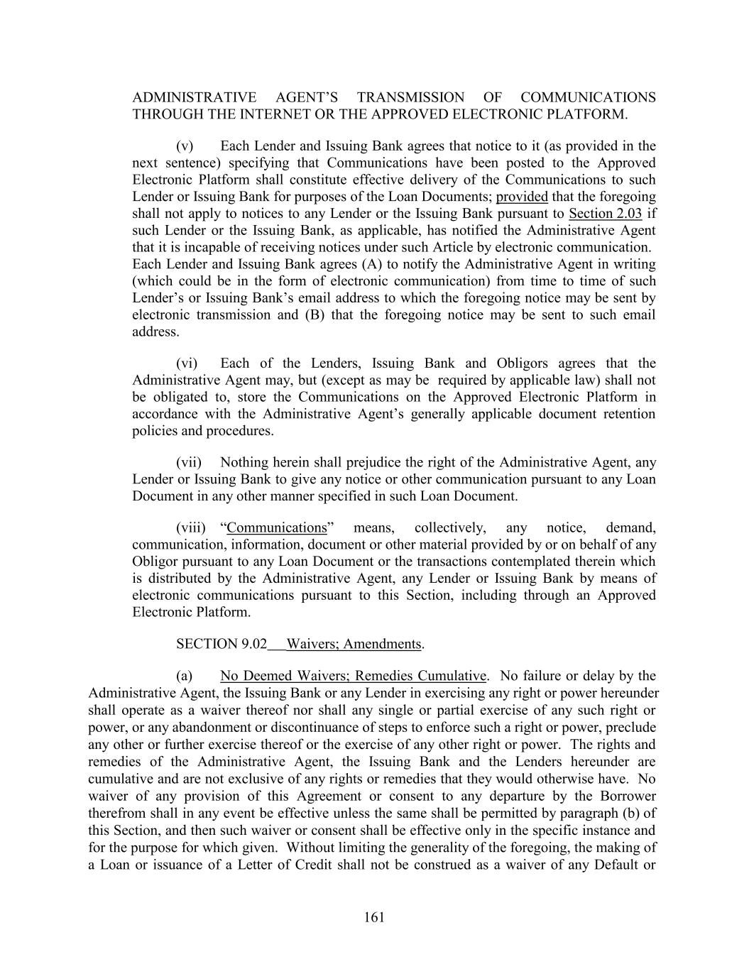 ADMINISTRATIVE AGENT’S TRANSMISSION OF COMMUNICATIONS THROUGH THE INTERNET OR THE APPROVED ELECTRONIC PLATFORM. (v) Each Lender and Issuing Bank agrees that notice to it (as provided in the next sentence) specifying that Communications have been posted to the Approved Electronic Platform shall constitute effective delivery of the Communications to such Lender or Issuing Bank for purposes of the Loan Documents; provided that the foregoing shall not apply to notices to any Lender or the Issuing Bank pursuant to Section 2.03 if such Lender or the Issuing Bank, as applicable, has notified the Administrative Agent that it is incapable of receiving notices under such Article by electronic communication. Each Lender and Issuing Bank agrees (A) to notify the Administrative Agent in writing (which could be in the form of electronic communication) from time to time of such Lender’s or Issuing Bank’s email address to which the foregoing notice may be sent by electronic transmission and (B) that the foregoing notice may be sent to such email address. (vi) Each of the Lenders, Issuing Bank and Obligors agrees that the Administrative Agent may, but (except as may be required by applicable law) shall not be obligated to, store the Communications on the Approved Electronic Platform in accordance with the Administrative Agent’s generally applicable document retention policies and procedures. (vii) Nothing herein shall prejudice the right of the Administrative Agent, any Lender or Issuing Bank to give any notice or other communication pursuant to any Loan Document in any other manner specified in such Loan Document. (viii) “Communications” means, collectively, any notice, demand, communication, information, document or other material provided by or on behalf of any Obligor pursuant to any Loan Document or the transactions contemplated therein which is distributed by the Administrative Agent, any Lender or Issuing Bank by means of electronic communications pursuant to this Section, including through an Approved Electronic Platform. SECTION 9.02 Waivers; Amendments. (a) No Deemed Waivers; Remedies Cumulative. No failure or delay by the Administrative Agent, the Issuing Bank or any Lender in exercising any right or power hereunder shall operate as a waiver thereof nor shall any single or partial exercise of any such right or power, or any abandonment or discontinuance of steps to enforce such a right or power, preclude any other or further exercise thereof or the exercise of any other right or power. The rights and remedies of the Administrative Agent, the Issuing Bank and the Lenders hereunder are cumulative and are not exclusive of any rights or remedies that they would otherwise have. No waiver of any provision of this Agreement or consent to any departure by the Borrower therefrom shall in any event be effective unless the same shall be permitted by paragraph (b) of this Section, and then such waiver or consent shall be effective only in the specific instance and for the purpose for which given. Without limiting the generality of the foregoing, the making of a Loan or issuance of a Letter of Credit shall not be construed as a waiver of any Default or 161
