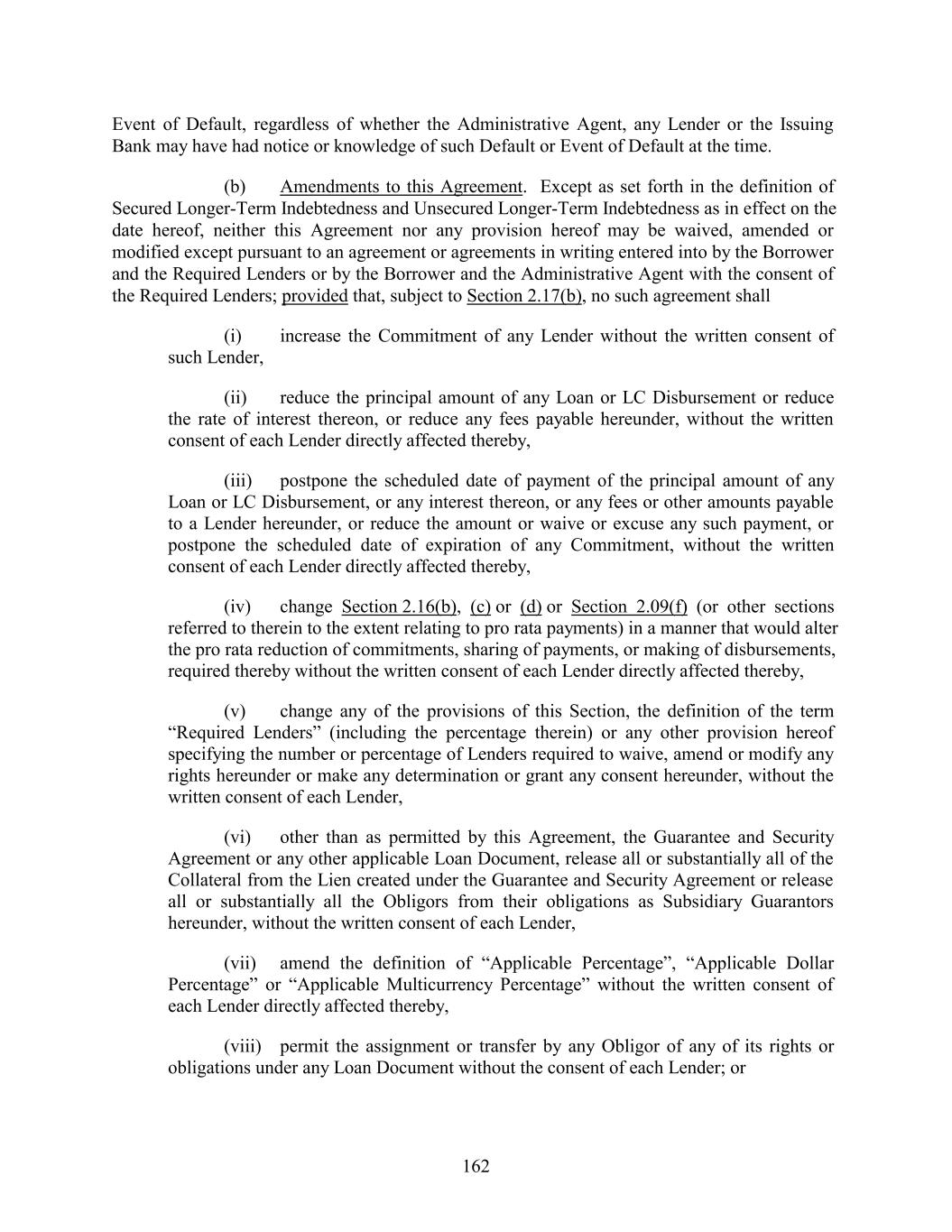 Event of Default, regardless of whether the Administrative Agent, any Lender or the Issuing Bank may have had notice or knowledge of such Default or Event of Default at the time. (b) Amendments to this Agreement. Except as set forth in the definition of Secured Longer-Term Indebtedness and Unsecured Longer-Term Indebtedness as in effect on the date hereof, neither this Agreement nor any provision hereof may be waived, amended or modified except pursuant to an agreement or agreements in writing entered into by the Borrower and the Required Lenders or by the Borrower and the Administrative Agent with the consent of the Required Lenders; provided that, subject to Section 2.17(b), no such agreement shall (i) increase the Commitment of any Lender without the written consent of such Lender, (ii) reduce the principal amount of any Loan or LC Disbursement or reduce the rate of interest thereon, or reduce any fees payable hereunder, without the written consent of each Lender directly affected thereby, (iii) postpone the scheduled date of payment of the principal amount of any Loan or LC Disbursement, or any interest thereon, or any fees or other amounts payable to a Lender hereunder, or reduce the amount or waive or excuse any such payment, or postpone the scheduled date of expiration of any Commitment, without the written consent of each Lender directly affected thereby, (iv) change Section 2.16(b), (c) or (d) or Section 2.09(f) (or other sections referred to therein to the extent relating to pro rata payments) in a manner that would alter the pro rata reduction of commitments, sharing of payments, or making of disbursements, required thereby without the written consent of each Lender directly affected thereby, (v) change any of the provisions of this Section, the definition of the term “Required Lenders” (including the percentage therein) or any other provision hereof specifying the number or percentage of Lenders required to waive, amend or modify any rights hereunder or make any determination or grant any consent hereunder, without the written consent of each Lender, (vi) other than as permitted by this Agreement, the Guarantee and Security Agreement or any other applicable Loan Document, release all or substantially all of the Collateral from the Lien created under the Guarantee and Security Agreement or release all or substantially all the Obligors from their obligations as Subsidiary Guarantors hereunder, without the written consent of each Lender, (vii) amend the definition of “Applicable Percentage”, “Applicable Dollar Percentage” or “Applicable Multicurrency Percentage” without the written consent of each Lender directly affected thereby, (viii) permit the assignment or transfer by any Obligor of any of its rights or obligations under any Loan Document without the consent of each Lender; or 162