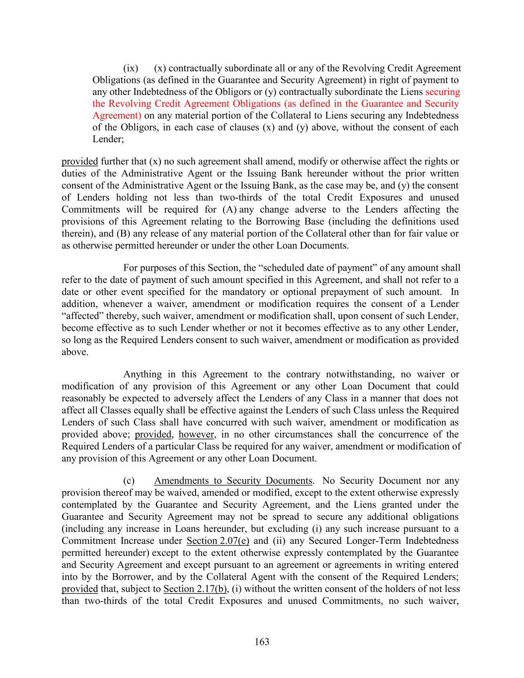 (ix) (x) contractually subordinate all or any of the Revolving Credit Agreement Obligations (as defined in the Guarantee and Security Agreement) in right of payment to any other Indebtedness of the Obligors or (y) contractually subordinate the Liens securing the Revolving Credit Agreement Obligations (as defined in the Guarantee and Security Agreement) on any material portion of the Collateral to Liens securing any Indebtedness of the Obligors, in each case of clauses (x) and (y) above, without the consent of each Lender; provided further that (x) no such agreement shall amend, modify or otherwise affect the rights or duties of the Administrative Agent or the Issuing Bank hereunder without the prior written consent of the Administrative Agent or the Issuing Bank, as the case may be, and (y) the consent of Lenders holding not less than two-thirds of the total Credit Exposures and unused Commitments will be required for (A) any change adverse to the Lenders affecting the provisions of this Agreement relating to the Borrowing Base (including the definitions used therein), and (B) any release of any material portion of the Collateral other than for fair value or as otherwise permitted hereunder or under the other Loan Documents. For purposes of this Section, the “scheduled date of payment” of any amount shall refer to the date of payment of such amount specified in this Agreement, and shall not refer to a date or other event specified for the mandatory or optional prepayment of such amount. In addition, whenever a waiver, amendment or modification requires the consent of a Lender “affected” thereby, such waiver, amendment or modification shall, upon consent of such Lender, become effective as to such Lender whether or not it becomes effective as to any other Lender, so long as the Required Lenders consent to such waiver, amendment or modification as provided above. Anything in this Agreement to the contrary notwithstanding, no waiver or modification of any provision of this Agreement or any other Loan Document that could reasonably be expected to adversely affect the Lenders of any Class in a manner that does not affect all Classes equally shall be effective against the Lenders of such Class unless the Required Lenders of such Class shall have concurred with such waiver, amendment or modification as provided above; provided, however, in no other circumstances shall the concurrence of the Required Lenders of a particular Class be required for any waiver, amendment or modification of any provision of this Agreement or any other Loan Document. (c) Amendments to Security Documents. No Security Document nor any provision thereof may be waived, amended or modified, except to the extent otherwise expressly contemplated by the Guarantee and Security Agreement, and the Liens granted under the Guarantee and Security Agreement may not be spread to secure any additional obligations (including any increase in Loans hereunder, but excluding (i) any such increase pursuant to a Commitment Increase under Section 2.07(e) and (ii) any Secured Longer-Term Indebtedness permitted hereunder) except to the extent otherwise expressly contemplated by the Guarantee and Security Agreement and except pursuant to an agreement or agreements in writing entered into by the Borrower, and by the Collateral Agent with the consent of the Required Lenders; provided that, subject to Section 2.17(b), (i) without the written consent of the holders of not less than two-thirds of the total Credit Exposures and unused Commitments, no such waiver, 163