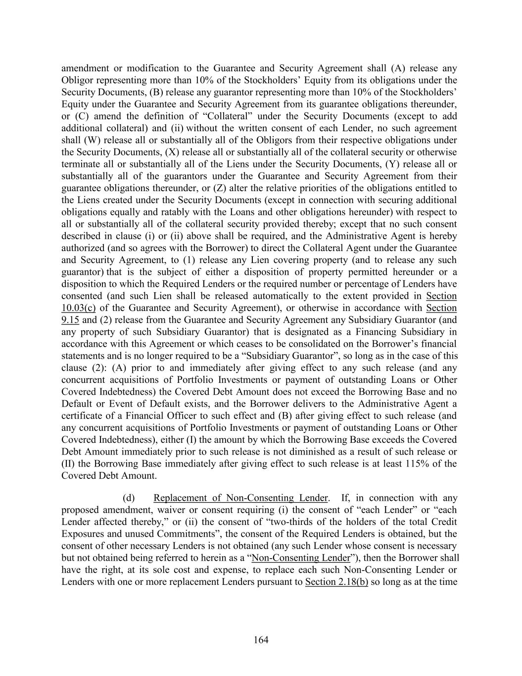 amendment or modification to the Guarantee and Security Agreement shall (A) release any Obligor representing more than 10% of the Stockholders’ Equity from its obligations under the Security Documents, (B) release any guarantor representing more than 10% of the Stockholders’ Equity under the Guarantee and Security Agreement from its guarantee obligations thereunder, or (C) amend the definition of “Collateral” under the Security Documents (except to add additional collateral) and (ii) without the written consent of each Lender, no such agreement shall (W) release all or substantially all of the Obligors from their respective obligations under the Security Documents, (X) release all or substantially all of the collateral security or otherwise terminate all or substantially all of the Liens under the Security Documents, (Y) release all or substantially all of the guarantors under the Guarantee and Security Agreement from their guarantee obligations thereunder, or (Z) alter the relative priorities of the obligations entitled to the Liens created under the Security Documents (except in connection with securing additional obligations equally and ratably with the Loans and other obligations hereunder) with respect to all or substantially all of the collateral security provided thereby; except that no such consent described in clause (i) or (ii) above shall be required, and the Administrative Agent is hereby authorized (and so agrees with the Borrower) to direct the Collateral Agent under the Guarantee and Security Agreement, to (1) release any Lien covering property (and to release any such guarantor) that is the subject of either a disposition of property permitted hereunder or a disposition to which the Required Lenders or the required number or percentage of Lenders have consented (and such Lien shall be released automatically to the extent provided in Section 10.03(c) of the Guarantee and Security Agreement), or otherwise in accordance with Section 9.15 and (2) release from the Guarantee and Security Agreement any Subsidiary Guarantor (and any property of such Subsidiary Guarantor) that is designated as a Financing Subsidiary in accordance with this Agreement or which ceases to be consolidated on the Borrower’s financial statements and is no longer required to be a “Subsidiary Guarantor”, so long as in the case of this clause (2): (A) prior to and immediately after giving effect to any such release (and any concurrent acquisitions of Portfolio Investments or payment of outstanding Loans or Other Covered Indebtedness) the Covered Debt Amount does not exceed the Borrowing Base and no Default or Event of Default exists, and the Borrower delivers to the Administrative Agent a certificate of a Financial Officer to such effect and (B) after giving effect to such release (and any concurrent acquisitions of Portfolio Investments or payment of outstanding Loans or Other Covered Indebtedness), either (I) the amount by which the Borrowing Base exceeds the Covered Debt Amount immediately prior to such release is not diminished as a result of such release or (II) the Borrowing Base immediately after giving effect to such release is at least 115% of the Covered Debt Amount. (d) Replacement of Non-Consenting Lender. If, in connection with any proposed amendment, waiver or consent requiring (i) the consent of “each Lender” or “each Lender affected thereby,” or (ii) the consent of “two-thirds of the holders of the total Credit Exposures and unused Commitments”, the consent of the Required Lenders is obtained, but the consent of other necessary Lenders is not obtained (any such Lender whose consent is necessary but not obtained being referred to herein as a “Non-Consenting Lender”), then the Borrower shall have the right, at its sole cost and expense, to replace each such Non-Consenting Lender or Lenders with one or more replacement Lenders pursuant to Section 2.18(b) so long as at the time 164