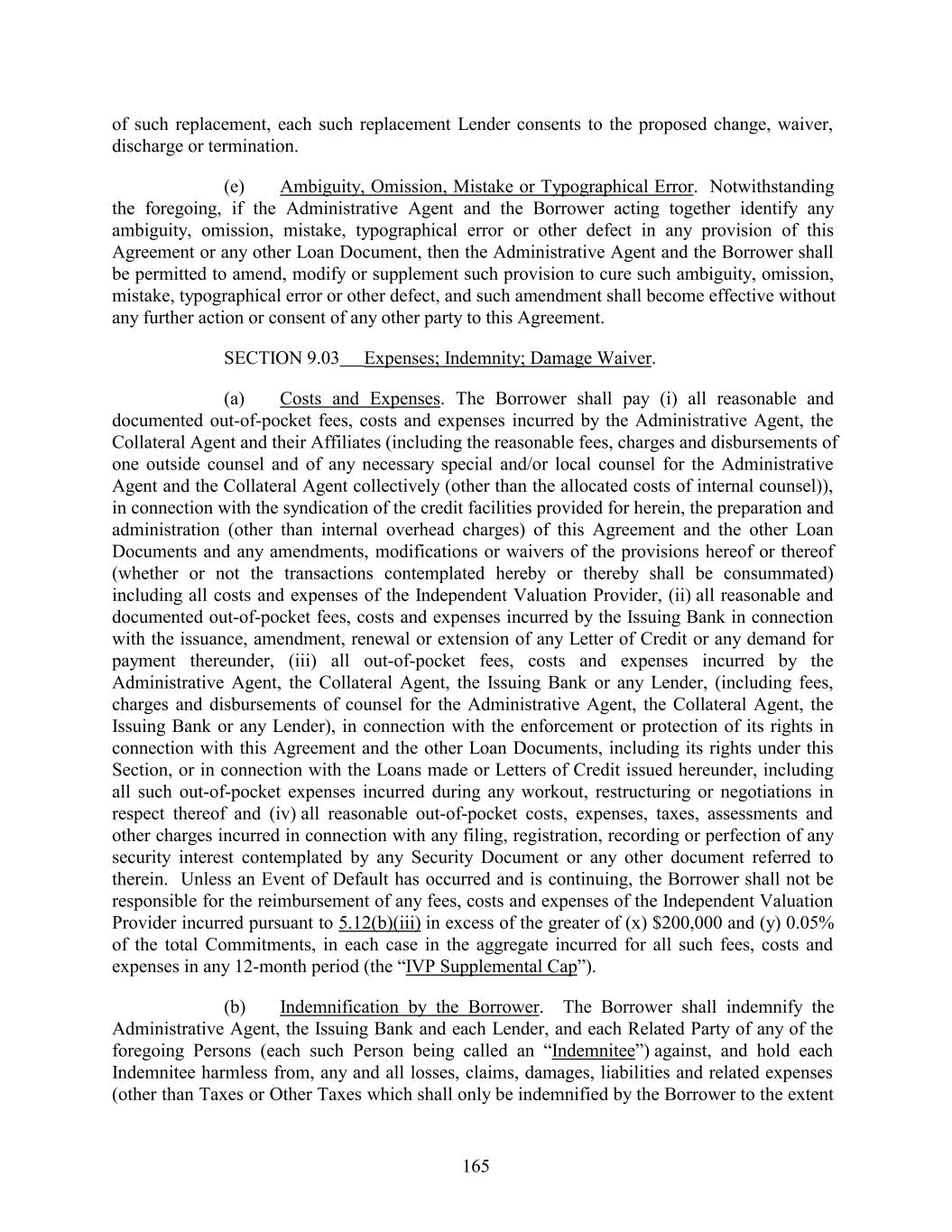 of such replacement, each such replacement Lender consents to the proposed change, waiver, discharge or termination. (e) Ambiguity, Omission, Mistake or Typographical Error. Notwithstanding the foregoing, if the Administrative Agent and the Borrower acting together identify any ambiguity, omission, mistake, typographical error or other defect in any provision of this Agreement or any other Loan Document, then the Administrative Agent and the Borrower shall be permitted to amend, modify or supplement such provision to cure such ambiguity, omission, mistake, typographical error or other defect, and such amendment shall become effective without any further action or consent of any other party to this Agreement. SECTION 9.03 Expenses; Indemnity; Damage Waiver. (a) Costs and Expenses. The Borrower shall pay (i) all reasonable and documented out-of-pocket fees, costs and expenses incurred by the Administrative Agent, the Collateral Agent and their Affiliates (including the reasonable fees, charges and disbursements of one outside counsel and of any necessary special and/or local counsel for the Administrative Agent and the Collateral Agent collectively (other than the allocated costs of internal counsel)), in connection with the syndication of the credit facilities provided for herein, the preparation and administration (other than internal overhead charges) of this Agreement and the other Loan Documents and any amendments, modifications or waivers of the provisions hereof or thereof (whether or not the transactions contemplated hereby or thereby shall be consummated) including all costs and expenses of the Independent Valuation Provider, (ii) all reasonable and documented out-of-pocket fees, costs and expenses incurred by the Issuing Bank in connection with the issuance, amendment, renewal or extension of any Letter of Credit or any demand for payment thereunder, (iii) all out-of-pocket fees, costs and expenses incurred by the Administrative Agent, the Collateral Agent, the Issuing Bank or any Lender, (including fees, charges and disbursements of counsel for the Administrative Agent, the Collateral Agent, the Issuing Bank or any Lender), in connection with the enforcement or protection of its rights in connection with this Agreement and the other Loan Documents, including its rights under this Section, or in connection with the Loans made or Letters of Credit issued hereunder, including all such out-of-pocket expenses incurred during any workout, restructuring or negotiations in respect thereof and (iv) all reasonable out-of-pocket costs, expenses, taxes, assessments and other charges incurred in connection with any filing, registration, recording or perfection of any security interest contemplated by any Security Document or any other document referred to therein. Unless an Event of Default has occurred and is continuing, the Borrower shall not be responsible for the reimbursement of any fees, costs and expenses of the Independent Valuation Provider incurred pursuant to 5.12(b)(iii) in excess of the greater of (x) $200,000 and (y) 0.05% of the total Commitments, in each case in the aggregate incurred for all such fees, costs and expenses in any 12-month period (the “IVP Supplemental Cap”). (b) Indemnification by the Borrower. The Borrower shall indemnify the Administrative Agent, the Issuing Bank and each Lender, and each Related Party of any of the foregoing Persons (each such Person being called an “Indemnitee”) against, and hold each Indemnitee harmless from, any and all losses, claims, damages, liabilities and related expenses (other than Taxes or Other Taxes which shall only be indemnified by the Borrower to the extent 165