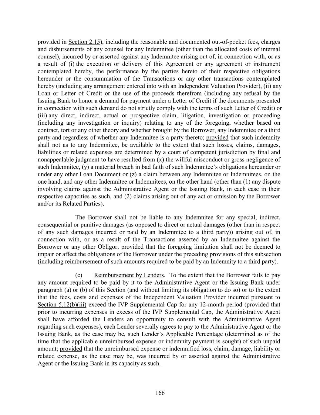provided in Section 2.15), including the reasonable and documented out-of-pocket fees, charges and disbursements of any counsel for any Indemnitee (other than the allocated costs of internal counsel), incurred by or asserted against any Indemnitee arising out of, in connection with, or as a result of (i) the execution or delivery of this Agreement or any agreement or instrument contemplated hereby, the performance by the parties hereto of their respective obligations hereunder or the consummation of the Transactions or any other transactions contemplated hereby (including any arrangement entered into with an Independent Valuation Provider), (ii) any Loan or Letter of Credit or the use of the proceeds therefrom (including any refusal by the Issuing Bank to honor a demand for payment under a Letter of Credit if the documents presented in connection with such demand do not strictly comply with the terms of such Letter of Credit) or (iii) any direct, indirect, actual or prospective claim, litigation, investigation or proceeding (including any investigation or inquiry) relating to any of the foregoing, whether based on contract, tort or any other theory and whether brought by the Borrower, any Indemnitee or a third party and regardless of whether any Indemnitee is a party thereto; provided that such indemnity shall not as to any Indemnitee, be available to the extent that such losses, claims, damages, liabilities or related expenses are determined by a court of competent jurisdiction by final and nonappealable judgment to have resulted from (x) the willful misconduct or gross negligence of such Indemnitee, (y) a material breach in bad faith of such Indemnitee’s obligations hereunder or under any other Loan Document or (z) a claim between any Indemnitee or Indemnitees, on the one hand, and any other Indemnitee or Indemnitees, on the other hand (other than (1) any dispute involving claims against the Administrative Agent or the Issuing Bank, in each case in their respective capacities as such, and (2) claims arising out of any act or omission by the Borrower and/or its Related Parties). The Borrower shall not be liable to any Indemnitee for any special, indirect, consequential or punitive damages (as opposed to direct or actual damages (other than in respect of any such damages incurred or paid by an Indemnitee to a third party)) arising out of, in connection with, or as a result of the Transactions asserted by an Indemnitee against the Borrower or any other Obligor; provided that the foregoing limitation shall not be deemed to impair or affect the obligations of the Borrower under the preceding provisions of this subsection (including reimbursement of such amounts required to be paid by an Indemnity to a third party). (c) Reimbursement by Lenders. To the extent that the Borrower fails to pay any amount required to be paid by it to the Administrative Agent or the Issuing Bank under paragraph (a) or (b) of this Section (and without limiting its obligation to do so) or to the extent that the fees, costs and expenses of the Independent Valuation Provider incurred pursuant to Section 5.12(b)(iii) exceed the IVP Supplemental Cap for any 12-month period (provided that prior to incurring expenses in excess of the IVP Supplemental Cap, the Administrative Agent shall have afforded the Lenders an opportunity to consult with the Administrative Agent regarding such expenses), each Lender severally agrees to pay to the Administrative Agent or the Issuing Bank, as the case may be, such Lender’s Applicable Percentage (determined as of the time that the applicable unreimbursed expense or indemnity payment is sought) of such unpaid amount; provided that the unreimbursed expense or indemnified loss, claim, damage, liability or related expense, as the case may be, was incurred by or asserted against the Administrative Agent or the Issuing Bank in its capacity as such. 166