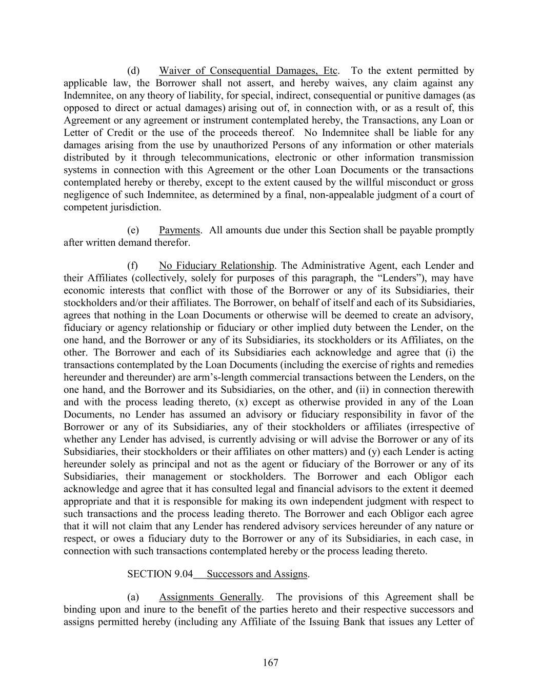 (d) Waiver of Consequential Damages, Etc. To the extent permitted by applicable law, the Borrower shall not assert, and hereby waives, any claim against any Indemnitee, on any theory of liability, for special, indirect, consequential or punitive damages (as opposed to direct or actual damages) arising out of, in connection with, or as a result of, this Agreement or any agreement or instrument contemplated hereby, the Transactions, any Loan or Letter of Credit or the use of the proceeds thereof. No Indemnitee shall be liable for any damages arising from the use by unauthorized Persons of any information or other materials distributed by it through telecommunications, electronic or other information transmission systems in connection with this Agreement or the other Loan Documents or the transactions contemplated hereby or thereby, except to the extent caused by the willful misconduct or gross negligence of such Indemnitee, as determined by a final, non-appealable judgment of a court of competent jurisdiction. (e) Payments. All amounts due under this Section shall be payable promptly after written demand therefor. (f) No Fiduciary Relationship. The Administrative Agent, each Lender and their Affiliates (collectively, solely for purposes of this paragraph, the “Lenders”), may have economic interests that conflict with those of the Borrower or any of its Subsidiaries, their stockholders and/or their affiliates. The Borrower, on behalf of itself and each of its Subsidiaries, agrees that nothing in the Loan Documents or otherwise will be deemed to create an advisory, fiduciary or agency relationship or fiduciary or other implied duty between the Lender, on the one hand, and the Borrower or any of its Subsidiaries, its stockholders or its Affiliates, on the other. The Borrower and each of its Subsidiaries each acknowledge and agree that (i) the transactions contemplated by the Loan Documents (including the exercise of rights and remedies hereunder and thereunder) are arm’s-length commercial transactions between the Lenders, on the one hand, and the Borrower and its Subsidiaries, on the other, and (ii) in connection therewith and with the process leading thereto, (x) except as otherwise provided in any of the Loan Documents, no Lender has assumed an advisory or fiduciary responsibility in favor of the Borrower or any of its Subsidiaries, any of their stockholders or affiliates (irrespective of whether any Lender has advised, is currently advising or will advise the Borrower or any of its Subsidiaries, their stockholders or their affiliates on other matters) and (y) each Lender is acting hereunder solely as principal and not as the agent or fiduciary of the Borrower or any of its Subsidiaries, their management or stockholders. The Borrower and each Obligor each acknowledge and agree that it has consulted legal and financial advisors to the extent it deemed appropriate and that it is responsible for making its own independent judgment with respect to such transactions and the process leading thereto. The Borrower and each Obligor each agree that it will not claim that any Lender has rendered advisory services hereunder of any nature or respect, or owes a fiduciary duty to the Borrower or any of its Subsidiaries, in each case, in connection with such transactions contemplated hereby or the process leading thereto. SECTION 9.04 Successors and Assigns. (a) Assignments Generally. The provisions of this Agreement shall be binding upon and inure to the benefit of the parties hereto and their respective successors and assigns permitted hereby (including any Affiliate of the Issuing Bank that issues any Letter of 167