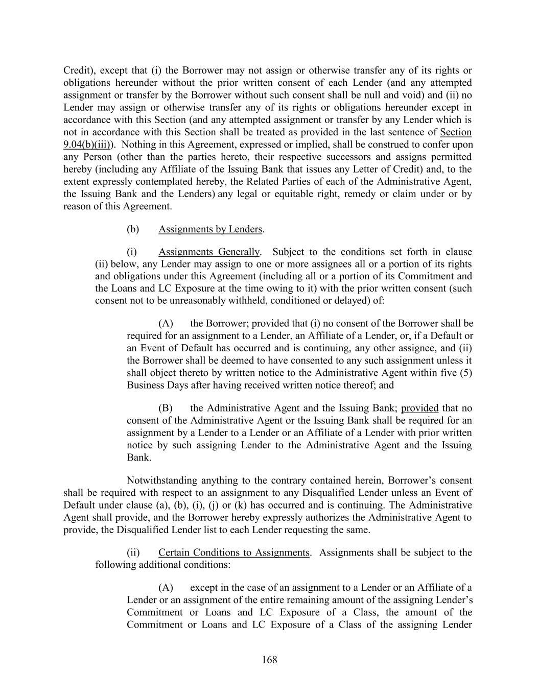 Credit), except that (i) the Borrower may not assign or otherwise transfer any of its rights or obligations hereunder without the prior written consent of each Lender (and any attempted assignment or transfer by the Borrower without such consent shall be null and void) and (ii) no Lender may assign or otherwise transfer any of its rights or obligations hereunder except in accordance with this Section (and any attempted assignment or transfer by any Lender which is not in accordance with this Section shall be treated as provided in the last sentence of Section 9.04(b)(iii)). Nothing in this Agreement, expressed or implied, shall be construed to confer upon any Person (other than the parties hereto, their respective successors and assigns permitted hereby (including any Affiliate of the Issuing Bank that issues any Letter of Credit) and, to the extent expressly contemplated hereby, the Related Parties of each of the Administrative Agent, the Issuing Bank and the Lenders) any legal or equitable right, remedy or claim under or by reason of this Agreement. (b) Assignments by Lenders. (i) Assignments Generally. Subject to the conditions set forth in clause (ii) below, any Lender may assign to one or more assignees all or a portion of its rights and obligations under this Agreement (including all or a portion of its Commitment and the Loans and LC Exposure at the time owing to it) with the prior written consent (such consent not to be unreasonably withheld, conditioned or delayed) of: (A) the Borrower; provided that (i) no consent of the Borrower shall be required for an assignment to a Lender, an Affiliate of a Lender, or, if a Default or an Event of Default has occurred and is continuing, any other assignee, and (ii) the Borrower shall be deemed to have consented to any such assignment unless it shall object thereto by written notice to the Administrative Agent within five (5) Business Days after having received written notice thereof; and (B) the Administrative Agent and the Issuing Bank; provided that no consent of the Administrative Agent or the Issuing Bank shall be required for an assignment by a Lender to a Lender or an Affiliate of a Lender with prior written notice by such assigning Lender to the Administrative Agent and the Issuing Bank. Notwithstanding anything to the contrary contained herein, Borrower’s consent shall be required with respect to an assignment to any Disqualified Lender unless an Event of Default under clause (a), (b), (i), (j) or (k) has occurred and is continuing. The Administrative Agent shall provide, and the Borrower hereby expressly authorizes the Administrative Agent to provide, the Disqualified Lender list to each Lender requesting the same. (ii) Certain Conditions to Assignments. Assignments shall be subject to the following additional conditions: (A) except in the case of an assignment to a Lender or an Affiliate of a Lender or an assignment of the entire remaining amount of the assigning Lender’s Commitment or Loans and LC Exposure of a Class, the amount of the Commitment or Loans and LC Exposure of a Class of the assigning Lender 168
