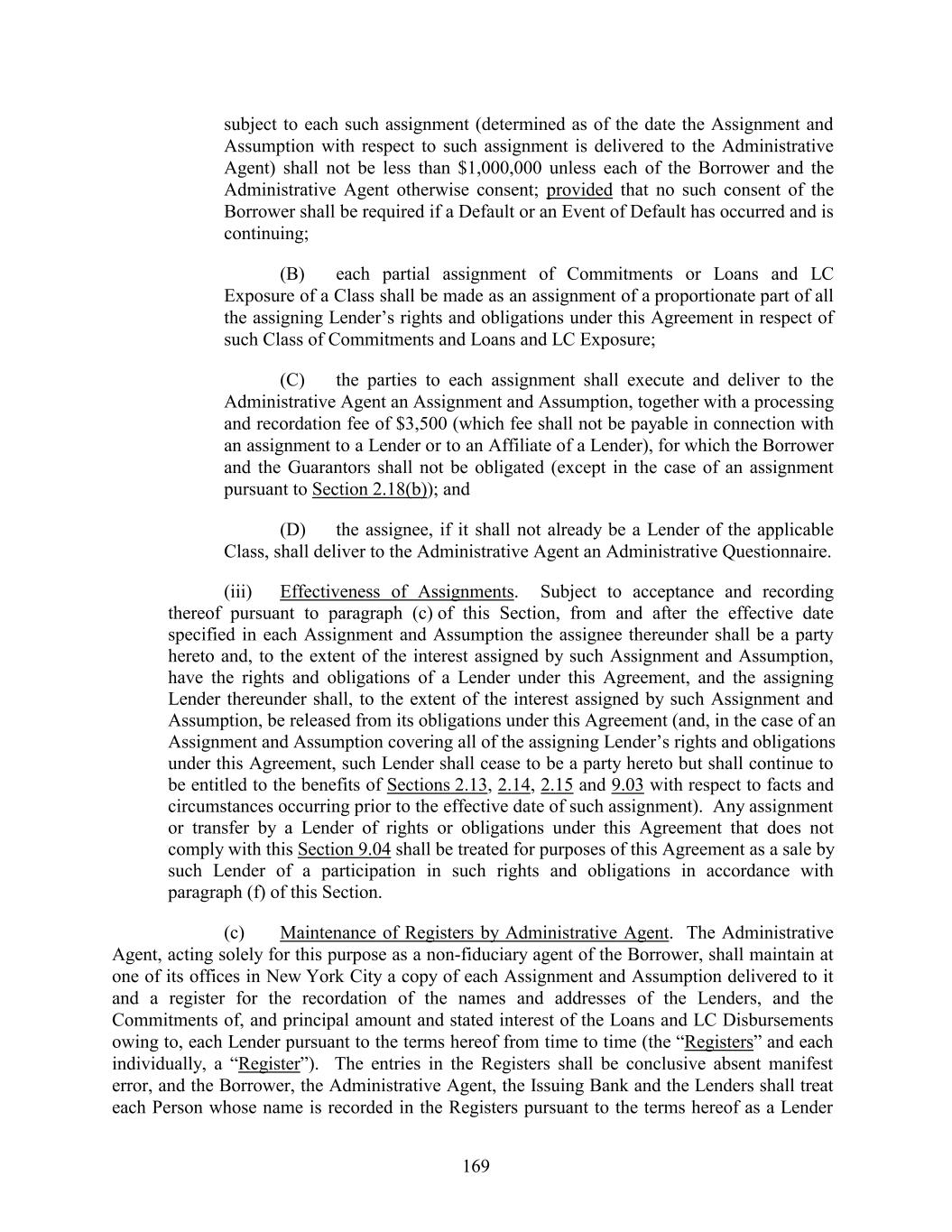 subject to each such assignment (determined as of the date the Assignment and Assumption with respect to such assignment is delivered to the Administrative Agent) shall not be less than $1,000,000 unless each of the Borrower and the Administrative Agent otherwise consent; provided that no such consent of the Borrower shall be required if a Default or an Event of Default has occurred and is continuing; (B) each partial assignment of Commitments or Loans and LC Exposure of a Class shall be made as an assignment of a proportionate part of all the assigning Lender’s rights and obligations under this Agreement in respect of such Class of Commitments and Loans and LC Exposure; (C) the parties to each assignment shall execute and deliver to the Administrative Agent an Assignment and Assumption, together with a processing and recordation fee of $3,500 (which fee shall not be payable in connection with an assignment to a Lender or to an Affiliate of a Lender), for which the Borrower and the Guarantors shall not be obligated (except in the case of an assignment pursuant to Section 2.18(b)); and (D) the assignee, if it shall not already be a Lender of the applicable Class, shall deliver to the Administrative Agent an Administrative Questionnaire. (iii) Effectiveness of Assignments. Subject to acceptance and recording thereof pursuant to paragraph (c) of this Section, from and after the effective date specified in each Assignment and Assumption the assignee thereunder shall be a party hereto and, to the extent of the interest assigned by such Assignment and Assumption, have the rights and obligations of a Lender under this Agreement, and the assigning Lender thereunder shall, to the extent of the interest assigned by such Assignment and Assumption, be released from its obligations under this Agreement (and, in the case of an Assignment and Assumption covering all of the assigning Lender’s rights and obligations under this Agreement, such Lender shall cease to be a party hereto but shall continue to be entitled to the benefits of Sections 2.13, 2.14, 2.15 and 9.03 with respect to facts and circumstances occurring prior to the effective date of such assignment). Any assignment or transfer by a Lender of rights or obligations under this Agreement that does not comply with this Section 9.04 shall be treated for purposes of this Agreement as a sale by such Lender of a participation in such rights and obligations in accordance with paragraph (f) of this Section. (c) Maintenance of Registers by Administrative Agent. The Administrative Agent, acting solely for this purpose as a non-fiduciary agent of the Borrower, shall maintain at one of its offices in New York City a copy of each Assignment and Assumption delivered to it and a register for the recordation of the names and addresses of the Lenders, and the Commitments of, and principal amount and stated interest of the Loans and LC Disbursements owing to, each Lender pursuant to the terms hereof from time to time (the “Registers” and each individually, a “Register”). The entries in the Registers shall be conclusive absent manifest error, and the Borrower, the Administrative Agent, the Issuing Bank and the Lenders shall treat each Person whose name is recorded in the Registers pursuant to the terms hereof as a Lender 169