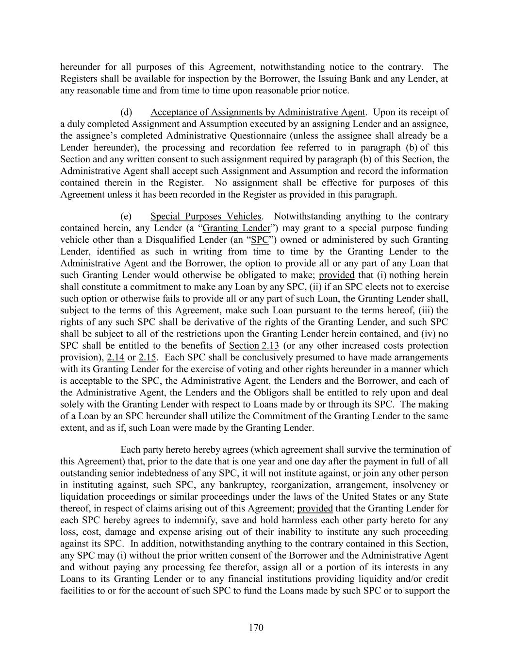 hereunder for all purposes of this Agreement, notwithstanding notice to the contrary. The Registers shall be available for inspection by the Borrower, the Issuing Bank and any Lender, at any reasonable time and from time to time upon reasonable prior notice. (d) Acceptance of Assignments by Administrative Agent. Upon its receipt of a duly completed Assignment and Assumption executed by an assigning Lender and an assignee, the assignee’s completed Administrative Questionnaire (unless the assignee shall already be a Lender hereunder), the processing and recordation fee referred to in paragraph (b) of this Section and any written consent to such assignment required by paragraph (b) of this Section, the Administrative Agent shall accept such Assignment and Assumption and record the information contained therein in the Register. No assignment shall be effective for purposes of this Agreement unless it has been recorded in the Register as provided in this paragraph. (e) Special Purposes Vehicles. Notwithstanding anything to the contrary contained herein, any Lender (a “Granting Lender”) may grant to a special purpose funding vehicle other than a Disqualified Lender (an “SPC”) owned or administered by such Granting Lender, identified as such in writing from time to time by the Granting Lender to the Administrative Agent and the Borrower, the option to provide all or any part of any Loan that such Granting Lender would otherwise be obligated to make; provided that (i) nothing herein shall constitute a commitment to make any Loan by any SPC, (ii) if an SPC elects not to exercise such option or otherwise fails to provide all or any part of such Loan, the Granting Lender shall, subject to the terms of this Agreement, make such Loan pursuant to the terms hereof, (iii) the rights of any such SPC shall be derivative of the rights of the Granting Lender, and such SPC shall be subject to all of the restrictions upon the Granting Lender herein contained, and (iv) no SPC shall be entitled to the benefits of Section 2.13 (or any other increased costs protection provision), 2.14 or 2.15. Each SPC shall be conclusively presumed to have made arrangements with its Granting Lender for the exercise of voting and other rights hereunder in a manner which is acceptable to the SPC, the Administrative Agent, the Lenders and the Borrower, and each of the Administrative Agent, the Lenders and the Obligors shall be entitled to rely upon and deal solely with the Granting Lender with respect to Loans made by or through its SPC. The making of a Loan by an SPC hereunder shall utilize the Commitment of the Granting Lender to the same extent, and as if, such Loan were made by the Granting Lender. Each party hereto hereby agrees (which agreement shall survive the termination of this Agreement) that, prior to the date that is one year and one day after the payment in full of all outstanding senior indebtedness of any SPC, it will not institute against, or join any other person in instituting against, such SPC, any bankruptcy, reorganization, arrangement, insolvency or liquidation proceedings or similar proceedings under the laws of the United States or any State thereof, in respect of claims arising out of this Agreement; provided that the Granting Lender for each SPC hereby agrees to indemnify, save and hold harmless each other party hereto for any loss, cost, damage and expense arising out of their inability to institute any such proceeding against its SPC. In addition, notwithstanding anything to the contrary contained in this Section, any SPC may (i) without the prior written consent of the Borrower and the Administrative Agent and without paying any processing fee therefor, assign all or a portion of its interests in any Loans to its Granting Lender or to any financial institutions providing liquidity and/or credit facilities to or for the account of such SPC to fund the Loans made by such SPC or to support the 170