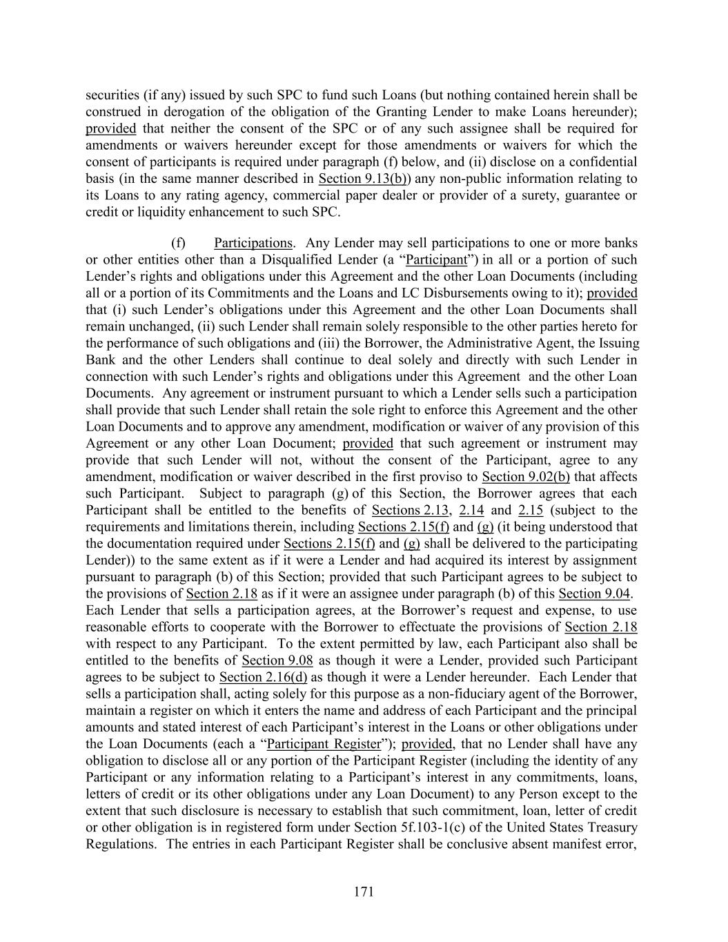 securities (if any) issued by such SPC to fund such Loans (but nothing contained herein shall be construed in derogation of the obligation of the Granting Lender to make Loans hereunder); provided that neither the consent of the SPC or of any such assignee shall be required for amendments or waivers hereunder except for those amendments or waivers for which the consent of participants is required under paragraph (f) below, and (ii) disclose on a confidential basis (in the same manner described in Section 9.13(b)) any non-public information relating to its Loans to any rating agency, commercial paper dealer or provider of a surety, guarantee or credit or liquidity enhancement to such SPC. (f) Participations. Any Lender may sell participations to one or more banks or other entities other than a Disqualified Lender (a “Participant”) in all or a portion of such Lender’s rights and obligations under this Agreement and the other Loan Documents (including all or a portion of its Commitments and the Loans and LC Disbursements owing to it); provided that (i) such Lender’s obligations under this Agreement and the other Loan Documents shall remain unchanged, (ii) such Lender shall remain solely responsible to the other parties hereto for the performance of such obligations and (iii) the Borrower, the Administrative Agent, the Issuing Bank and the other Lenders shall continue to deal solely and directly with such Lender in connection with such Lender’s rights and obligations under this Agreement and the other Loan Documents. Any agreement or instrument pursuant to which a Lender sells such a participation shall provide that such Lender shall retain the sole right to enforce this Agreement and the other Loan Documents and to approve any amendment, modification or waiver of any provision of this Agreement or any other Loan Document; provided that such agreement or instrument may provide that such Lender will not, without the consent of the Participant, agree to any amendment, modification or waiver described in the first proviso to Section 9.02(b) that affects such Participant. Subject to paragraph (g) of this Section, the Borrower agrees that each Participant shall be entitled to the benefits of Sections 2.13, 2.14 and 2.15 (subject to the requirements and limitations therein, including Sections 2.15(f) and (g) (it being understood that the documentation required under Sections 2.15(f) and (g) shall be delivered to the participating Lender)) to the same extent as if it were a Lender and had acquired its interest by assignment pursuant to paragraph (b) of this Section; provided that such Participant agrees to be subject to the provisions of Section 2.18 as if it were an assignee under paragraph (b) of this Section 9.04. Each Lender that sells a participation agrees, at the Borrower’s request and expense, to use reasonable efforts to cooperate with the Borrower to effectuate the provisions of Section 2.18 with respect to any Participant. To the extent permitted by law, each Participant also shall be entitled to the benefits of Section 9.08 as though it were a Lender, provided such Participant agrees to be subject to Section 2.16(d) as though it were a Lender hereunder. Each Lender that sells a participation shall, acting solely for this purpose as a non-fiduciary agent of the Borrower, maintain a register on which it enters the name and address of each Participant and the principal amounts and stated interest of each Participant’s interest in the Loans or other obligations under the Loan Documents (each a “Participant Register”); provided, that no Lender shall have any obligation to disclose all or any portion of the Participant Register (including the identity of any Participant or any information relating to a Participant’s interest in any commitments, loans, letters of credit or its other obligations under any Loan Document) to any Person except to the extent that such disclosure is necessary to establish that such commitment, loan, letter of credit or other obligation is in registered form under Section 5f.103-1(c) of the United States Treasury Regulations. The entries in each Participant Register shall be conclusive absent manifest error, 171