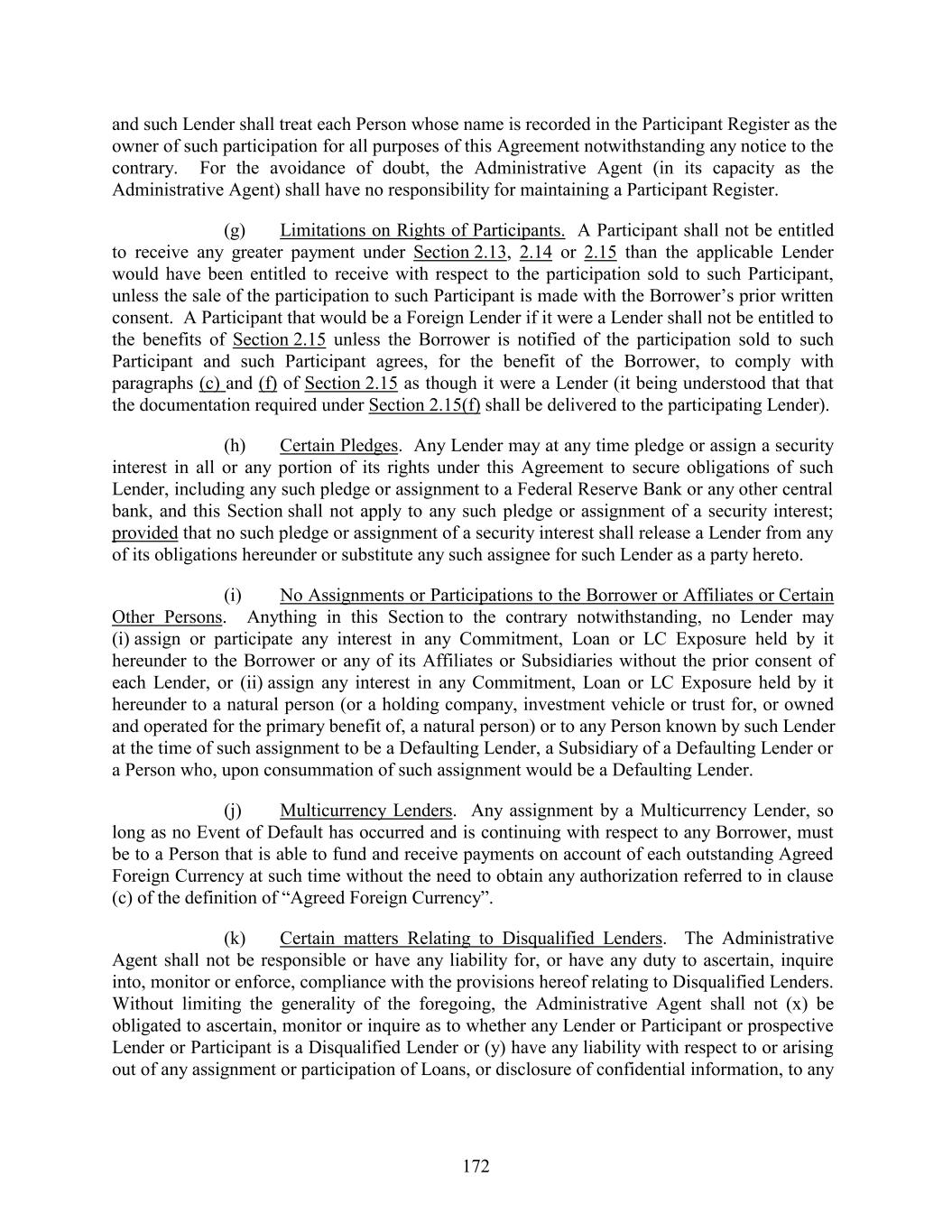 and such Lender shall treat each Person whose name is recorded in the Participant Register as the owner of such participation for all purposes of this Agreement notwithstanding any notice to the contrary. For the avoidance of doubt, the Administrative Agent (in its capacity as the Administrative Agent) shall have no responsibility for maintaining a Participant Register. (g) Limitations on Rights of Participants. A Participant shall not be entitled to receive any greater payment under Section 2.13, 2.14 or 2.15 than the applicable Lender would have been entitled to receive with respect to the participation sold to such Participant, unless the sale of the participation to such Participant is made with the Borrower’s prior written consent. A Participant that would be a Foreign Lender if it were a Lender shall not be entitled to the benefits of Section 2.15 unless the Borrower is notified of the participation sold to such Participant and such Participant agrees, for the benefit of the Borrower, to comply with paragraphs (c) and (f) of Section 2.15 as though it were a Lender (it being understood that that the documentation required under Section 2.15(f) shall be delivered to the participating Lender). (h) Certain Pledges. Any Lender may at any time pledge or assign a security interest in all or any portion of its rights under this Agreement to secure obligations of such Lender, including any such pledge or assignment to a Federal Reserve Bank or any other central bank, and this Section shall not apply to any such pledge or assignment of a security interest; provided that no such pledge or assignment of a security interest shall release a Lender from any of its obligations hereunder or substitute any such assignee for such Lender as a party hereto. (i) No Assignments or Participations to the Borrower or Affiliates or Certain Other Persons. Anything in this Section to the contrary notwithstanding, no Lender may (i) assign or participate any interest in any Commitment, Loan or LC Exposure held by it hereunder to the Borrower or any of its Affiliates or Subsidiaries without the prior consent of each Lender, or (ii) assign any interest in any Commitment, Loan or LC Exposure held by it hereunder to a natural person (or a holding company, investment vehicle or trust for, or owned and operated for the primary benefit of, a natural person) or to any Person known by such Lender at the time of such assignment to be a Defaulting Lender, a Subsidiary of a Defaulting Lender or a Person who, upon consummation of such assignment would be a Defaulting Lender. (j) Multicurrency Lenders. Any assignment by a Multicurrency Lender, so long as no Event of Default has occurred and is continuing with respect to any Borrower, must be to a Person that is able to fund and receive payments on account of each outstanding Agreed Foreign Currency at such time without the need to obtain any authorization referred to in clause (c) of the definition of “Agreed Foreign Currency”. (k) Certain matters Relating to Disqualified Lenders. The Administrative Agent shall not be responsible or have any liability for, or have any duty to ascertain, inquire into, monitor or enforce, compliance with the provisions hereof relating to Disqualified Lenders. Without limiting the generality of the foregoing, the Administrative Agent shall not (x) be obligated to ascertain, monitor or inquire as to whether any Lender or Participant or prospective Lender or Participant is a Disqualified Lender or (y) have any liability with respect to or arising out of any assignment or participation of Loans, or disclosure of confidential information, to any 172
