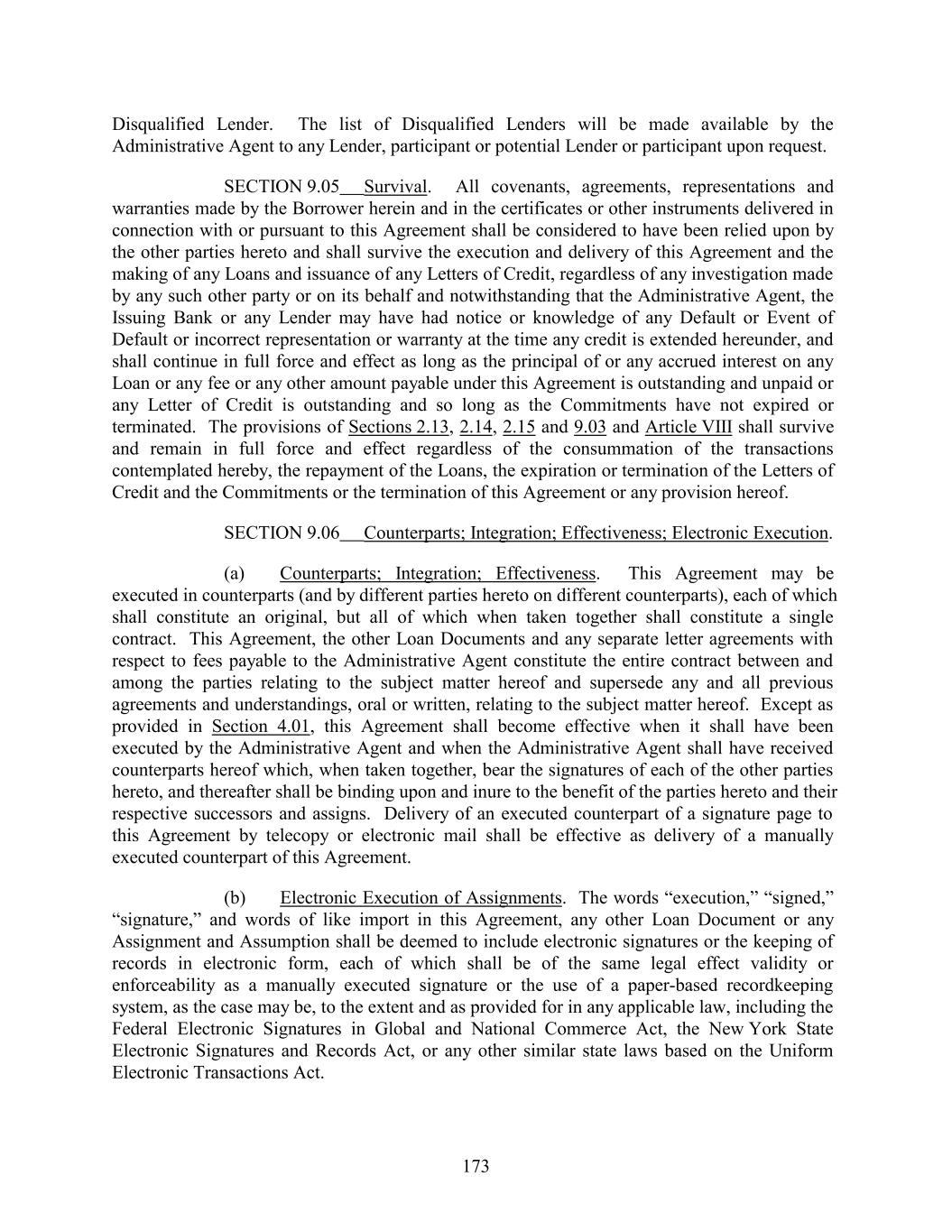 Disqualified Lender. The list of Disqualified Lenders will be made available by the Administrative Agent to any Lender, participant or potential Lender or participant upon request. SECTION 9.05 Survival. All covenants, agreements, representations and warranties made by the Borrower herein and in the certificates or other instruments delivered in connection with or pursuant to this Agreement shall be considered to have been relied upon by the other parties hereto and shall survive the execution and delivery of this Agreement and the making of any Loans and issuance of any Letters of Credit, regardless of any investigation made by any such other party or on its behalf and notwithstanding that the Administrative Agent, the Issuing Bank or any Lender may have had notice or knowledge of any Default or Event of Default or incorrect representation or warranty at the time any credit is extended hereunder, and shall continue in full force and effect as long as the principal of or any accrued interest on any Loan or any fee or any other amount payable under this Agreement is outstanding and unpaid or any Letter of Credit is outstanding and so long as the Commitments have not expired or terminated. The provisions of Sections 2.13, 2.14, 2.15 and 9.03 and Article VIII shall survive and remain in full force and effect regardless of the consummation of the transactions contemplated hereby, the repayment of the Loans, the expiration or termination of the Letters of Credit and the Commitments or the termination of this Agreement or any provision hereof. SECTION 9.06 Counterparts; Integration; Effectiveness; Electronic Execution. (a) Counterparts; Integration; Effectiveness. This Agreement may be executed in counterparts (and by different parties hereto on different counterparts), each of which shall constitute an original, but all of which when taken together shall constitute a single contract. This Agreement, the other Loan Documents and any separate letter agreements with respect to fees payable to the Administrative Agent constitute the entire contract between and among the parties relating to the subject matter hereof and supersede any and all previous agreements and understandings, oral or written, relating to the subject matter hereof. Except as provided in Section 4.01, this Agreement shall become effective when it shall have been executed by the Administrative Agent and when the Administrative Agent shall have received counterparts hereof which, when taken together, bear the signatures of each of the other parties hereto, and thereafter shall be binding upon and inure to the benefit of the parties hereto and their respective successors and assigns. Delivery of an executed counterpart of a signature page to this Agreement by telecopy or electronic mail shall be effective as delivery of a manually executed counterpart of this Agreement. (b) Electronic Execution of Assignments. The words “execution,” “signed,” “signature,” and words of like import in this Agreement, any other Loan Document or any Assignment and Assumption shall be deemed to include electronic signatures or the keeping of records in electronic form, each of which shall be of the same legal effect validity or enforceability as a manually executed signature or the use of a paper-based recordkeeping system, as the case may be, to the extent and as provided for in any applicable law, including the Federal Electronic Signatures in Global and National Commerce Act, the New York State Electronic Signatures and Records Act, or any other similar state laws based on the Uniform Electronic Transactions Act. 173