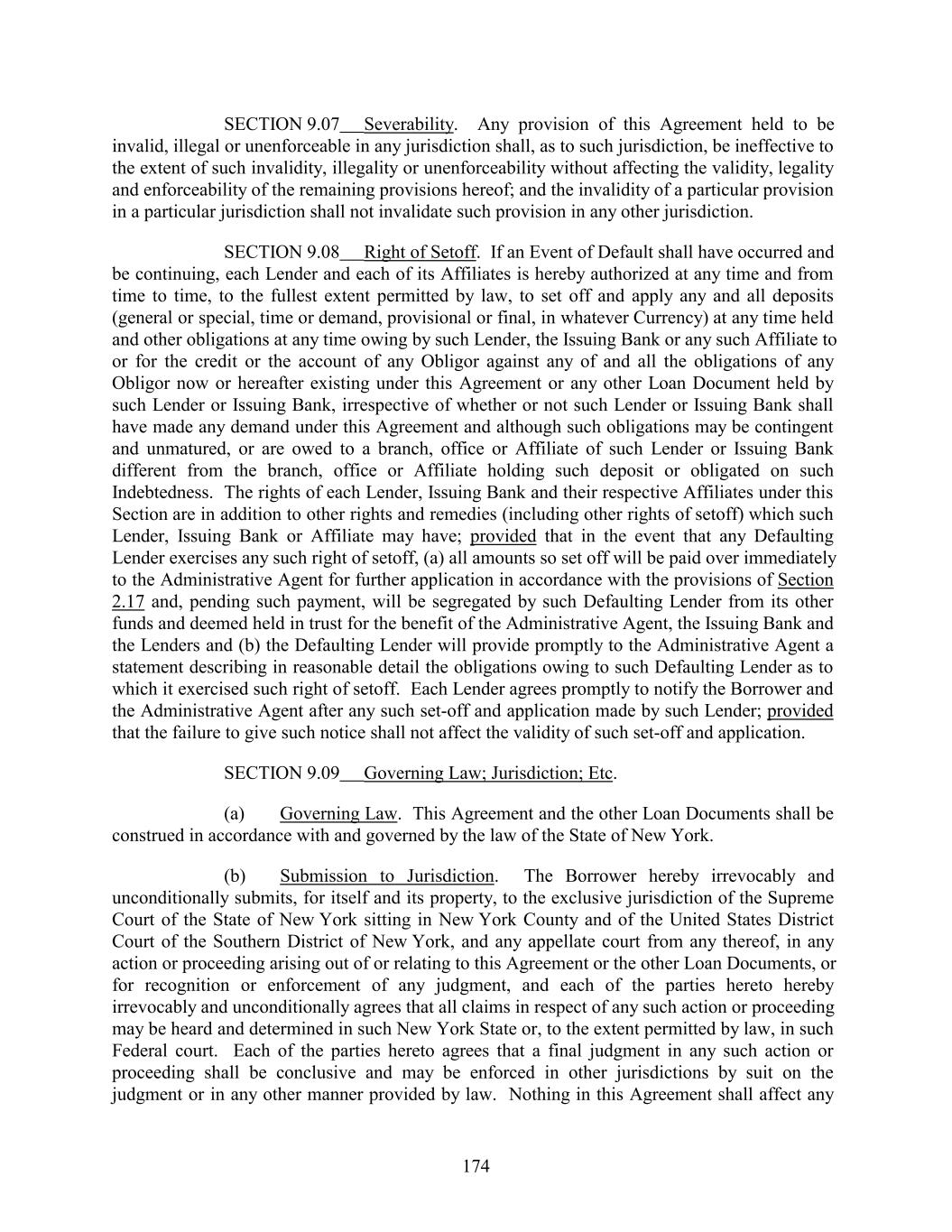 SECTION 9.07 Severability. Any provision of this Agreement held to be invalid, illegal or unenforceable in any jurisdiction shall, as to such jurisdiction, be ineffective to the extent of such invalidity, illegality or unenforceability without affecting the validity, legality and enforceability of the remaining provisions hereof; and the invalidity of a particular provision in a particular jurisdiction shall not invalidate such provision in any other jurisdiction. SECTION 9.08 Right of Setoff. If an Event of Default shall have occurred and be continuing, each Lender and each of its Affiliates is hereby authorized at any time and from time to time, to the fullest extent permitted by law, to set off and apply any and all deposits (general or special, time or demand, provisional or final, in whatever Currency) at any time held and other obligations at any time owing by such Lender, the Issuing Bank or any such Affiliate to or for the credit or the account of any Obligor against any of and all the obligations of any Obligor now or hereafter existing under this Agreement or any other Loan Document held by such Lender or Issuing Bank, irrespective of whether or not such Lender or Issuing Bank shall have made any demand under this Agreement and although such obligations may be contingent and unmatured, or are owed to a branch, office or Affiliate of such Lender or Issuing Bank different from the branch, office or Affiliate holding such deposit or obligated on such Indebtedness. The rights of each Lender, Issuing Bank and their respective Affiliates under this Section are in addition to other rights and remedies (including other rights of setoff) which such Lender, Issuing Bank or Affiliate may have; provided that in the event that any Defaulting Lender exercises any such right of setoff, (a) all amounts so set off will be paid over immediately to the Administrative Agent for further application in accordance with the provisions of Section 2.17 and, pending such payment, will be segregated by such Defaulting Lender from its other funds and deemed held in trust for the benefit of the Administrative Agent, the Issuing Bank and the Lenders and (b) the Defaulting Lender will provide promptly to the Administrative Agent a statement describing in reasonable detail the obligations owing to such Defaulting Lender as to which it exercised such right of setoff. Each Lender agrees promptly to notify the Borrower and the Administrative Agent after any such set-off and application made by such Lender; provided that the failure to give such notice shall not affect the validity of such set-off and application. SECTION 9.09 Governing Law; Jurisdiction; Etc. (a) Governing Law. This Agreement and the other Loan Documents shall be construed in accordance with and governed by the law of the State of New York. (b) Submission to Jurisdiction. The Borrower hereby irrevocably and unconditionally submits, for itself and its property, to the exclusive jurisdiction of the Supreme Court of the State of New York sitting in New York County and of the United States District Court of the Southern District of New York, and any appellate court from any thereof, in any action or proceeding arising out of or relating to this Agreement or the other Loan Documents, or for recognition or enforcement of any judgment, and each of the parties hereto hereby irrevocably and unconditionally agrees that all claims in respect of any such action or proceeding may be heard and determined in such New York State or, to the extent permitted by law, in such Federal court. Each of the parties hereto agrees that a final judgment in any such action or proceeding shall be conclusive and may be enforced in other jurisdictions by suit on the judgment or in any other manner provided by law. Nothing in this Agreement shall affect any 174