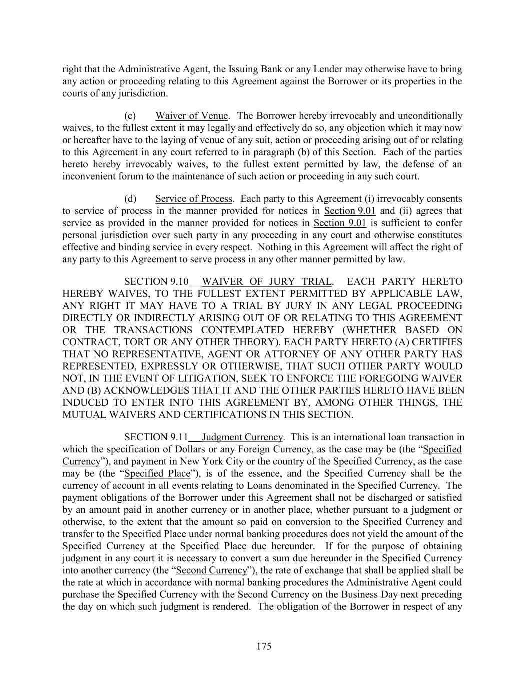 right that the Administrative Agent, the Issuing Bank or any Lender may otherwise have to bring any action or proceeding relating to this Agreement against the Borrower or its properties in the courts of any jurisdiction. (c) Waiver of Venue. The Borrower hereby irrevocably and unconditionally waives, to the fullest extent it may legally and effectively do so, any objection which it may now or hereafter have to the laying of venue of any suit, action or proceeding arising out of or relating to this Agreement in any court referred to in paragraph (b) of this Section. Each of the parties hereto hereby irrevocably waives, to the fullest extent permitted by law, the defense of an inconvenient forum to the maintenance of such action or proceeding in any such court. (d) Service of Process. Each party to this Agreement (i) irrevocably consents to service of process in the manner provided for notices in Section 9.01 and (ii) agrees that service as provided in the manner provided for notices in Section 9.01 is sufficient to confer personal jurisdiction over such party in any proceeding in any court and otherwise constitutes effective and binding service in every respect. Nothing in this Agreement will affect the right of any party to this Agreement to serve process in any other manner permitted by law. SECTION 9.10 WAIVER OF JURY TRIAL. EACH PARTY HERETO HEREBY WAIVES, TO THE FULLEST EXTENT PERMITTED BY APPLICABLE LAW, ANY RIGHT IT MAY HAVE TO A TRIAL BY JURY IN ANY LEGAL PROCEEDING DIRECTLY OR INDIRECTLY ARISING OUT OF OR RELATING TO THIS AGREEMENT OR THE TRANSACTIONS CONTEMPLATED HEREBY (WHETHER BASED ON CONTRACT, TORT OR ANY OTHER THEORY). EACH PARTY HERETO (A) CERTIFIES THAT NO REPRESENTATIVE, AGENT OR ATTORNEY OF ANY OTHER PARTY HAS REPRESENTED, EXPRESSLY OR OTHERWISE, THAT SUCH OTHER PARTY WOULD NOT, IN THE EVENT OF LITIGATION, SEEK TO ENFORCE THE FOREGOING WAIVER AND (B) ACKNOWLEDGES THAT IT AND THE OTHER PARTIES HERETO HAVE BEEN INDUCED TO ENTER INTO THIS AGREEMENT BY, AMONG OTHER THINGS, THE MUTUAL WAIVERS AND CERTIFICATIONS IN THIS SECTION. SECTION 9.11 Judgment Currency. This is an international loan transaction in which the specification of Dollars or any Foreign Currency, as the case may be (the “Specified Currency”), and payment in New York City or the country of the Specified Currency, as the case may be (the “Specified Place”), is of the essence, and the Specified Currency shall be the currency of account in all events relating to Loans denominated in the Specified Currency. The payment obligations of the Borrower under this Agreement shall not be discharged or satisfied by an amount paid in another currency or in another place, whether pursuant to a judgment or otherwise, to the extent that the amount so paid on conversion to the Specified Currency and transfer to the Specified Place under normal banking procedures does not yield the amount of the Specified Currency at the Specified Place due hereunder. If for the purpose of obtaining judgment in any court it is necessary to convert a sum due hereunder in the Specified Currency into another currency (the “Second Currency”), the rate of exchange that shall be applied shall be the rate at which in accordance with normal banking procedures the Administrative Agent could purchase the Specified Currency with the Second Currency on the Business Day next preceding the day on which such judgment is rendered. The obligation of the Borrower in respect of any 175