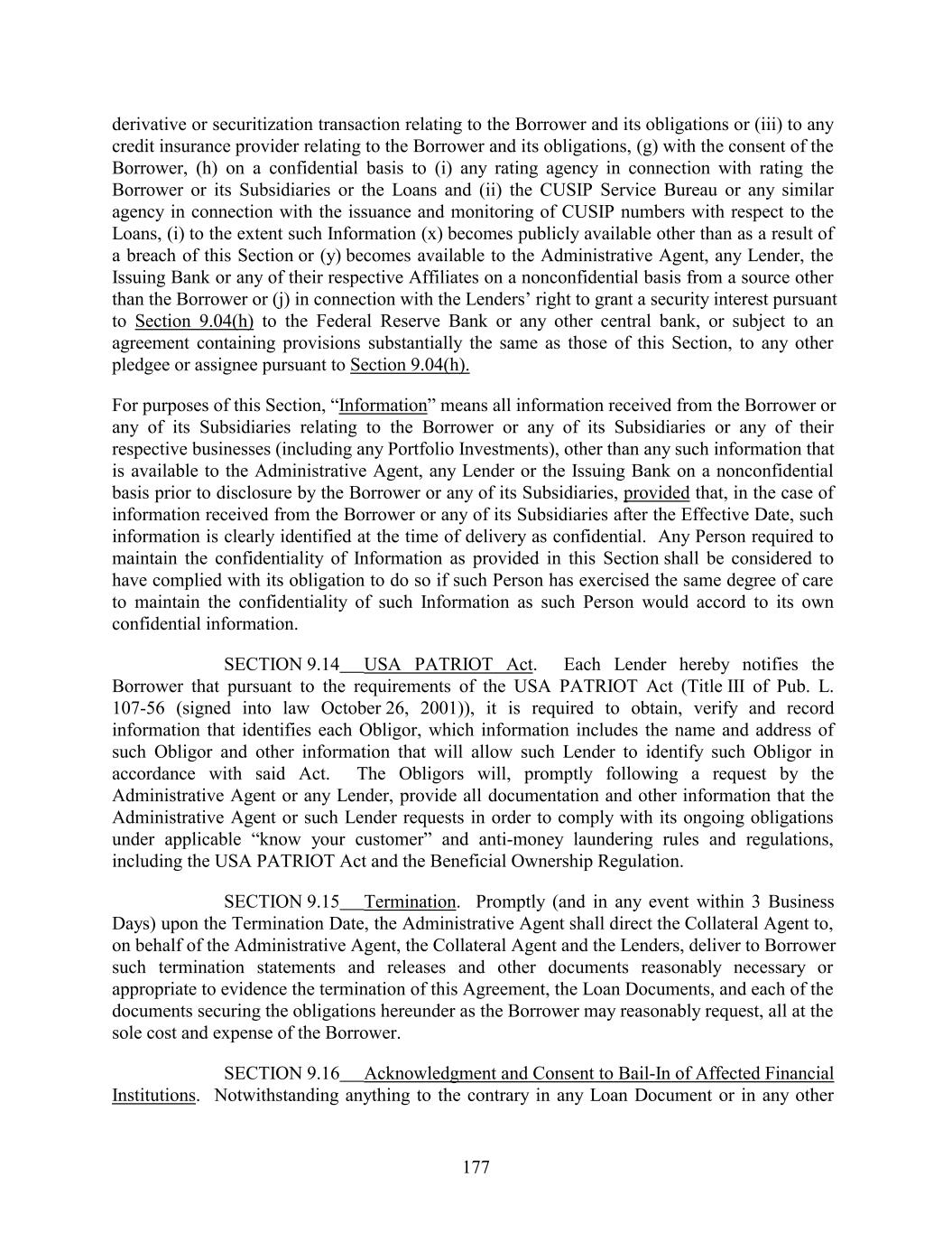 derivative or securitization transaction relating to the Borrower and its obligations or (iii) to any credit insurance provider relating to the Borrower and its obligations, (g) with the consent of the Borrower, (h) on a confidential basis to (i) any rating agency in connection with rating the Borrower or its Subsidiaries or the Loans and (ii) the CUSIP Service Bureau or any similar agency in connection with the issuance and monitoring of CUSIP numbers with respect to the Loans, (i) to the extent such Information (x) becomes publicly available other than as a result of a breach of this Section or (y) becomes available to the Administrative Agent, any Lender, the Issuing Bank or any of their respective Affiliates on a nonconfidential basis from a source other than the Borrower or (j) in connection with the Lenders’ right to grant a security interest pursuant to Section 9.04(h) to the Federal Reserve Bank or any other central bank, or subject to an agreement containing provisions substantially the same as those of this Section, to any other pledgee or assignee pursuant to Section 9.04(h). For purposes of this Section, “Information” means all information received from the Borrower or any of its Subsidiaries relating to the Borrower or any of its Subsidiaries or any of their respective businesses (including any Portfolio Investments), other than any such information that is available to the Administrative Agent, any Lender or the Issuing Bank on a nonconfidential basis prior to disclosure by the Borrower or any of its Subsidiaries, provided that, in the case of information received from the Borrower or any of its Subsidiaries after the Effective Date, such information is clearly identified at the time of delivery as confidential. Any Person required to maintain the confidentiality of Information as provided in this Section shall be considered to have complied with its obligation to do so if such Person has exercised the same degree of care to maintain the confidentiality of such Information as such Person would accord to its own confidential information. SECTION 9.14 USA PATRIOT Act. Each Lender hereby notifies the Borrower that pursuant to the requirements of the USA PATRIOT Act (Title III of Pub. L. 107-56 (signed into law October 26, 2001)), it is required to obtain, verify and record information that identifies each Obligor, which information includes the name and address of such Obligor and other information that will allow such Lender to identify such Obligor in accordance with said Act. The Obligors will, promptly following a request by the Administrative Agent or any Lender, provide all documentation and other information that the Administrative Agent or such Lender requests in order to comply with its ongoing obligations under applicable “know your customer” and anti-money laundering rules and regulations, including the USA PATRIOT Act and the Beneficial Ownership Regulation. SECTION 9.15 Termination. Promptly (and in any event within 3 Business Days) upon the Termination Date, the Administrative Agent shall direct the Collateral Agent to, on behalf of the Administrative Agent, the Collateral Agent and the Lenders, deliver to Borrower such termination statements and releases and other documents reasonably necessary or appropriate to evidence the termination of this Agreement, the Loan Documents, and each of the documents securing the obligations hereunder as the Borrower may reasonably request, all at the sole cost and expense of the Borrower. SECTION 9.16 Acknowledgment and Consent to Bail-In of Affected Financial Institutions. Notwithstanding anything to the contrary in any Loan Document or in any other 177