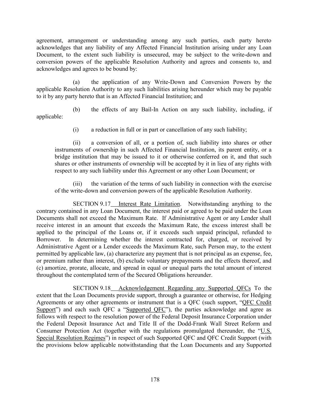 agreement, arrangement or understanding among any such parties, each party hereto acknowledges that any liability of any Affected Financial Institution arising under any Loan Document, to the extent such liability is unsecured, may be subject to the write-down and conversion powers of the applicable Resolution Authority and agrees and consents to, and acknowledges and agrees to be bound by: (a) the application of any Write-Down and Conversion Powers by the applicable Resolution Authority to any such liabilities arising hereunder which may be payable to it by any party hereto that is an Affected Financial Institution; and (b) the effects of any Bail-In Action on any such liability, including, if applicable: (i) a reduction in full or in part or cancellation of any such liability; (ii) a conversion of all, or a portion of, such liability into shares or other instruments of ownership in such Affected Financial Institution, its parent entity, or a bridge institution that may be issued to it or otherwise conferred on it, and that such shares or other instruments of ownership will be accepted by it in lieu of any rights with respect to any such liability under this Agreement or any other Loan Document; or (iii) the variation of the terms of such liability in connection with the exercise of the write-down and conversion powers of the applicable Resolution Authority. SECTION 9.17 Interest Rate Limitation. Notwithstanding anything to the contrary contained in any Loan Document, the interest paid or agreed to be paid under the Loan Documents shall not exceed the Maximum Rate. If Administrative Agent or any Lender shall receive interest in an amount that exceeds the Maximum Rate, the excess interest shall be applied to the principal of the Loans or, if it exceeds such unpaid principal, refunded to Borrower. In determining whether the interest contracted for, charged, or received by Administrative Agent or a Lender exceeds the Maximum Rate, such Person may, to the extent permitted by applicable law, (a) characterize any payment that is not principal as an expense, fee, or premium rather than interest, (b) exclude voluntary prepayments and the effects thereof, and (c) amortize, prorate, allocate, and spread in equal or unequal parts the total amount of interest throughout the contemplated term of the Secured Obligations hereunder. SECTION 9.18 Acknowledgement Regarding any Supported QFCs To the extent that the Loan Documents provide support, through a guarantee or otherwise, for Hedging Agreements or any other agreements or instrument that is a QFC (such support, “QFC Credit Support”) and each such QFC a “Supported QFC”), the parties acknowledge and agree as follows with respect to the resolution power of the Federal Deposit Insurance Corporation under the Federal Deposit Insurance Act and Title II of the Dodd-Frank Wall Street Reform and Consumer Protection Act (together with the regulations promulgated thereunder, the “U.S. Special Resolution Regimes”) in respect of such Supported QFC and QFC Credit Support (with the provisions below applicable notwithstanding that the Loan Documents and any Supported 178