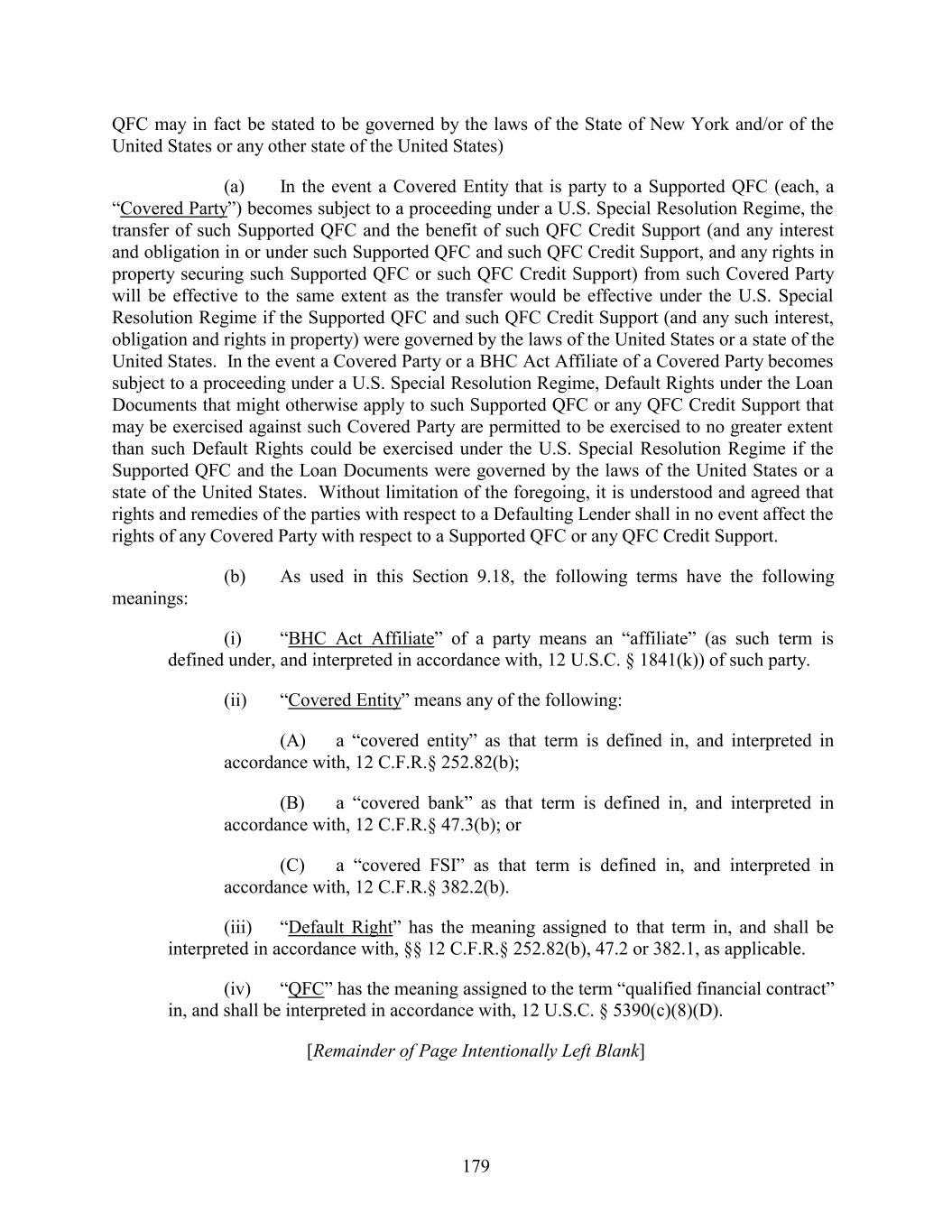QFC may in fact be stated to be governed by the laws of the State of New York and/or of the United States or any other state of the United States) (a) In the event a Covered Entity that is party to a Supported QFC (each, a “Covered Party”) becomes subject to a proceeding under a U.S. Special Resolution Regime, the transfer of such Supported QFC and the benefit of such QFC Credit Support (and any interest and obligation in or under such Supported QFC and such QFC Credit Support, and any rights in property securing such Supported QFC or such QFC Credit Support) from such Covered Party will be effective to the same extent as the transfer would be effective under the U.S. Special Resolution Regime if the Supported QFC and such QFC Credit Support (and any such interest, obligation and rights in property) were governed by the laws of the United States or a state of the United States. In the event a Covered Party or a BHC Act Affiliate of a Covered Party becomes subject to a proceeding under a U.S. Special Resolution Regime, Default Rights under the Loan Documents that might otherwise apply to such Supported QFC or any QFC Credit Support that may be exercised against such Covered Party are permitted to be exercised to no greater extent than such Default Rights could be exercised under the U.S. Special Resolution Regime if the Supported QFC and the Loan Documents were governed by the laws of the United States or a state of the United States. Without limitation of the foregoing, it is understood and agreed that rights and remedies of the parties with respect to a Defaulting Lender shall in no event affect the rights of any Covered Party with respect to a Supported QFC or any QFC Credit Support. (b) As used in this Section 9.18, the following terms have the following meanings: (i) “BHC Act Affiliate” of a party means an “affiliate” (as such term is defined under, and interpreted in accordance with, 12 U.S.C. § 1841(k)) of such party. (ii) “Covered Entity” means any of the following: (A) a “covered entity” as that term is defined in, and interpreted in accordance with, 12 C.F.R.§ 252.82(b); (B) a “covered bank” as that term is defined in, and interpreted in accordance with, 12 C.F.R.§ 47.3(b); or (C) a “covered FSI” as that term is defined in, and interpreted in accordance with, 12 C.F.R.§ 382.2(b). (iii) “Default Right” has the meaning assigned to that term in, and shall be interpreted in accordance with, §§ 12 C.F.R.§ 252.82(b), 47.2 or 382.1, as applicable. (iv) “QFC” has the meaning assigned to the term “qualified financial contract” in, and shall be interpreted in accordance with, 12 U.S.C. § 5390(c)(8)(D). [Remainder of Page Intentionally Left Blank] 179