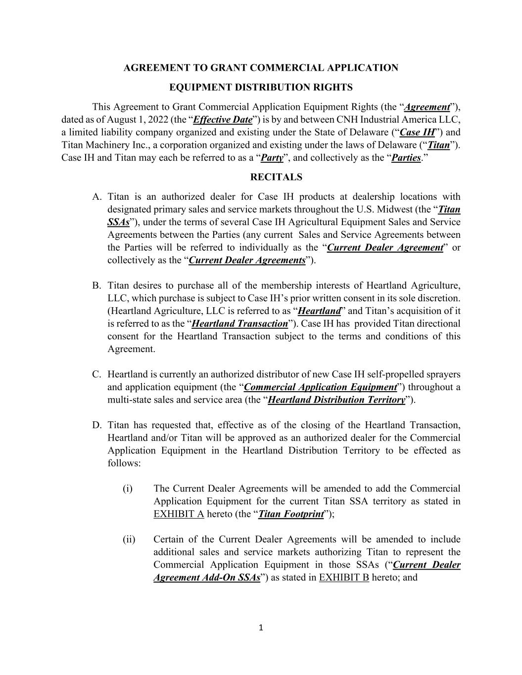 1    AGREEMENT TO GRANT COMMERCIAL APPLICATION EQUIPMENT DISTRIBUTION RIGHTS This Agreement to Grant Commercial Application Equipment Rights (the “Agreement”), dated as of August 1, 2022 (the “Effective Date”) is by and between CNH Industrial America LLC, a limited liability company organized and existing under the State of Delaware (“Case IH”) and Titan Machinery Inc., a corporation organized and existing under the laws of Delaware (“Titan”). Case IH and Titan may each be referred to as a “Party”, and collectively as the “Parties.” RECITALS A. Titan is an authorized dealer for Case IH products at dealership locations with designated primary sales and service markets throughout the U.S. Midwest (the “Titan SSAs”), under the terms of several Case IH Agricultural Equipment Sales and Service Agreements between the Parties (any current Sales and Service Agreements between the Parties will be referred to individually as the “Current Dealer Agreement” or collectively as the “Current Dealer Agreements”). B. Titan desires to purchase all of the membership interests of Heartland Agriculture, LLC, which purchase is subject to Case IH’s prior written consent in its sole discretion. (Heartland Agriculture, LLC is referred to as “Heartland” and Titan’s acquisition of it is referred to as the “Heartland Transaction”). Case IH has provided Titan directional consent for the Heartland Transaction subject to the terms and conditions of this Agreement. C. Heartland is currently an authorized distributor of new Case IH self-propelled sprayers and application equipment (the “Commercial Application Equipment”) throughout a multi-state sales and service area (the “Heartland Distribution Territory”). D. Titan has requested that, effective as of the closing of the Heartland Transaction, Heartland and/or Titan will be approved as an authorized dealer for the Commercial Application Equipment in the Heartland Distribution Territory to be effected as follows: (i) The Current Dealer Agreements will be amended to add the Commercial Application Equipment for the current Titan SSA territory as stated in EXHIBIT A hereto (the “Titan Footprint”); (ii) Certain of the Current Dealer Agreements will be amended to include additional sales and service markets authorizing Titan to represent the Commercial Application Equipment in those SSAs (“Current Dealer Agreement Add-On SSAs”) as stated in EXHIBIT B hereto; and