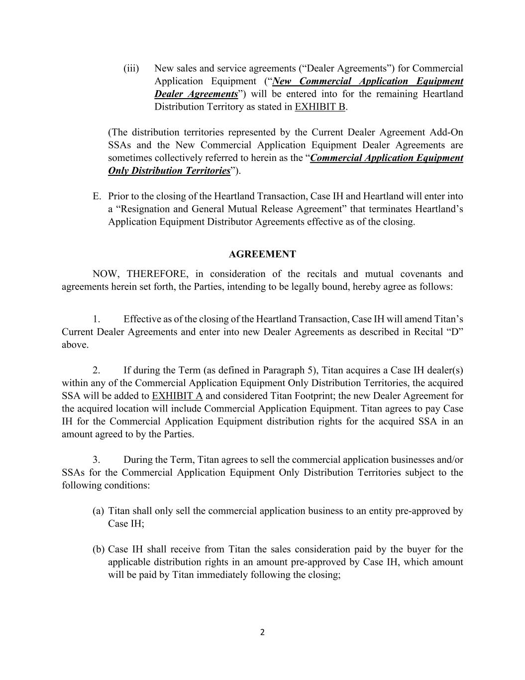2    (iii) New sales and service agreements (“Dealer Agreements”) for Commercial Application Equipment (“New Commercial Application Equipment Dealer Agreements”) will be entered into for the remaining Heartland Distribution Territory as stated in EXHIBIT B. (The distribution territories represented by the Current Dealer Agreement Add-On SSAs and the New Commercial Application Equipment Dealer Agreements are sometimes collectively referred to herein as the “Commercial Application Equipment Only Distribution Territories”). E. Prior to the closing of the Heartland Transaction, Case IH and Heartland will enter into a “Resignation and General Mutual Release Agreement” that terminates Heartland’s Application Equipment Distributor Agreements effective as of the closing. AGREEMENT NOW, THEREFORE, in consideration of the recitals and mutual covenants and agreements herein set forth, the Parties, intending to be legally bound, hereby agree as follows: 1. Effective as of the closing of the Heartland Transaction, Case IH will amend Titan’s Current Dealer Agreements and enter into new Dealer Agreements as described in Recital “D” above. 2. If during the Term (as defined in Paragraph 5), Titan acquires a Case IH dealer(s) within any of the Commercial Application Equipment Only Distribution Territories, the acquired SSA will be added to EXHIBIT A and considered Titan Footprint; the new Dealer Agreement for the acquired location will include Commercial Application Equipment. Titan agrees to pay Case IH for the Commercial Application Equipment distribution rights for the acquired SSA in an amount agreed to by the Parties. 3. During the Term, Titan agrees to sell the commercial application businesses and/or SSAs for the Commercial Application Equipment Only Distribution Territories subject to the following conditions: (a) Titan shall only sell the commercial application business to an entity pre-approved by Case IH; (b) Case IH shall receive from Titan the sales consideration paid by the buyer for the applicable distribution rights in an amount pre-approved by Case IH, which amount will be paid by Titan immediately following the closing;