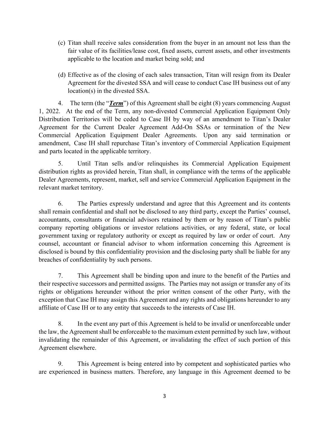3    (c) Titan shall receive sales consideration from the buyer in an amount not less than the fair value of its facilities/lease cost, fixed assets, current assets, and other investments applicable to the location and market being sold; and (d) Effective as of the closing of each sales transaction, Titan will resign from its Dealer Agreement for the divested SSA and will cease to conduct Case IH business out of any location(s) in the divested SSA. 4. The term (the “Term”) of this Agreement shall be eight (8) years commencing August 1, 2022. At the end of the Term, any non-divested Commercial Application Equipment Only Distribution Territories will be ceded to Case IH by way of an amendment to Titan’s Dealer Agreement for the Current Dealer Agreement Add-On SSAs or termination of the New Commercial Application Equipment Dealer Agreements. Upon any said termination or amendment, Case IH shall repurchase Titan’s inventory of Commercial Application Equipment and parts located in the applicable territory. 5. Until Titan sells and/or relinquishes its Commercial Application Equipment distribution rights as provided herein, Titan shall, in compliance with the terms of the applicable Dealer Agreements, represent, market, sell and service Commercial Application Equipment in the relevant market territory. 6. The Parties expressly understand and agree that this Agreement and its contents shall remain confidential and shall not be disclosed to any third party, except the Parties’ counsel, accountants, consultants or financial advisors retained by them or by reason of Titan’s public company reporting obligations or investor relations activities, or any federal, state, or local government taxing or regulatory authority or except as required by law or order of court. Any counsel, accountant or financial advisor to whom information concerning this Agreement is disclosed is bound by this confidentiality provision and the disclosing party shall be liable for any breaches of confidentiality by such persons. 7. This Agreement shall be binding upon and inure to the benefit of the Parties and their respective successors and permitted assigns. The Parties may not assign or transfer any of its rights or obligations hereunder without the prior written consent of the other Party, with the exception that Case IH may assign this Agreement and any rights and obligations hereunder to any affiliate of Case IH or to any entity that succeeds to the interests of Case IH. 8. In the event any part of this Agreement is held to be invalid or unenforceable under the law, the Agreement shall be enforceable to the maximum extent permitted by such law, without invalidating the remainder of this Agreement, or invalidating the effect of such portion of this Agreement elsewhere. 9. This Agreement is being entered into by competent and sophisticated parties who are experienced in business matters. Therefore, any language in this Agreement deemed to be